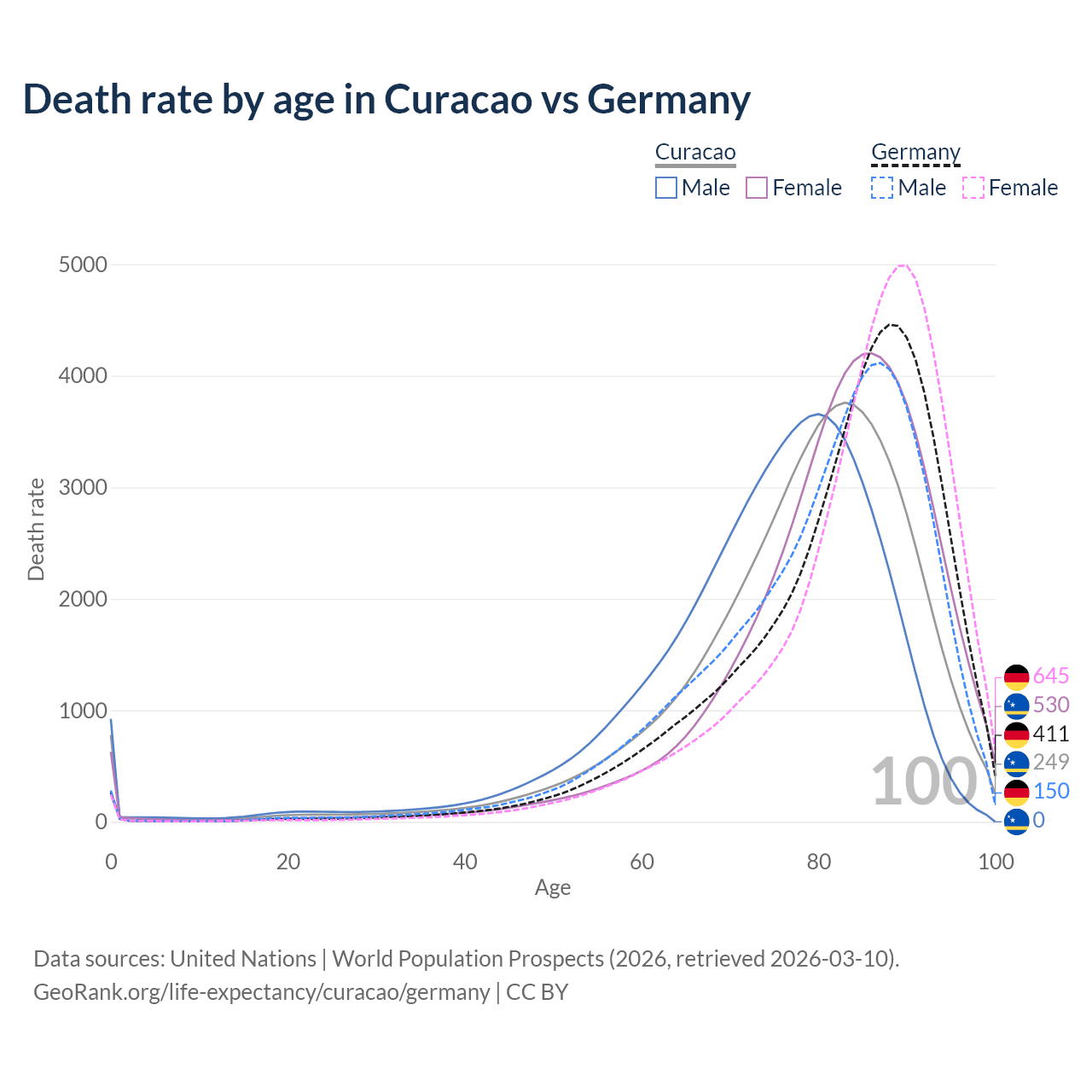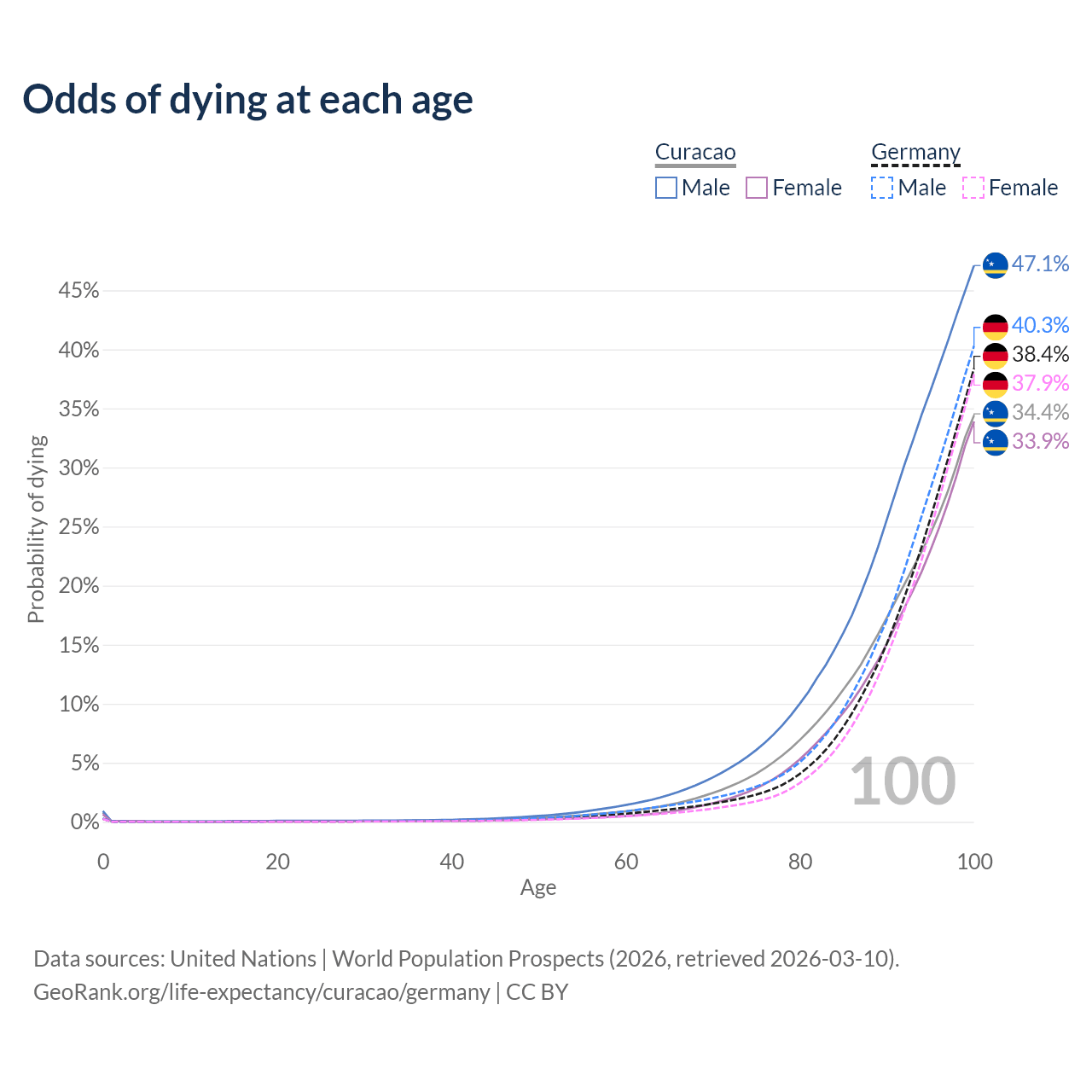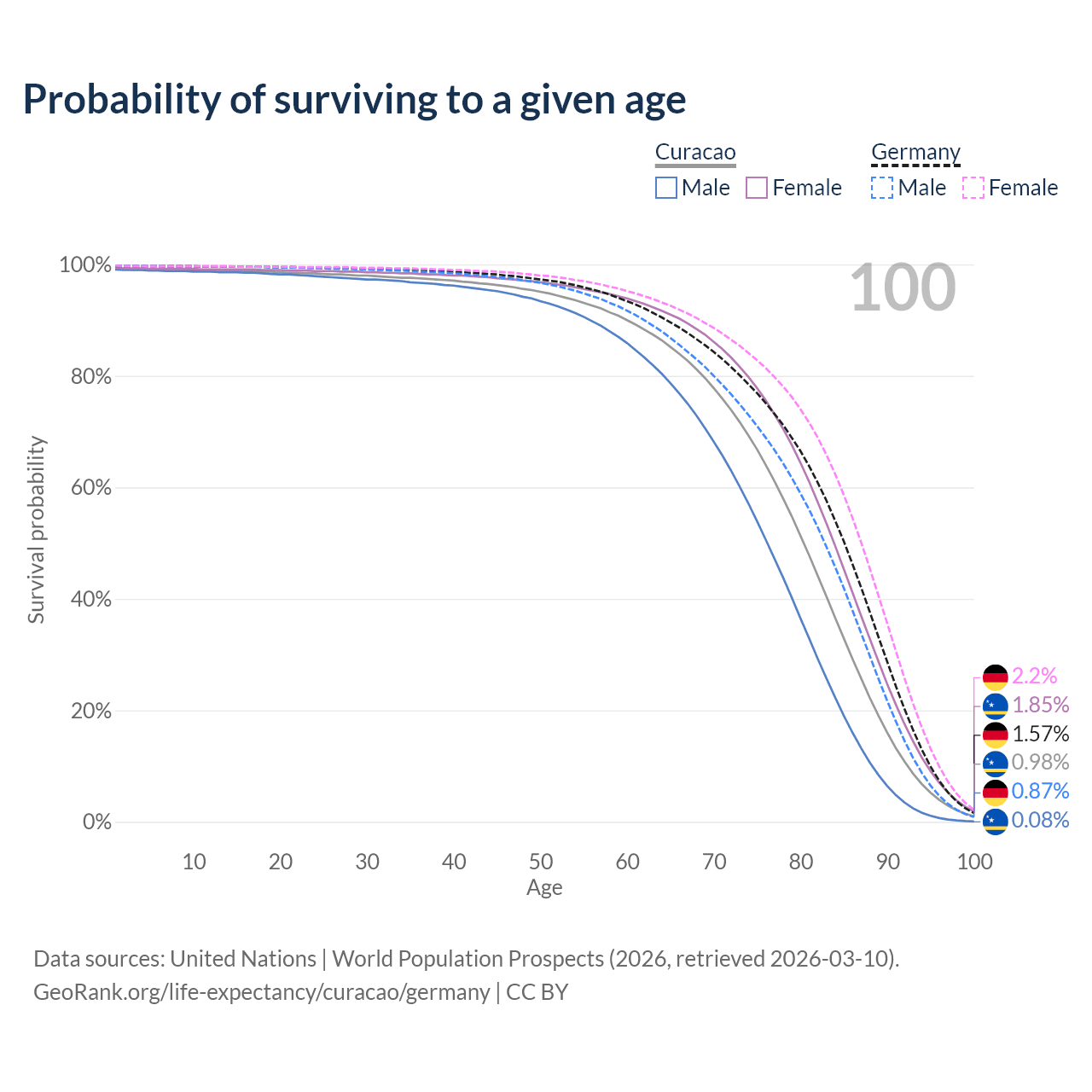 This life expectancy calculator shows the odds of living to 100, 95, 90, and below based on current age for both males and females in Curacao and Germany, along with mean and median age of death. The calculations are based on the 2026 life tables (actuarial tables) from the UN World Population Prospects.