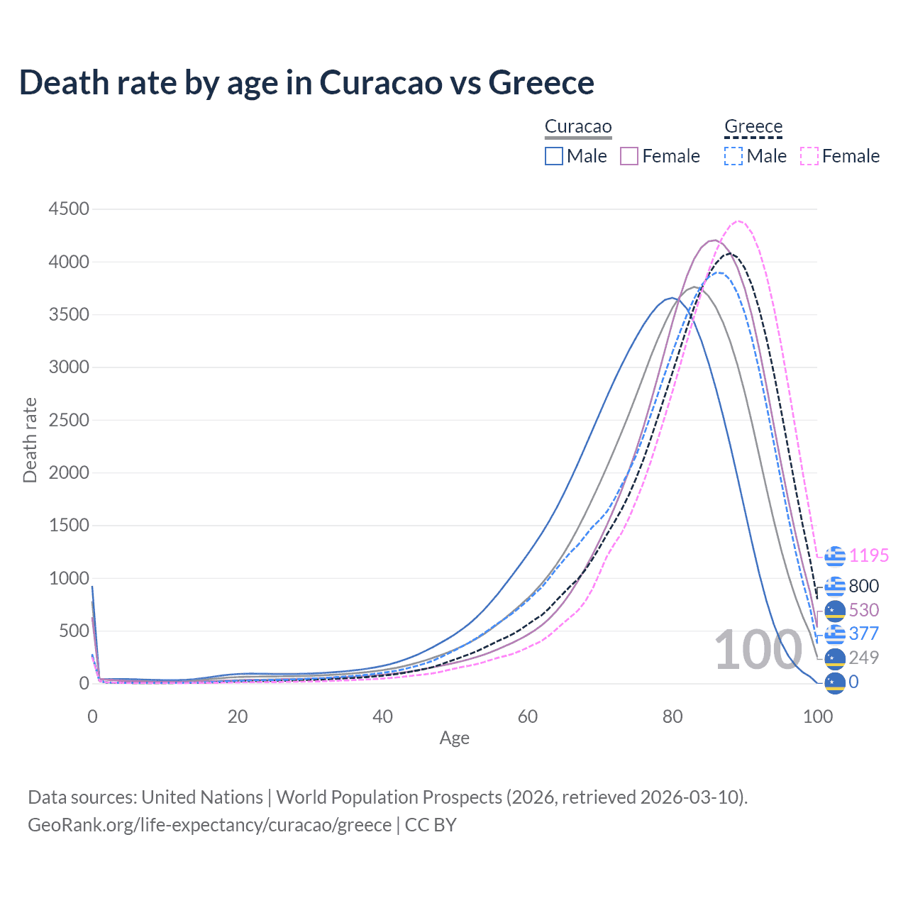 In Curacao, the most common age of death is 83, compared to 88 in Greece. The median age of death is 80.4 in Curacao and 84.9 in Greece, meaning only half of each cohort is expected to live past that age.