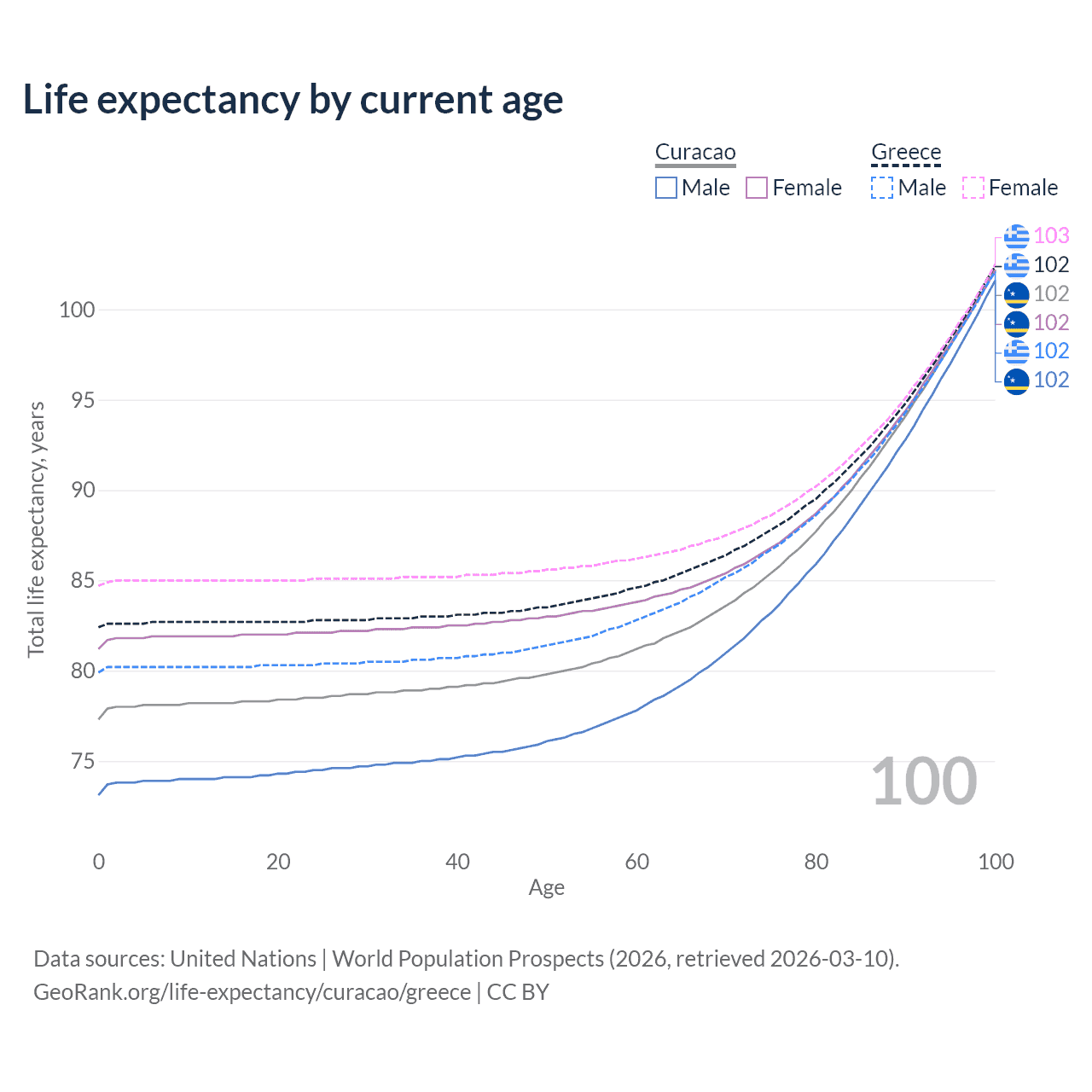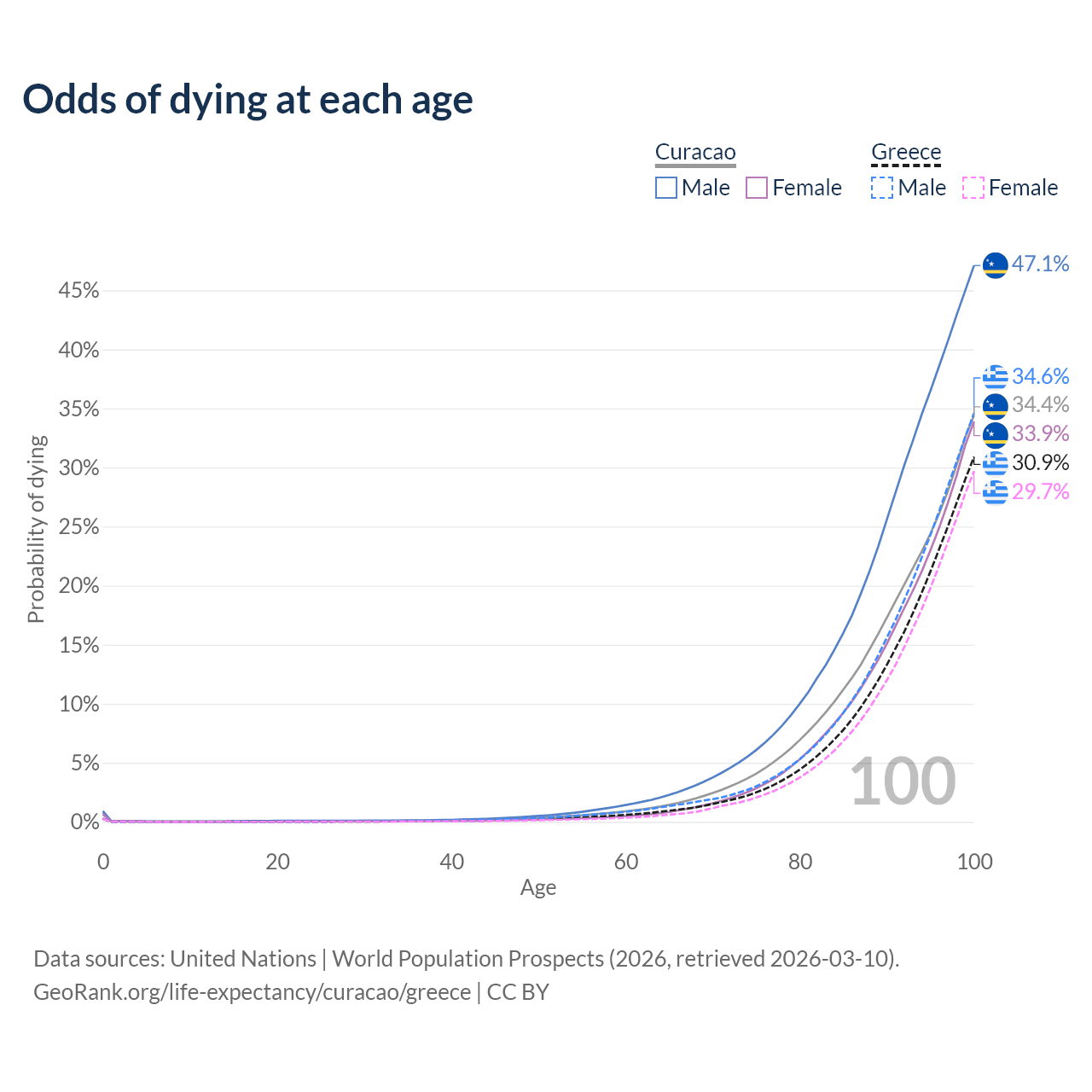 This life expectancy calculator shows the odds of living to 100, 95, 90, and below based on current age for both males and females in Curacao and Greece, along with mean and median age of death. The calculations are based on the 2026 life tables (actuarial tables) from the UN World Population Prospects.