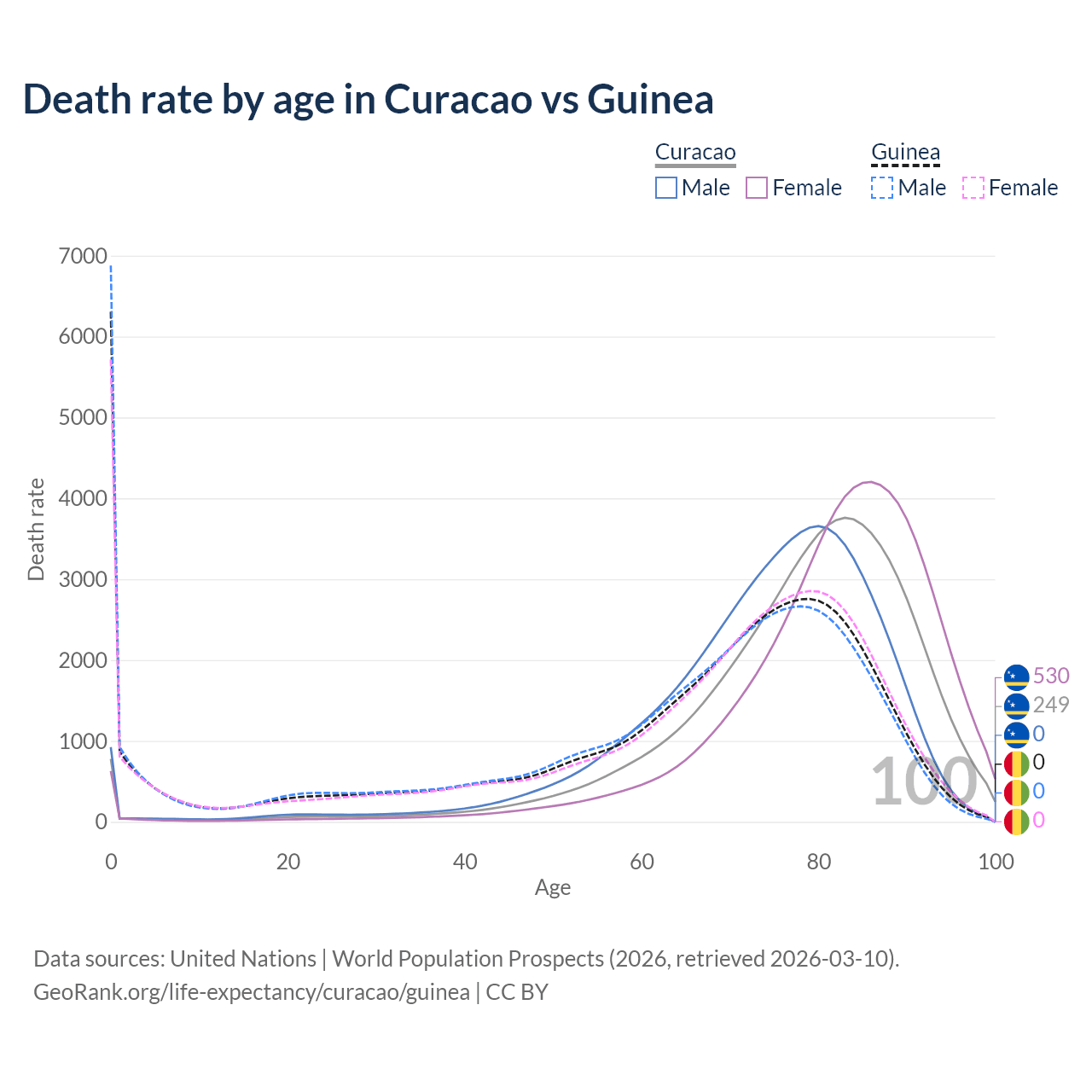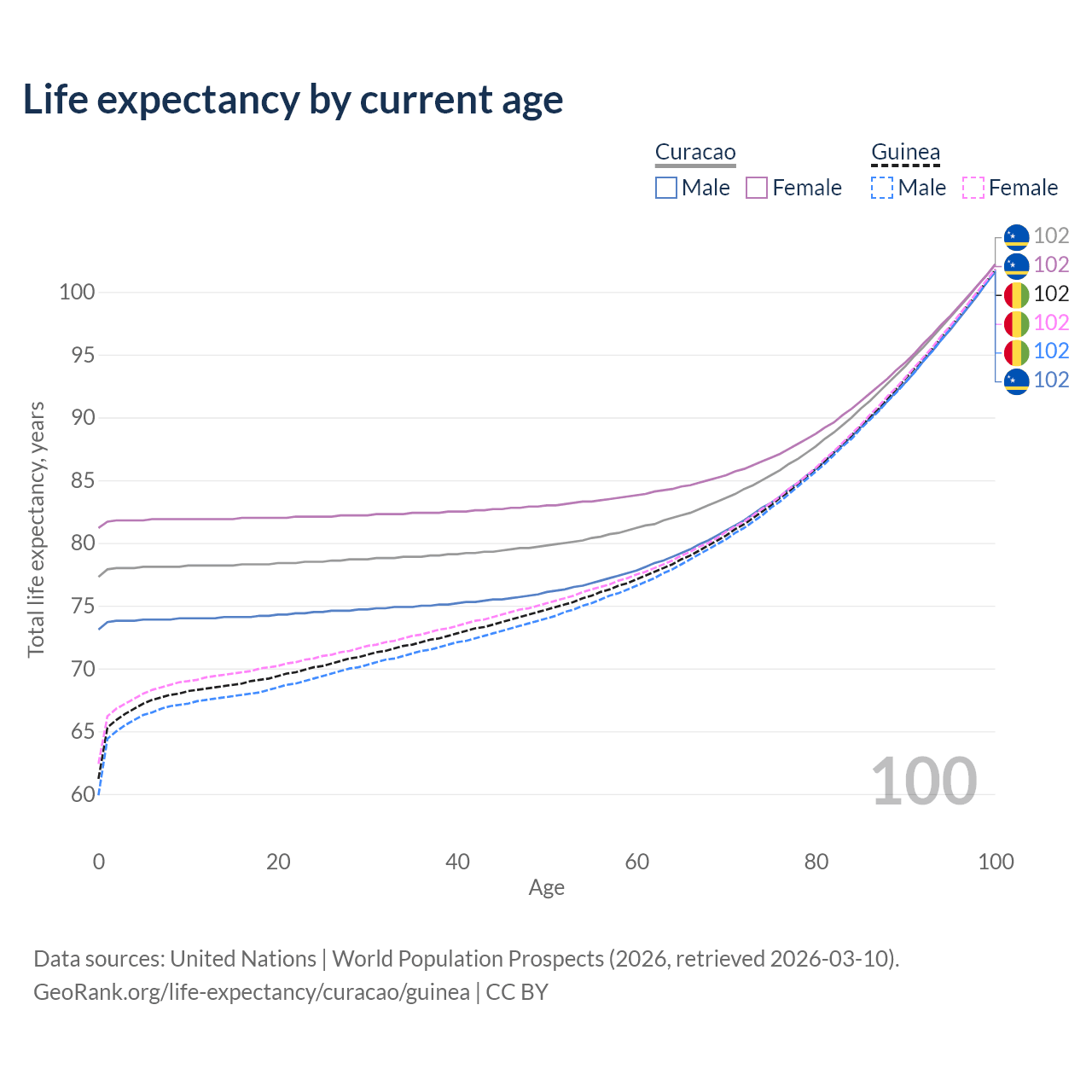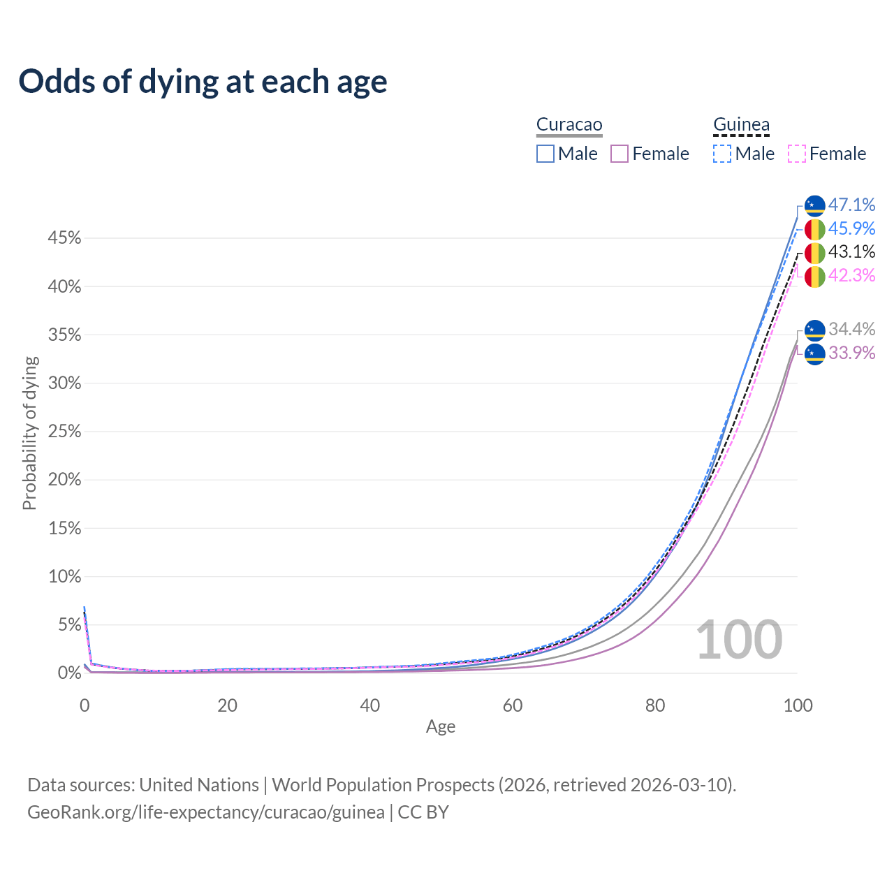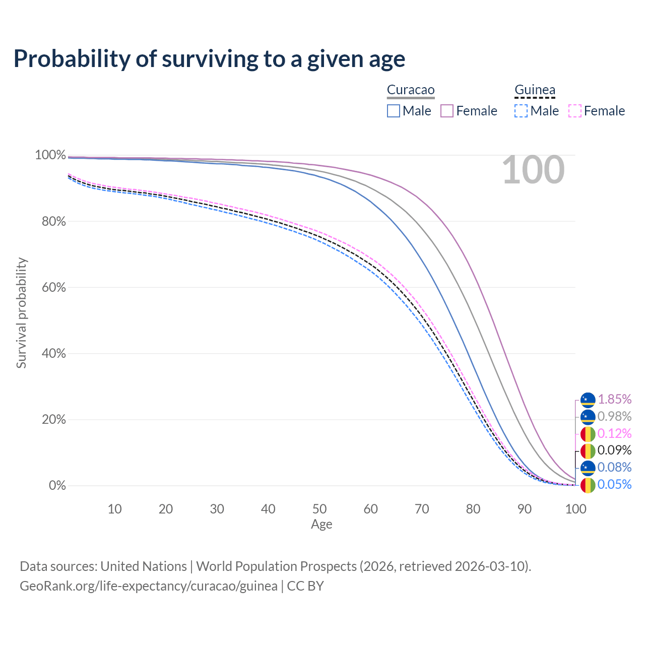 This life expectancy calculator shows the odds of living to 100, 95, 90, and below based on current age for both males and females in Curacao and Guinea, along with mean and median age of death. The calculations are based on the 2026 life tables (actuarial tables) from the UN World Population Prospects.