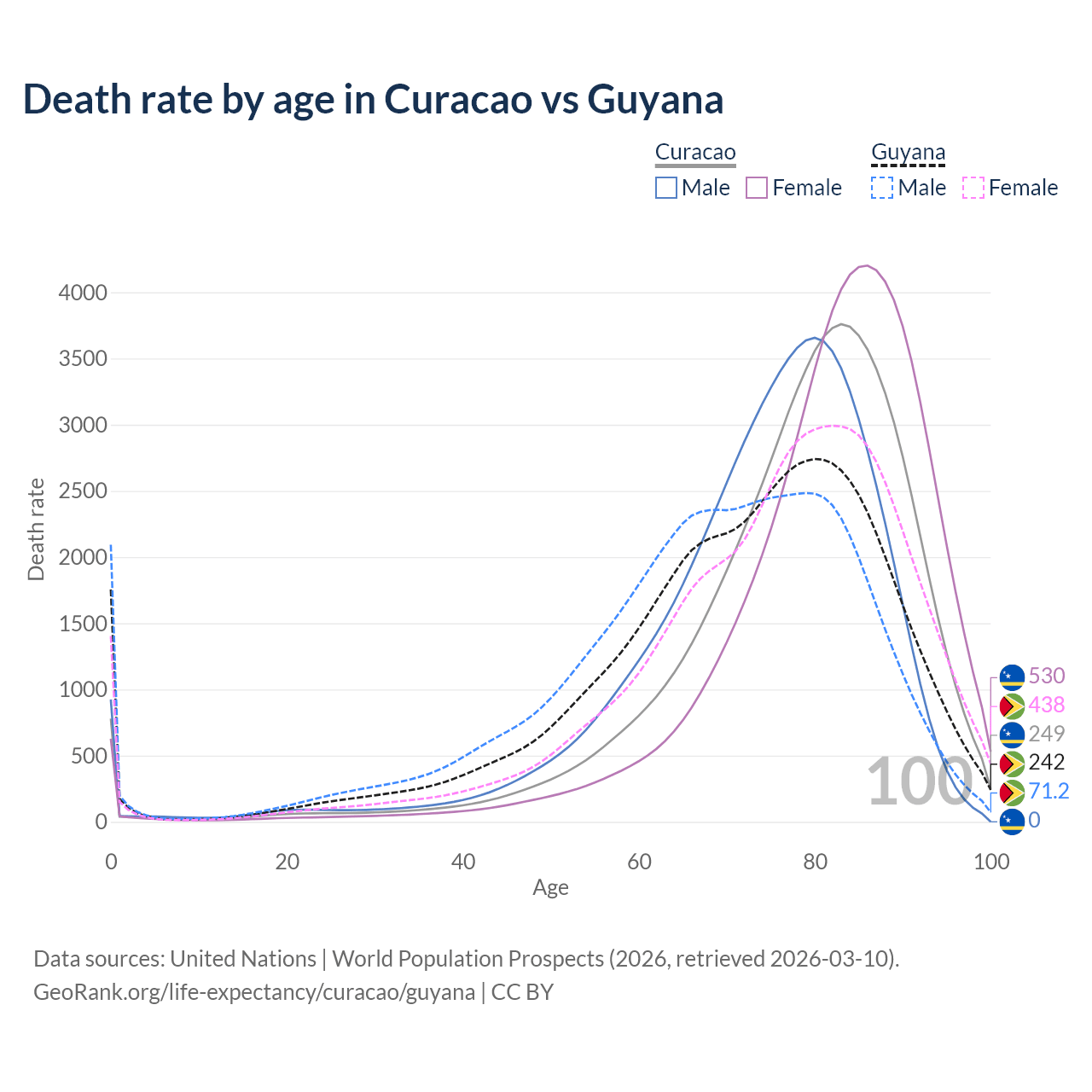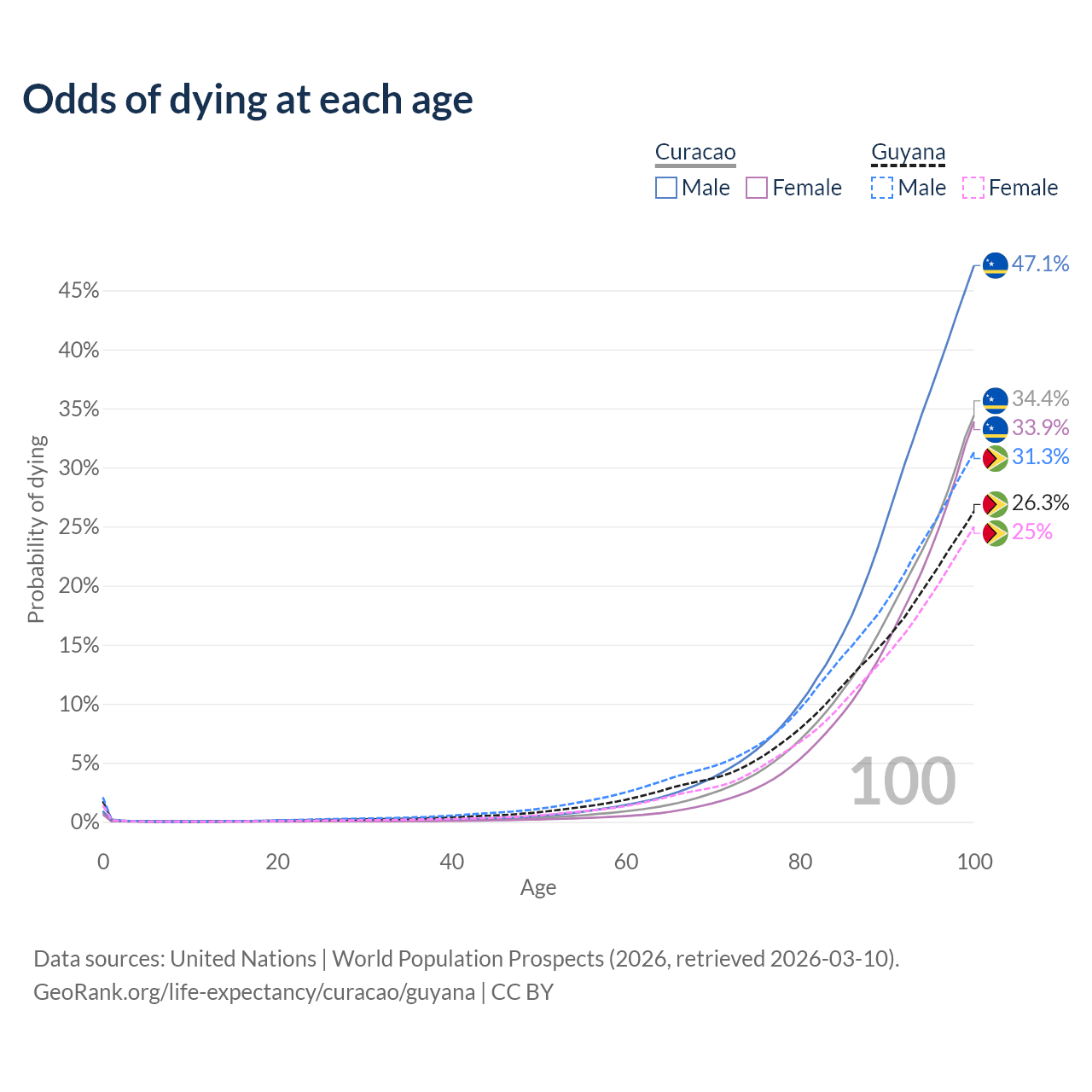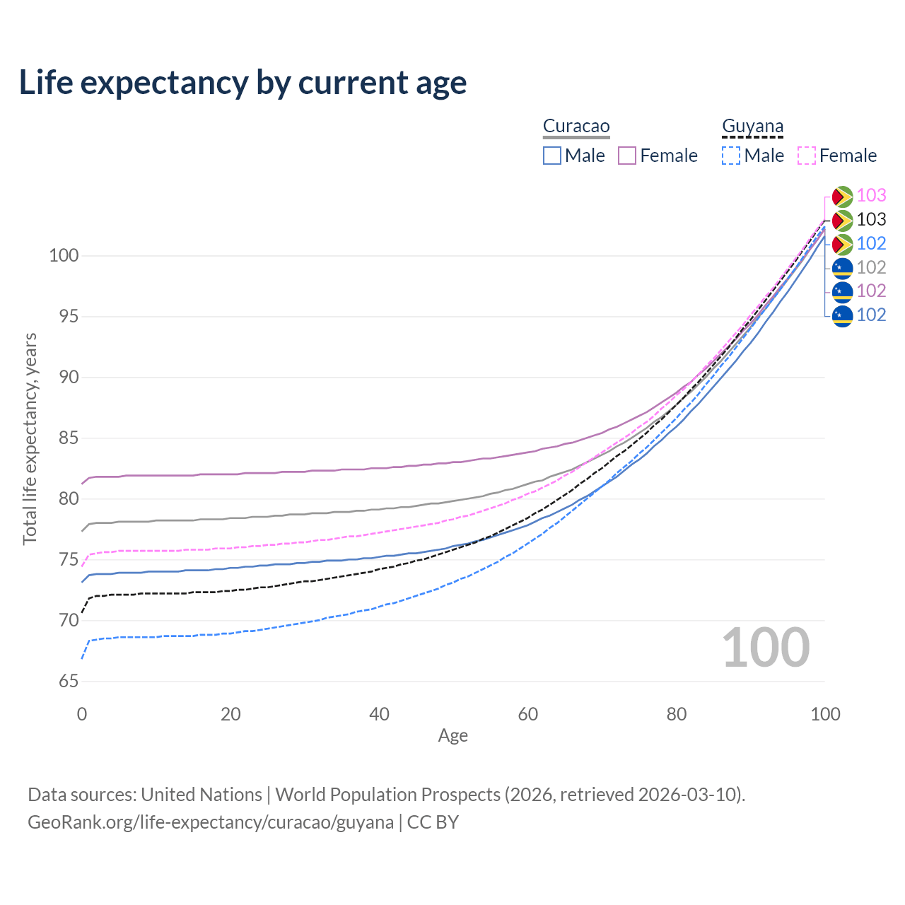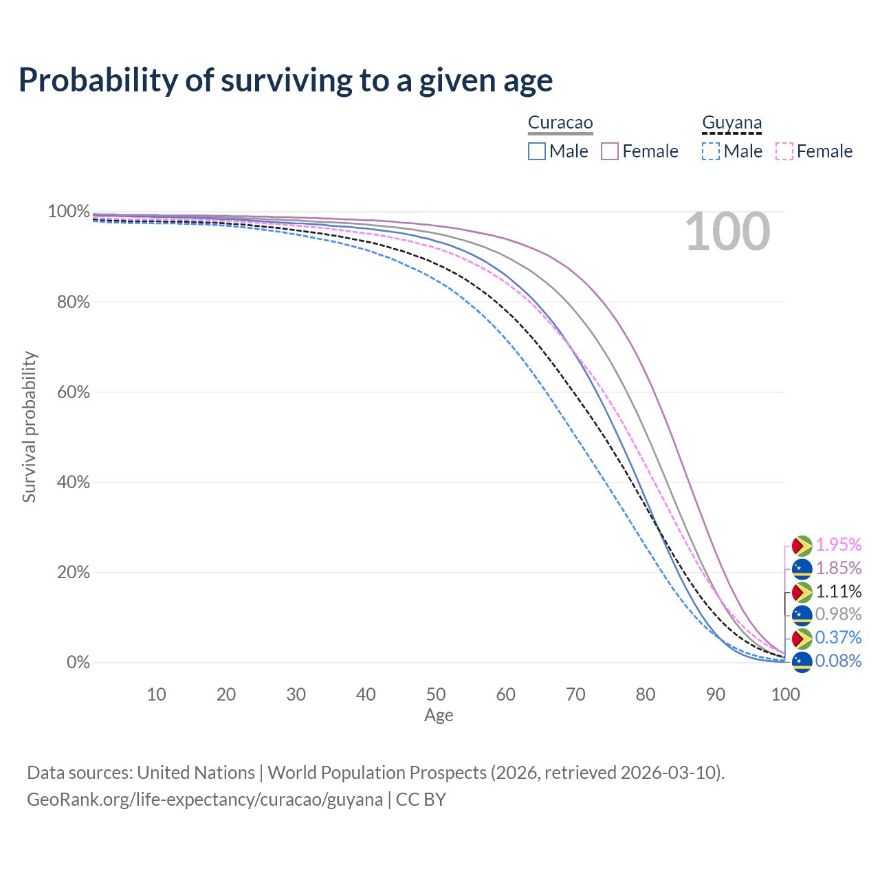 This life expectancy calculator shows the odds of living to 100, 95, 90, and below based on current age for both males and females in Curacao and Guyana, along with mean and median age of death. The calculations are based on the 2026 life tables (actuarial tables) from the UN World Population Prospects.
