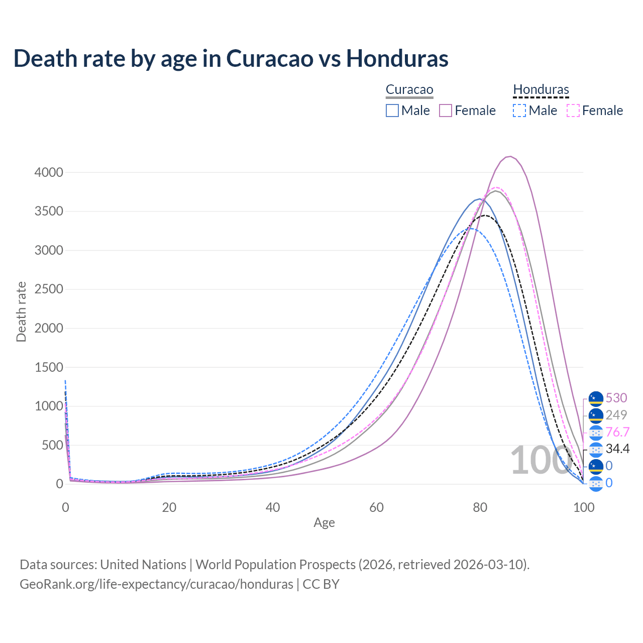 In Curacao, the most common age of death is 83, compared to 81 in Honduras. The median age of death is 80.4 in Curacao and 77.1 in Honduras, meaning only half of each cohort is expected to live past that age.