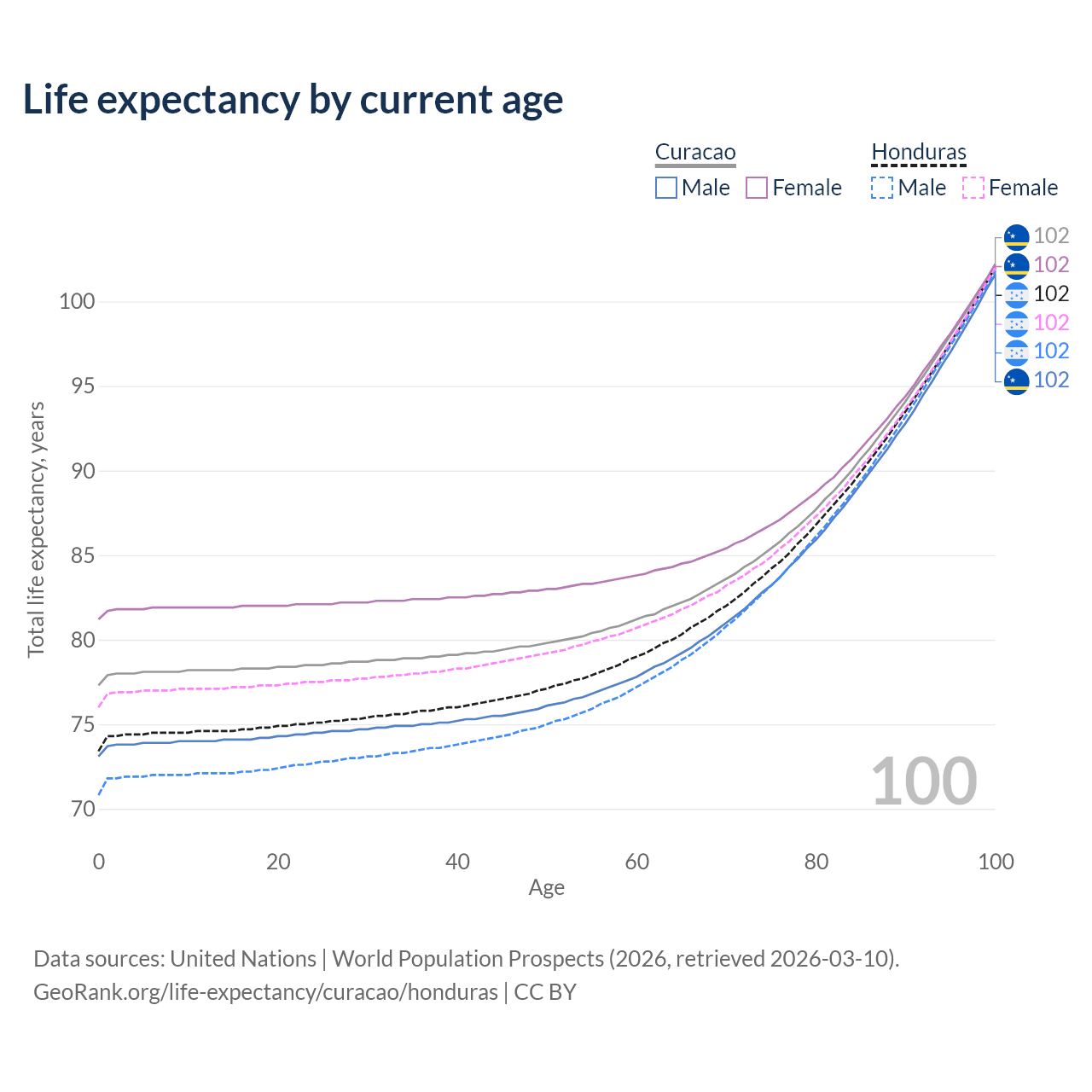 This life expectancy calculator shows the odds of living to 100, 95, 90, and below based on current age for both males and females in Curacao and Honduras, along with mean and median age of death. The calculations are based on the 2026 life tables (actuarial tables) from the UN World Population Prospects.