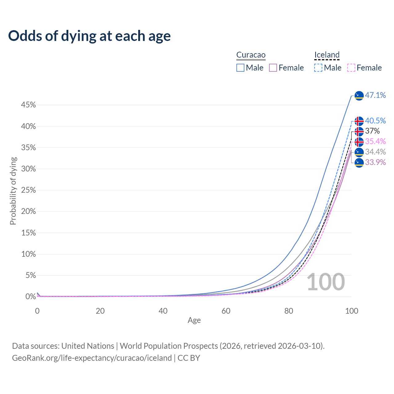 This life expectancy calculator shows the odds of living to 100, 95, 90, and below based on current age for both males and females in Curacao and Iceland, along with mean and median age of death. The calculations are based on the 2026 life tables (actuarial tables) from the UN World Population Prospects.