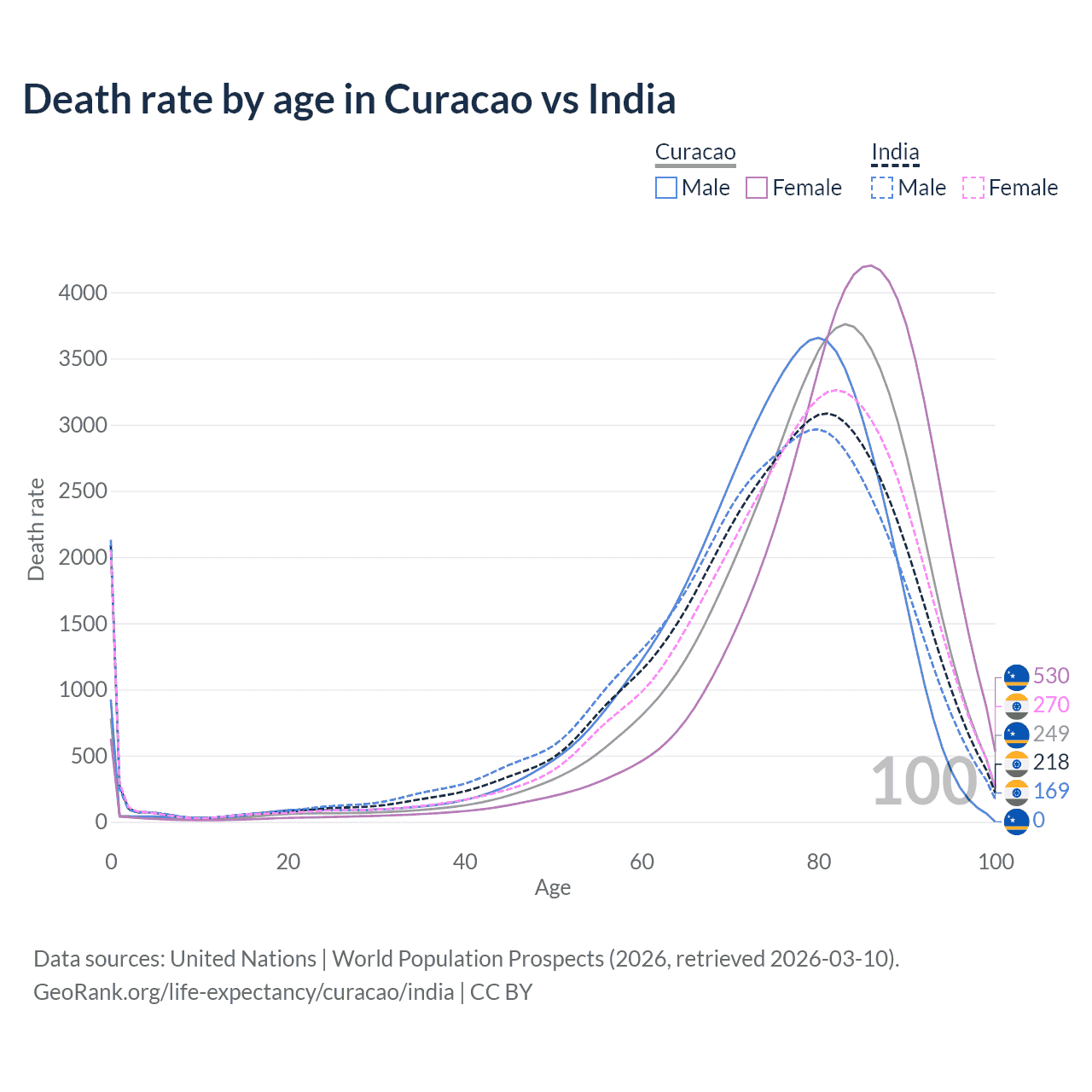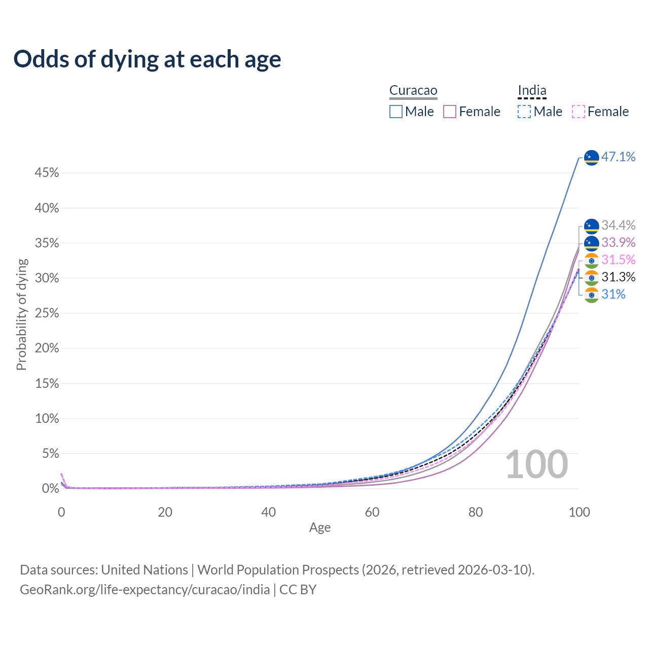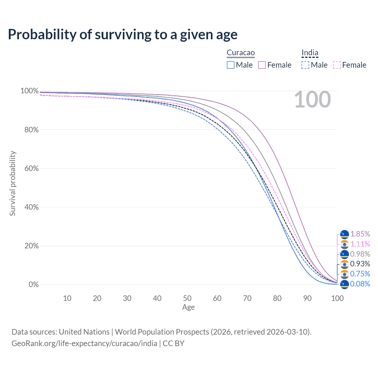 This life expectancy calculator shows the odds of living to 100, 95, 90, and below based on current age for both males and females in Curacao and India, along with mean and median age of death. The calculations are based on the 2026 life tables (actuarial tables) from the UN World Population Prospects.