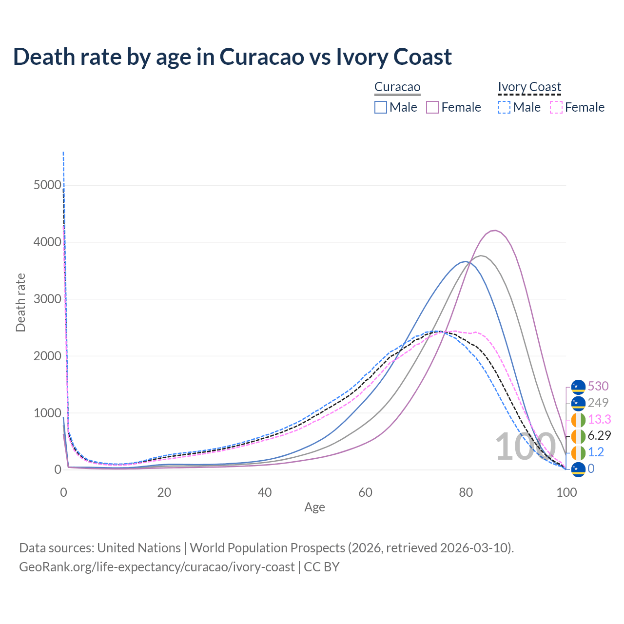 In Curacao, the most common age of death is 83, compared to 0 in Ivory Coast. The median age of death is 80.4 in Curacao and 68.6 in Ivory Coast, meaning only half of each cohort is expected to live past that age.