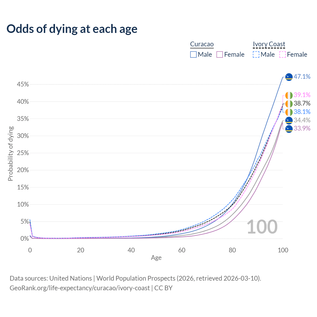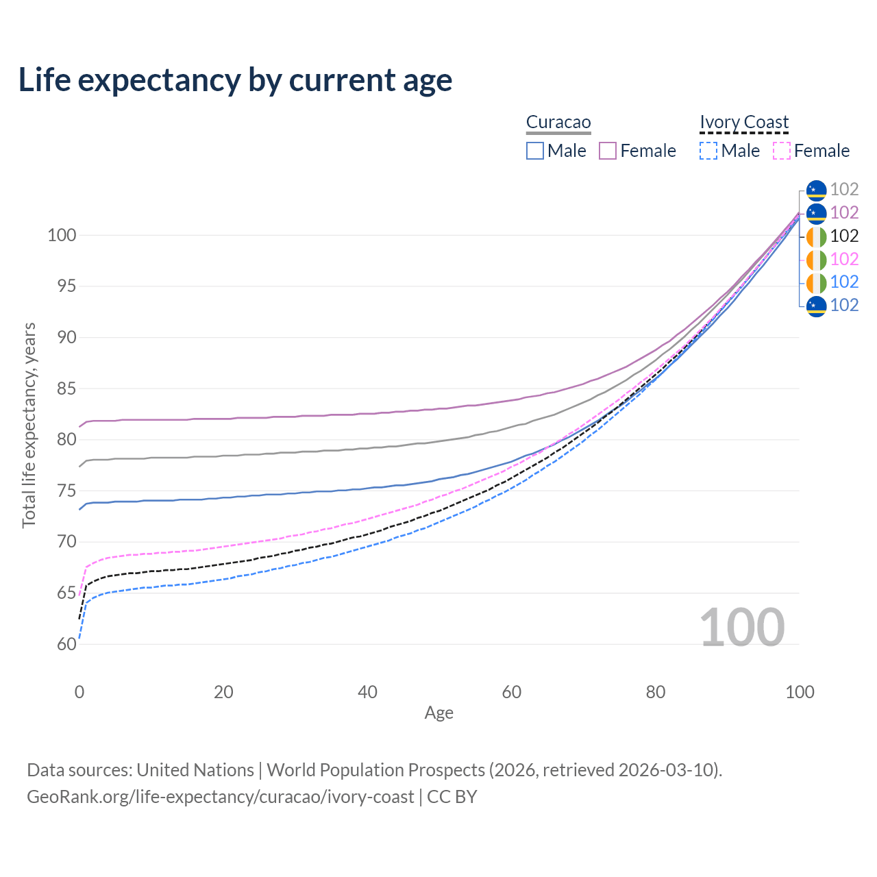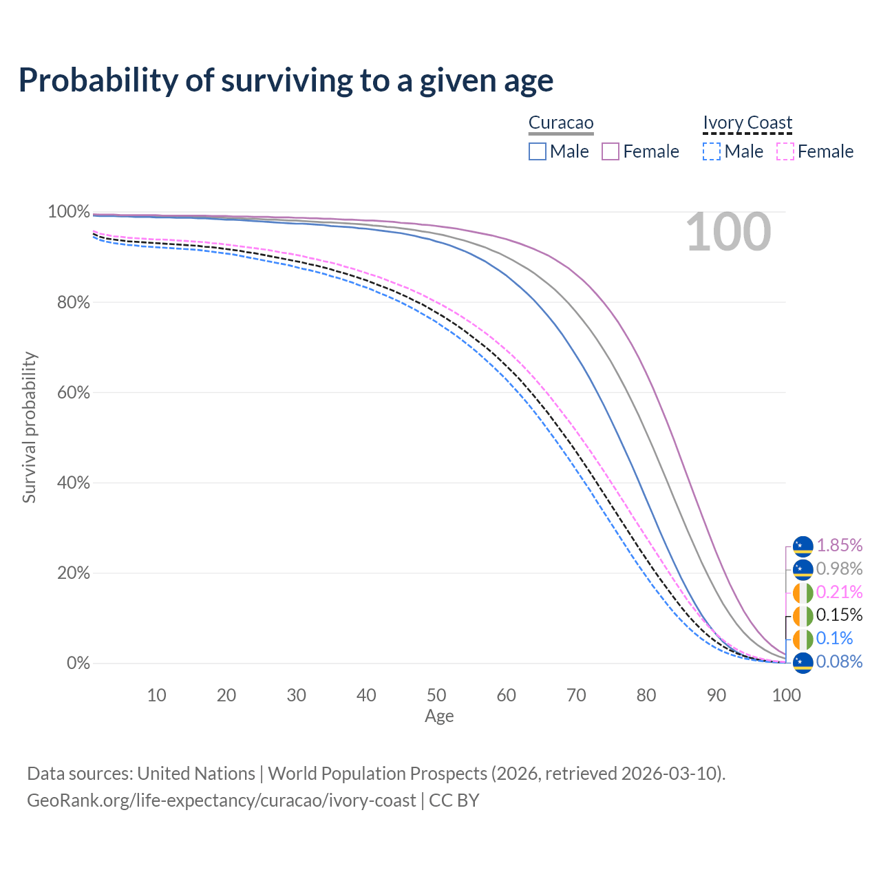 This life expectancy calculator shows the odds of living to 100, 95, 90, and below based on current age for both males and females in Curacao and Ivory Coast, along with mean and median age of death. The calculations are based on the 2026 life tables (actuarial tables) from the UN World Population Prospects.