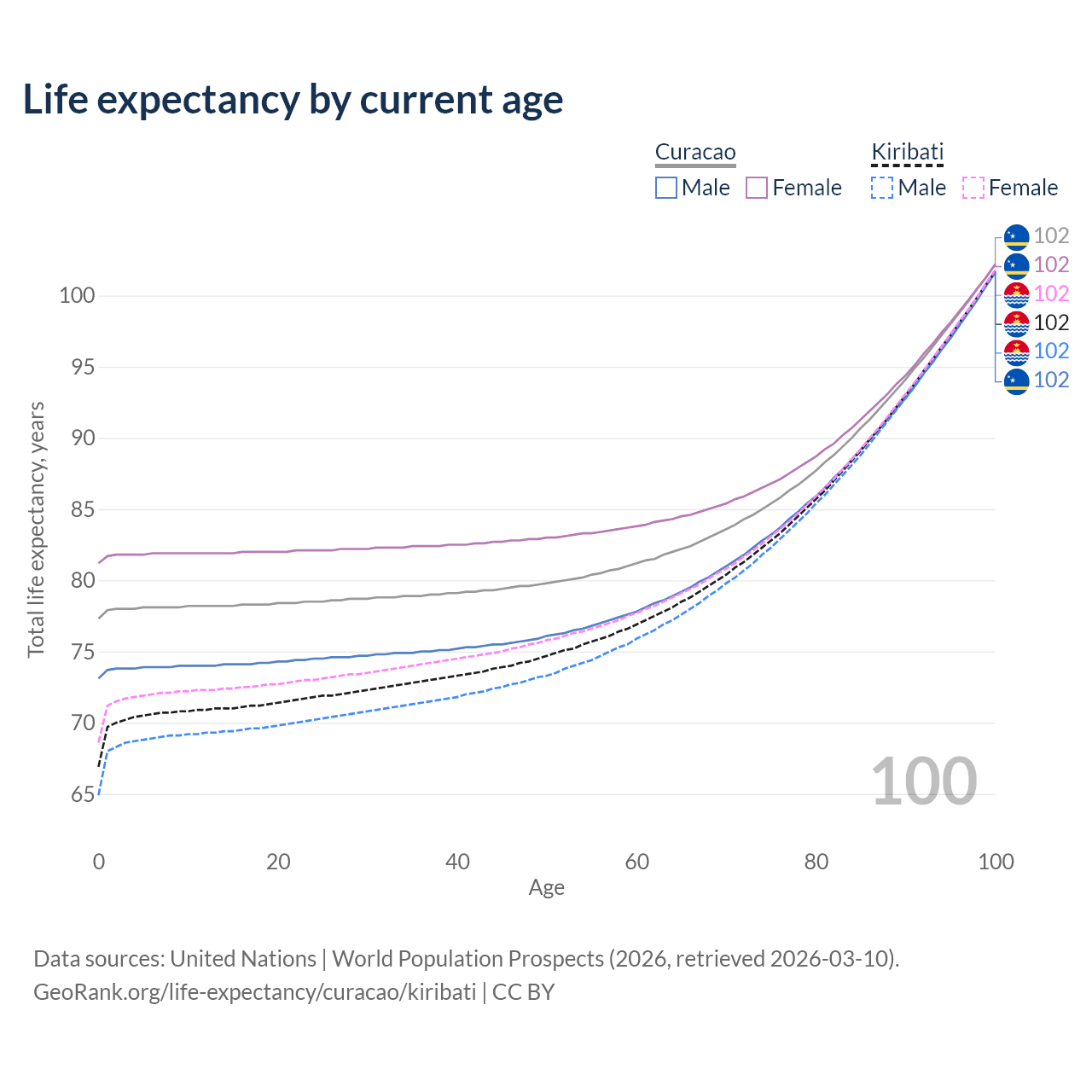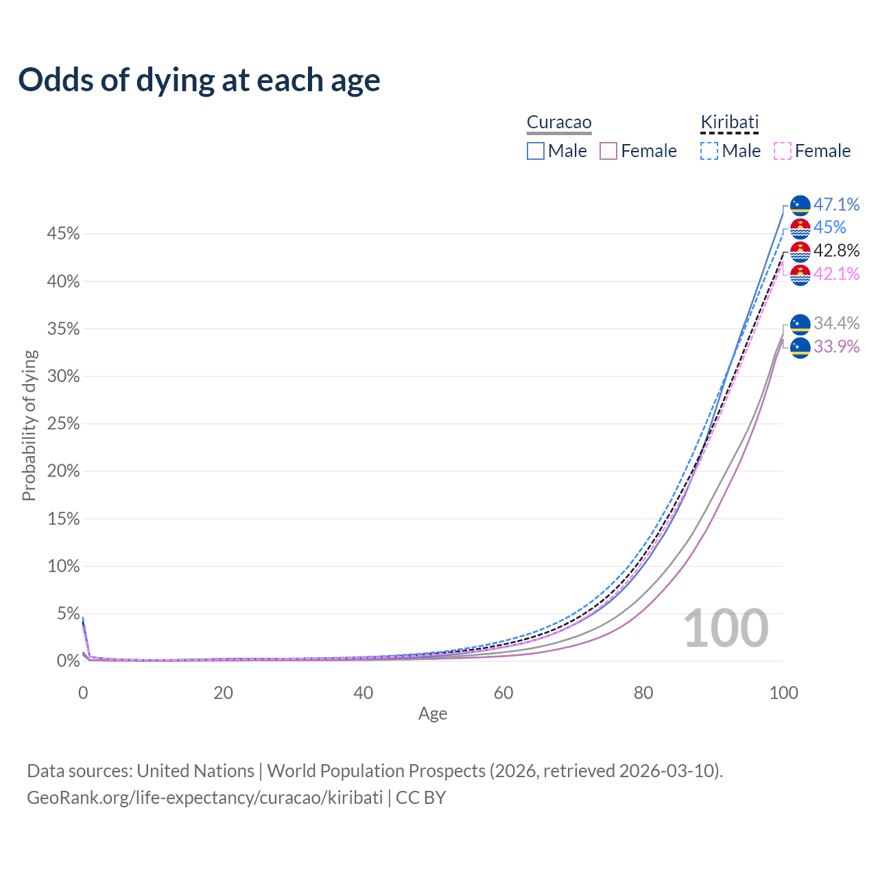 This life expectancy calculator shows the odds of living to 100, 95, 90, and below based on current age for both males and females in Curacao and Kiribati, along with mean and median age of death. The calculations are based on the 2026 life tables (actuarial tables) from the UN World Population Prospects.
