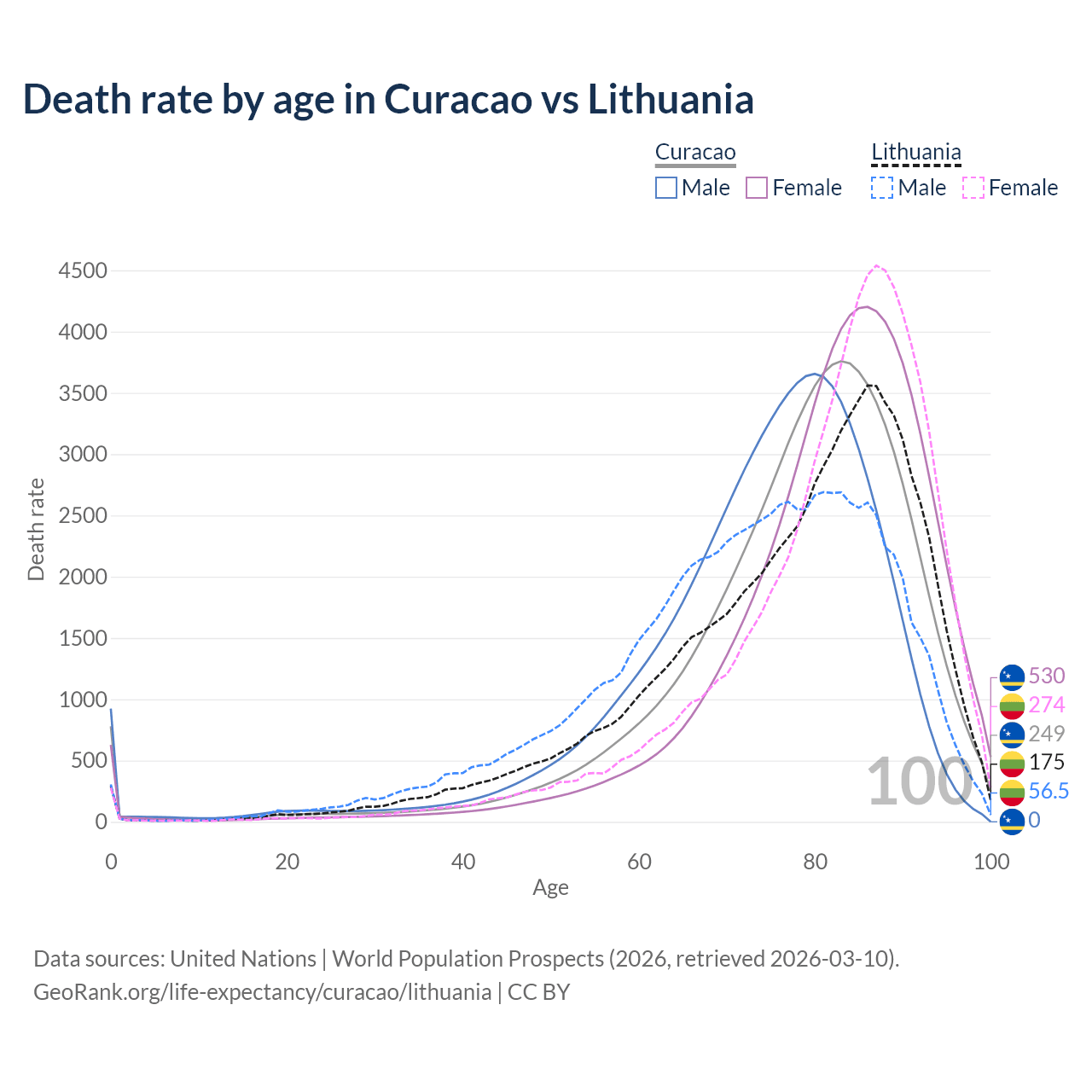In Curacao, the most common age of death is 83, compared to 86 in Lithuania. The median age of death is 80.4 in Curacao and 80.4 in Lithuania, meaning only half of each cohort is expected to live past that age.