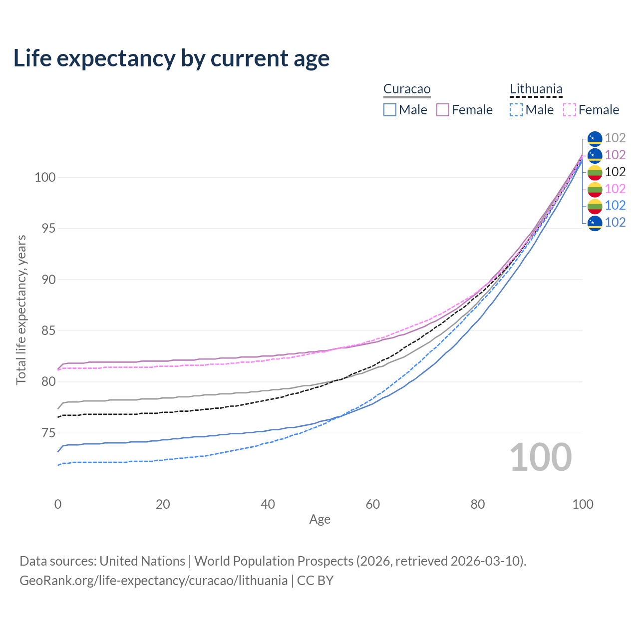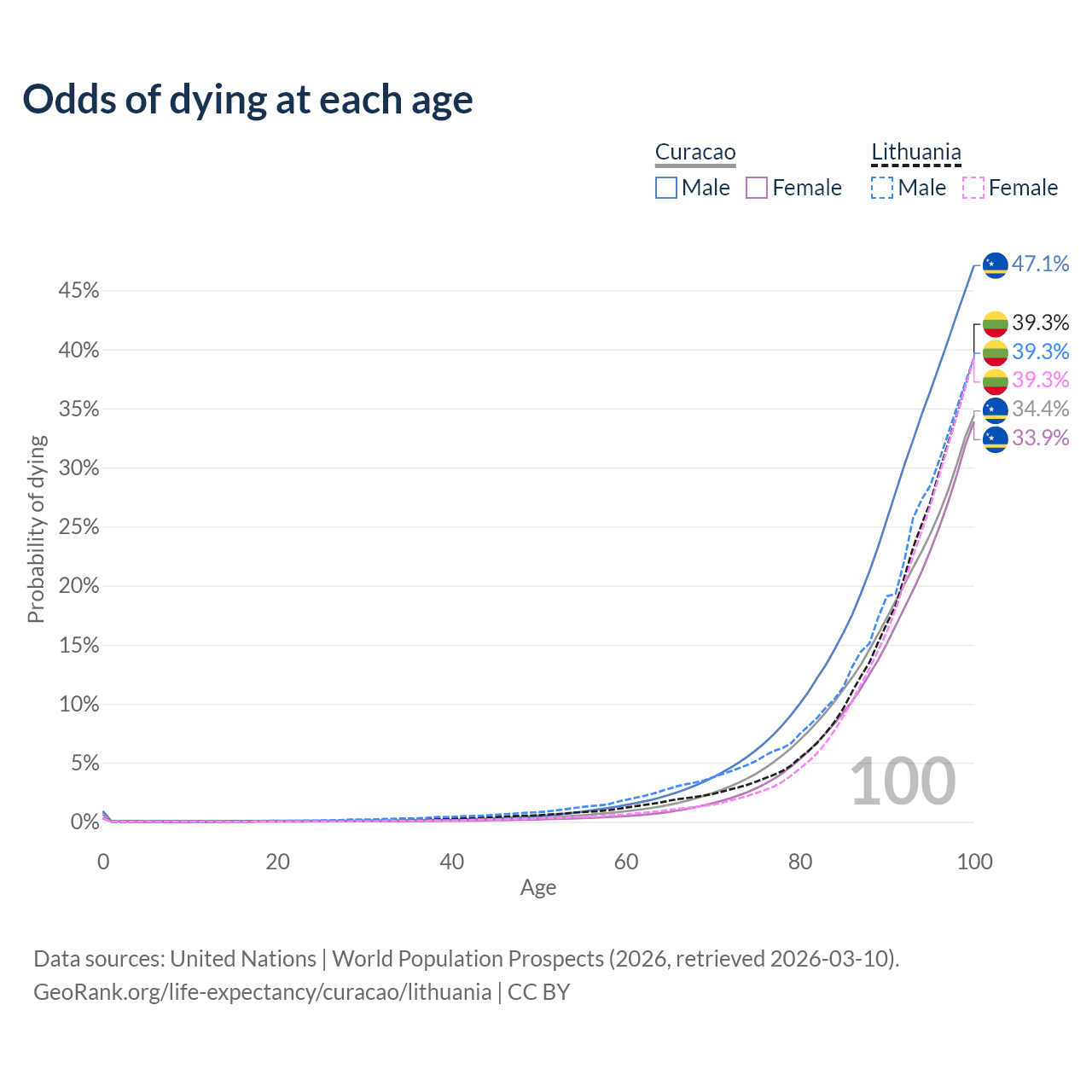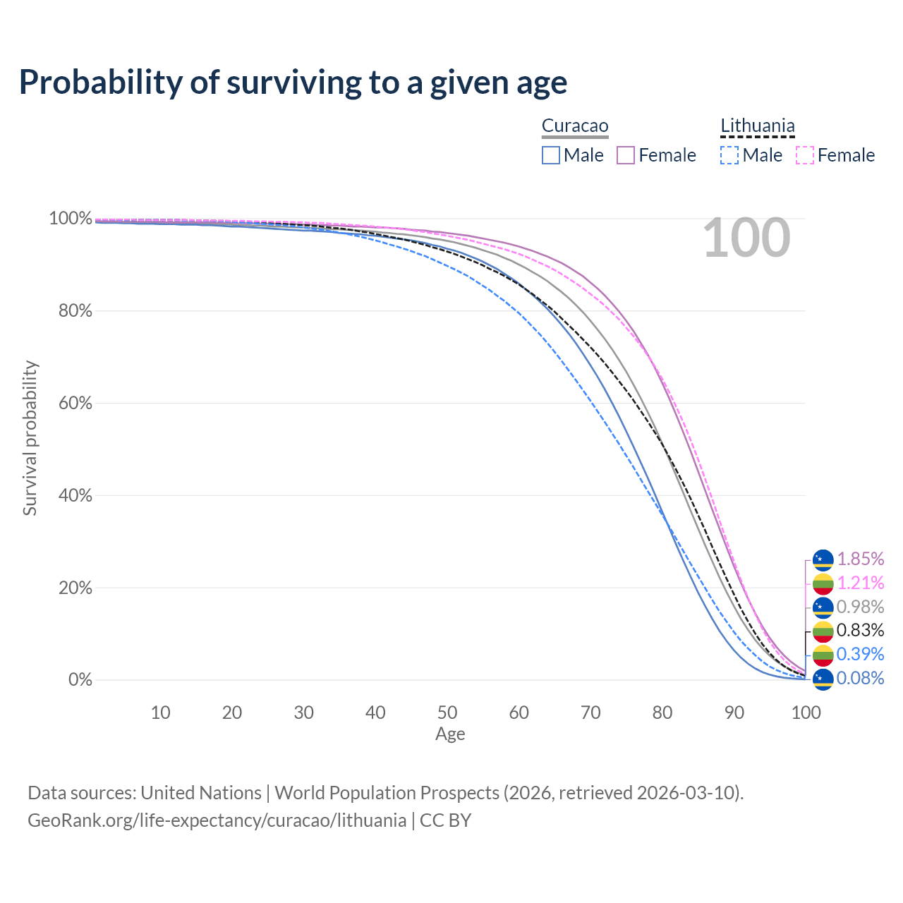 This life expectancy calculator shows the odds of living to 100, 95, 90, and below based on current age for both males and females in Curacao and Lithuania, along with mean and median age of death. The calculations are based on the 2026 life tables (actuarial tables) from the UN World Population Prospects.
