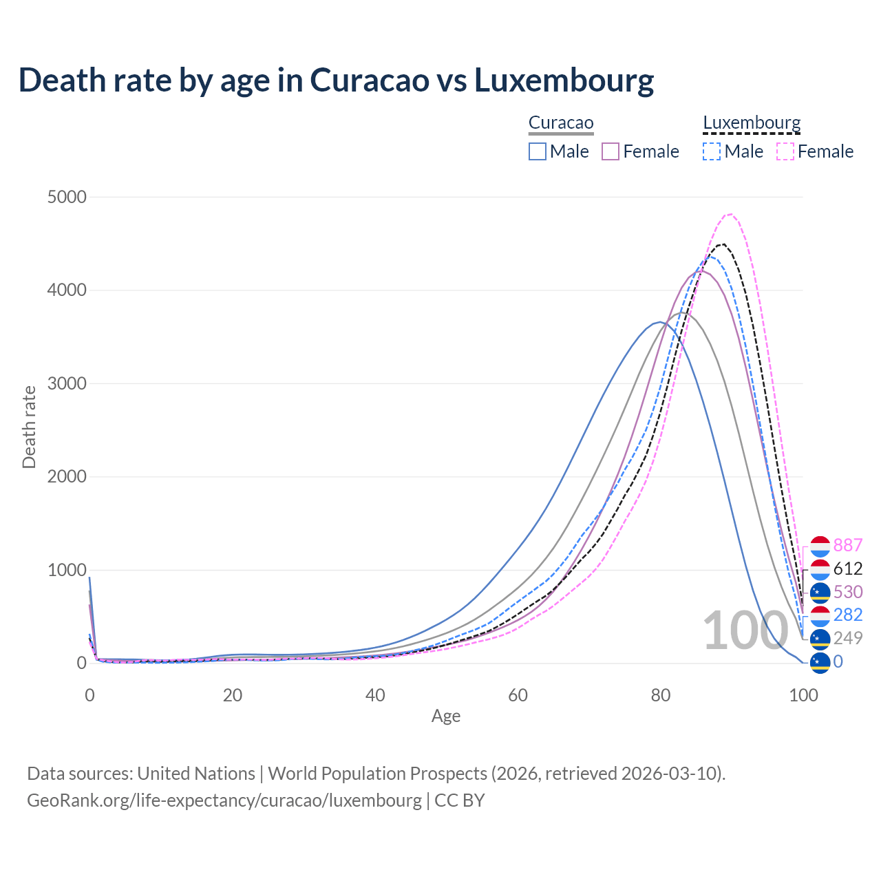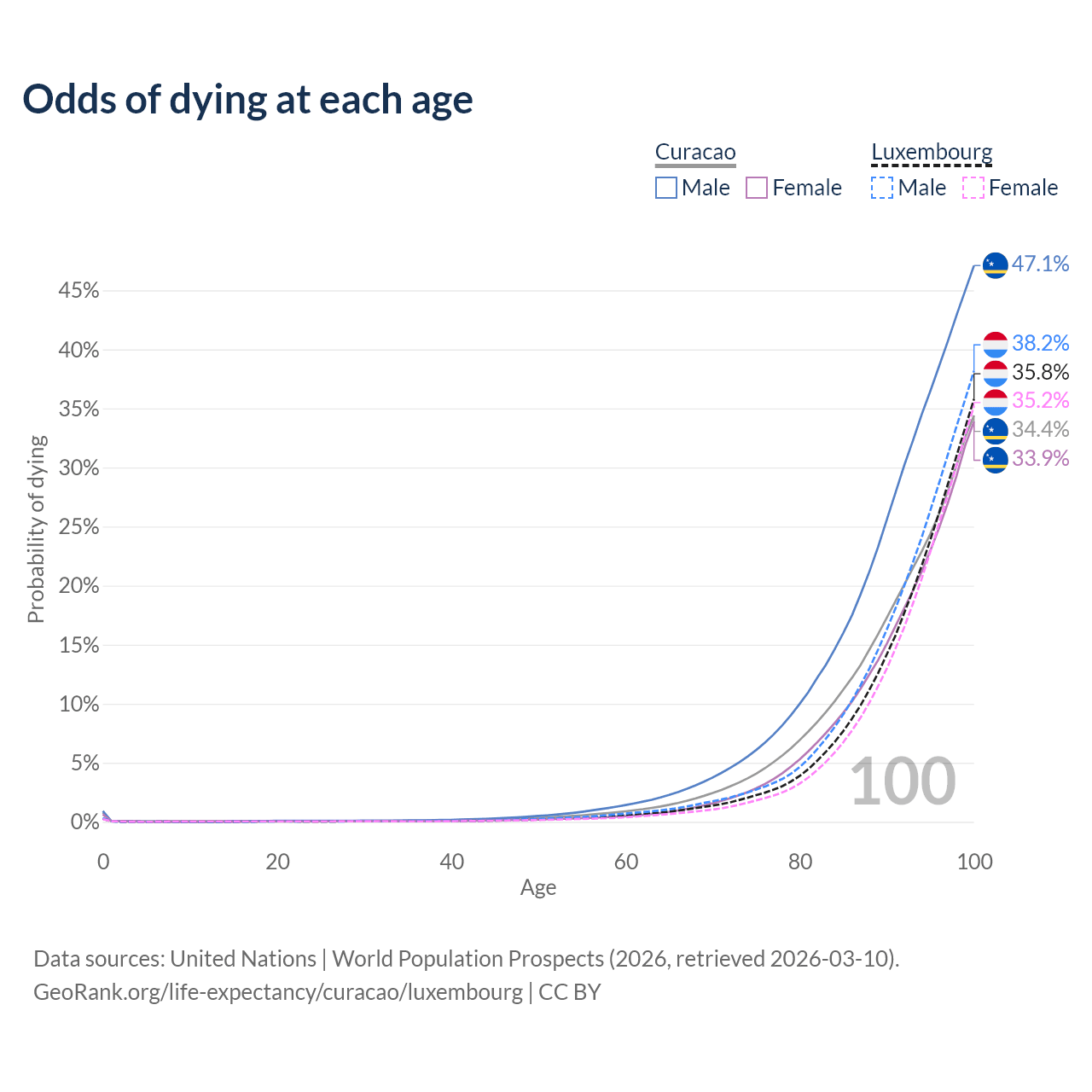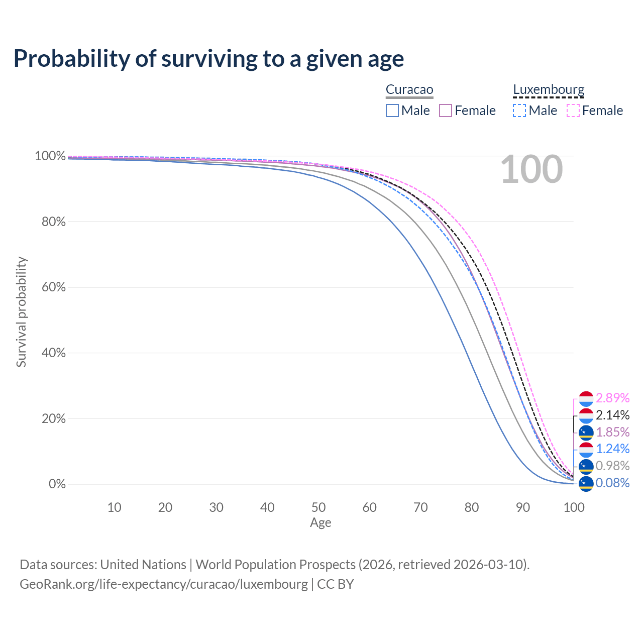 This life expectancy calculator shows the odds of living to 100, 95, 90, and below based on current age for both males and females in Curacao and Luxembourg, along with mean and median age of death. The calculations are based on the 2026 life tables (actuarial tables) from the UN World Population Prospects.