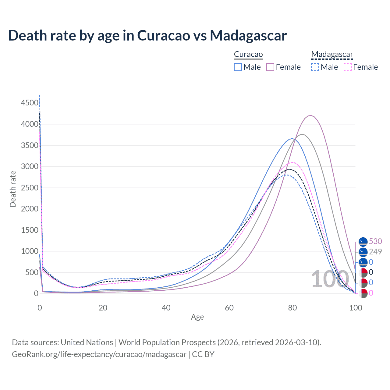 In Curacao, the most common age of death is 83, compared to 0 in Madagascar. The median age of death is 80.4 in Curacao and 72.2 in Madagascar, meaning only half of each cohort is expected to live past that age.