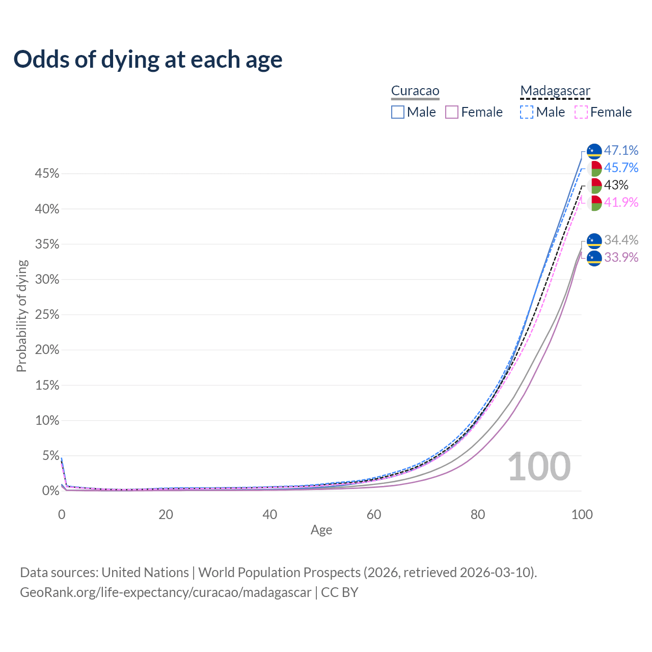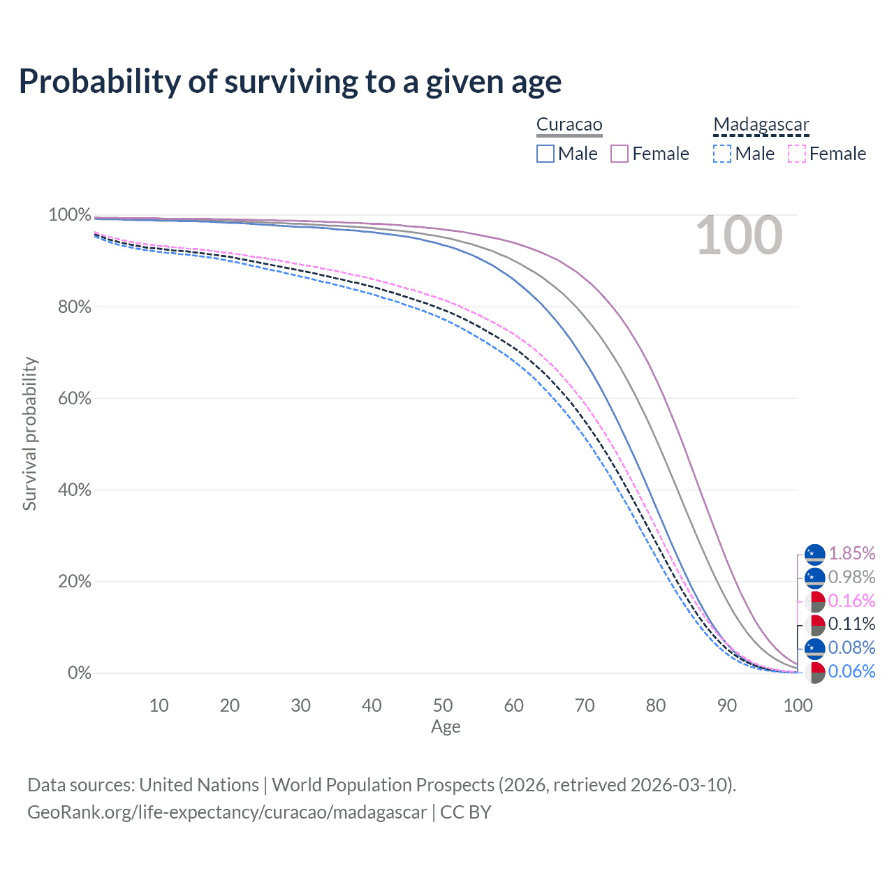 This life expectancy calculator shows the odds of living to 100, 95, 90, and below based on current age for both males and females in Curacao and Madagascar, along with mean and median age of death. The calculations are based on the 2026 life tables (actuarial tables) from the UN World Population Prospects.