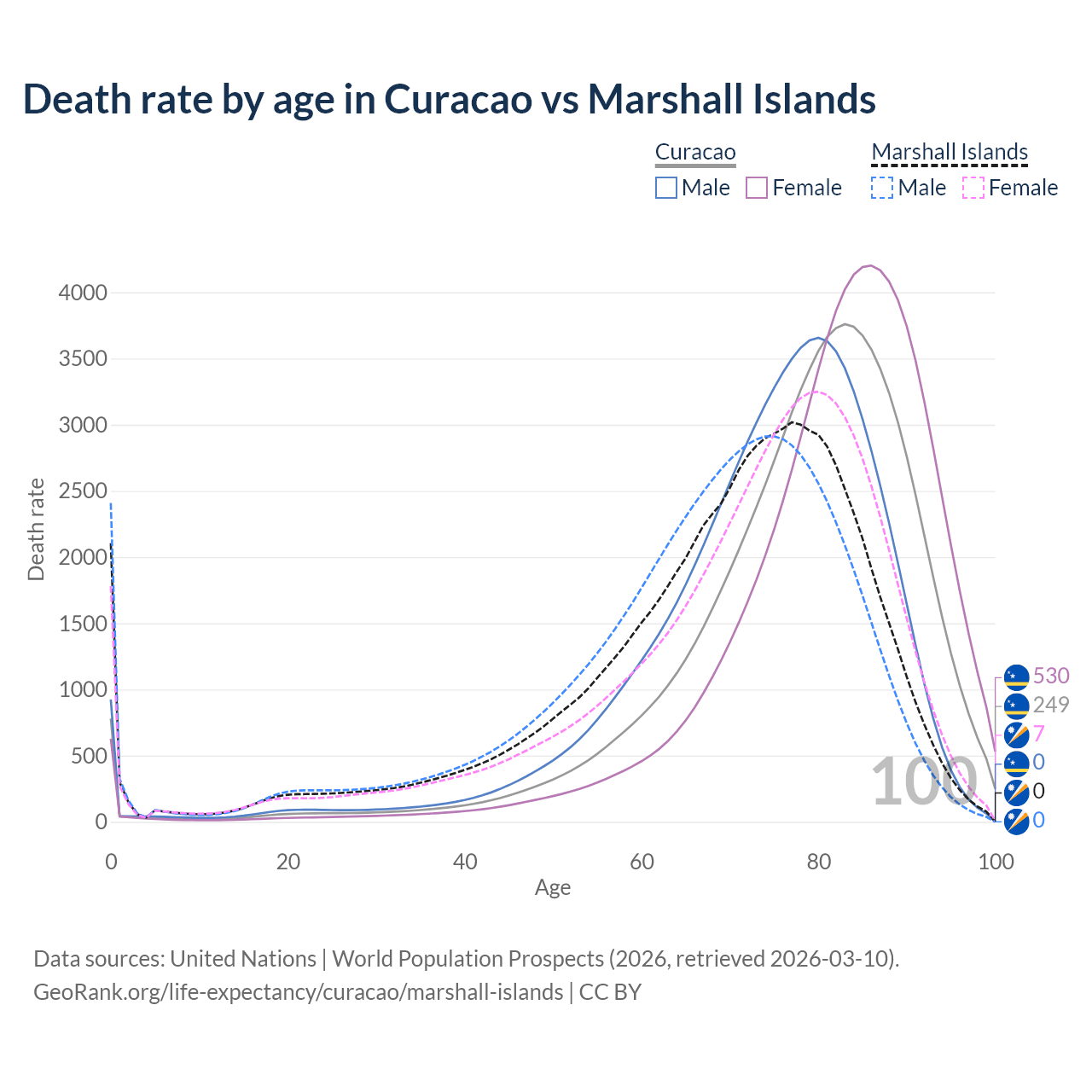 In Curacao, the most common age of death is 83, compared to 77 in the Marshall Islands. The median age of death is 80.4 in Curacao and 72 in the Marshall Islands, meaning only half of each cohort is expected to live past that age.