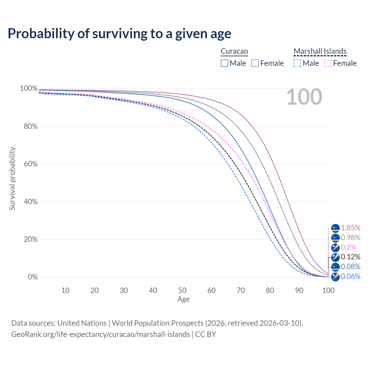 This life expectancy calculator shows the odds of living to 100, 95, 90, and below based on current age for both males and females in Curacao and the Marshall Islands, along with mean and median age of death. The calculations are based on the 2026 life tables (actuarial tables) from the UN World Population Prospects.