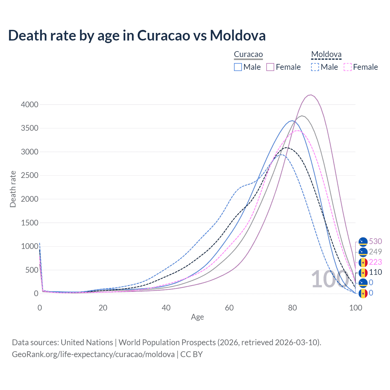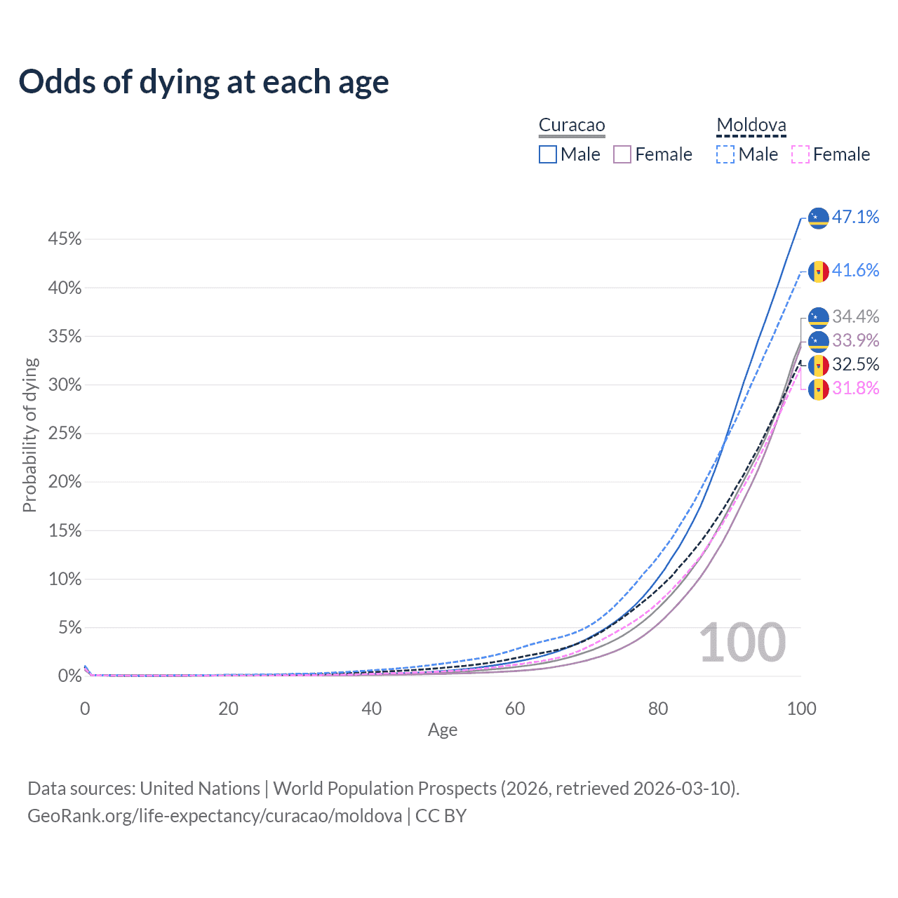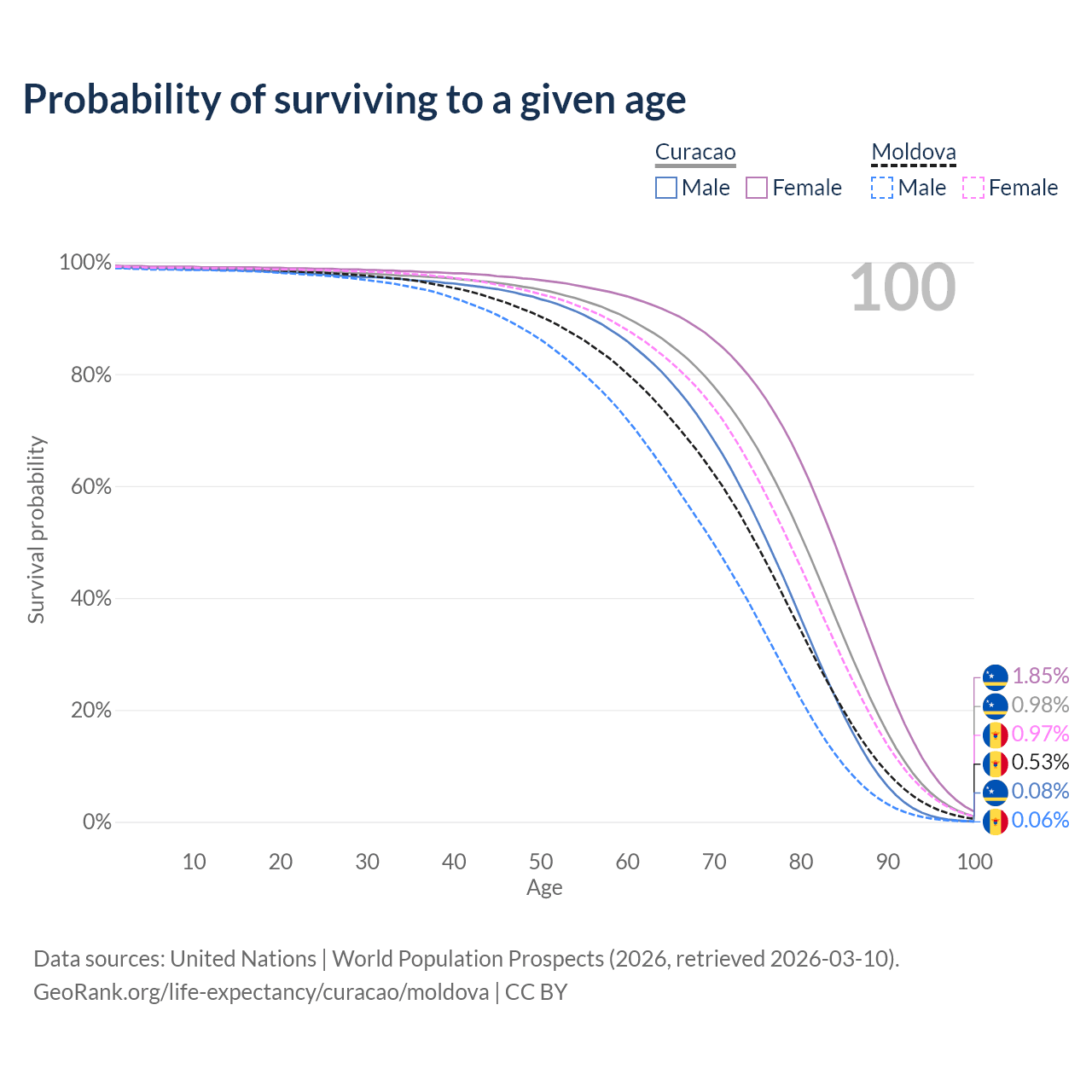 This life expectancy calculator shows the odds of living to 100, 95, 90, and below based on current age for both males and females in Curacao and Moldova, along with mean and median age of death. The calculations are based on the 2026 life tables (actuarial tables) from the UN World Population Prospects.