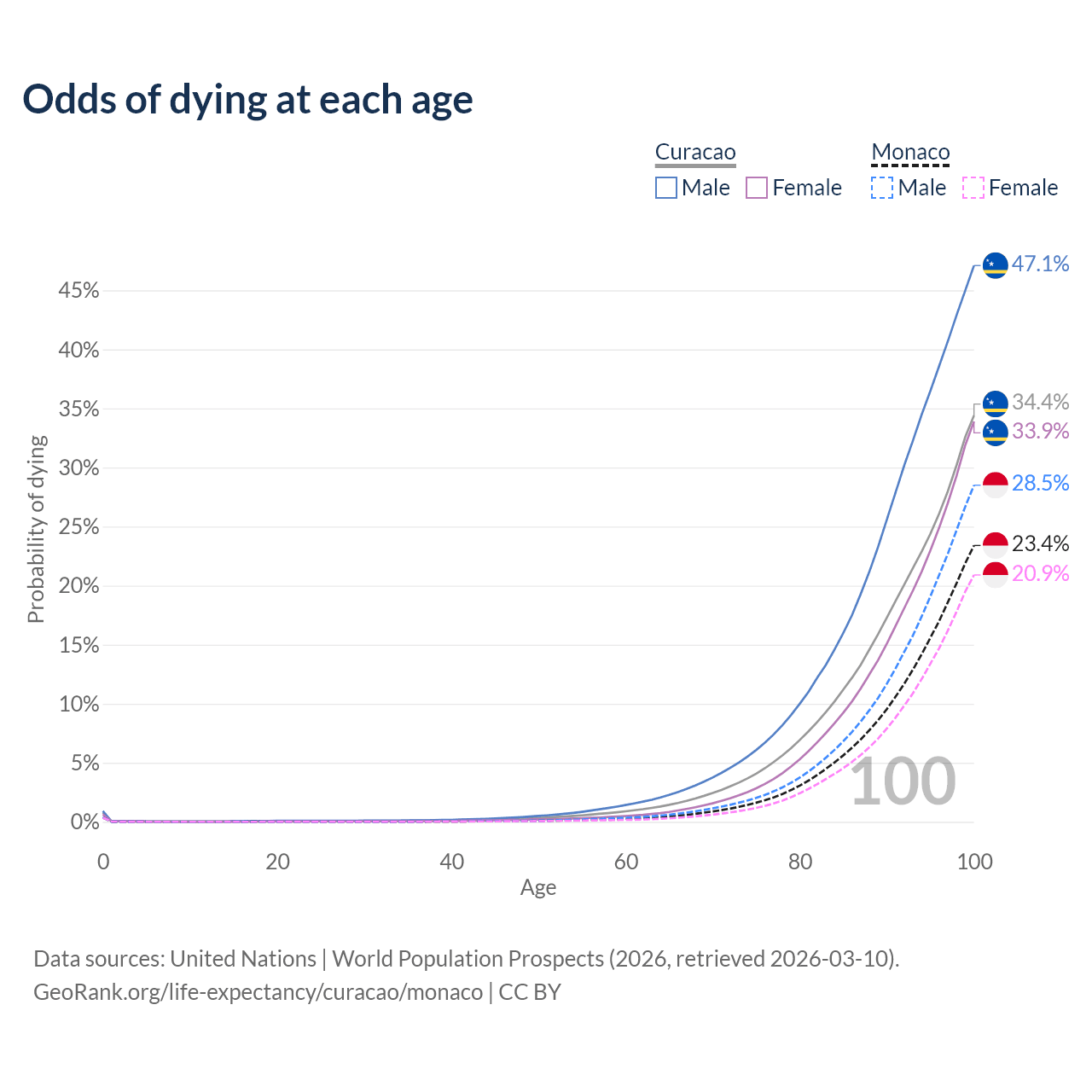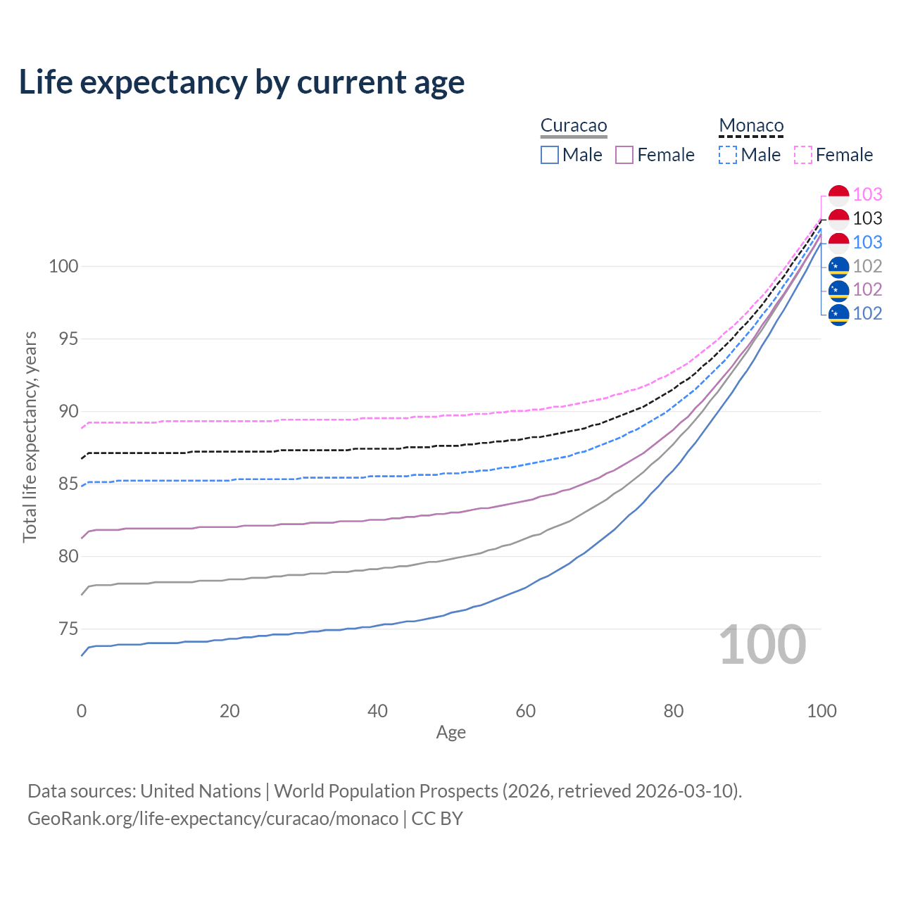 This life expectancy calculator shows the odds of living to 100, 95, 90, and below based on current age for both males and females in Curacao and Monaco, along with mean and median age of death. The calculations are based on the 2026 life tables (actuarial tables) from the UN World Population Prospects.