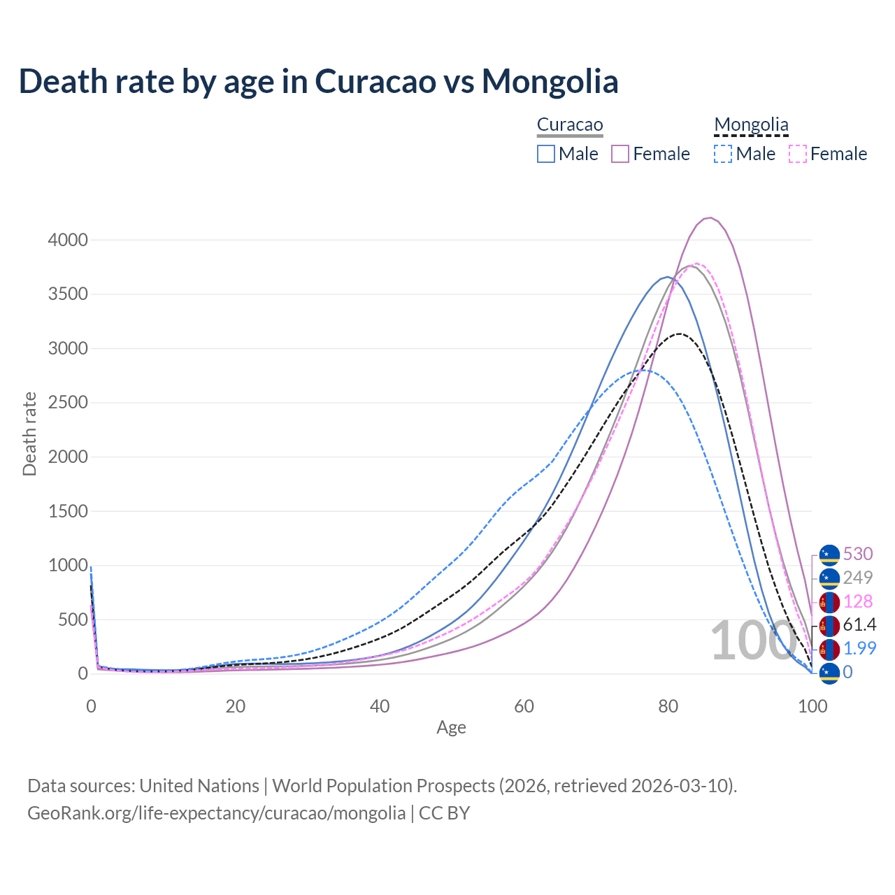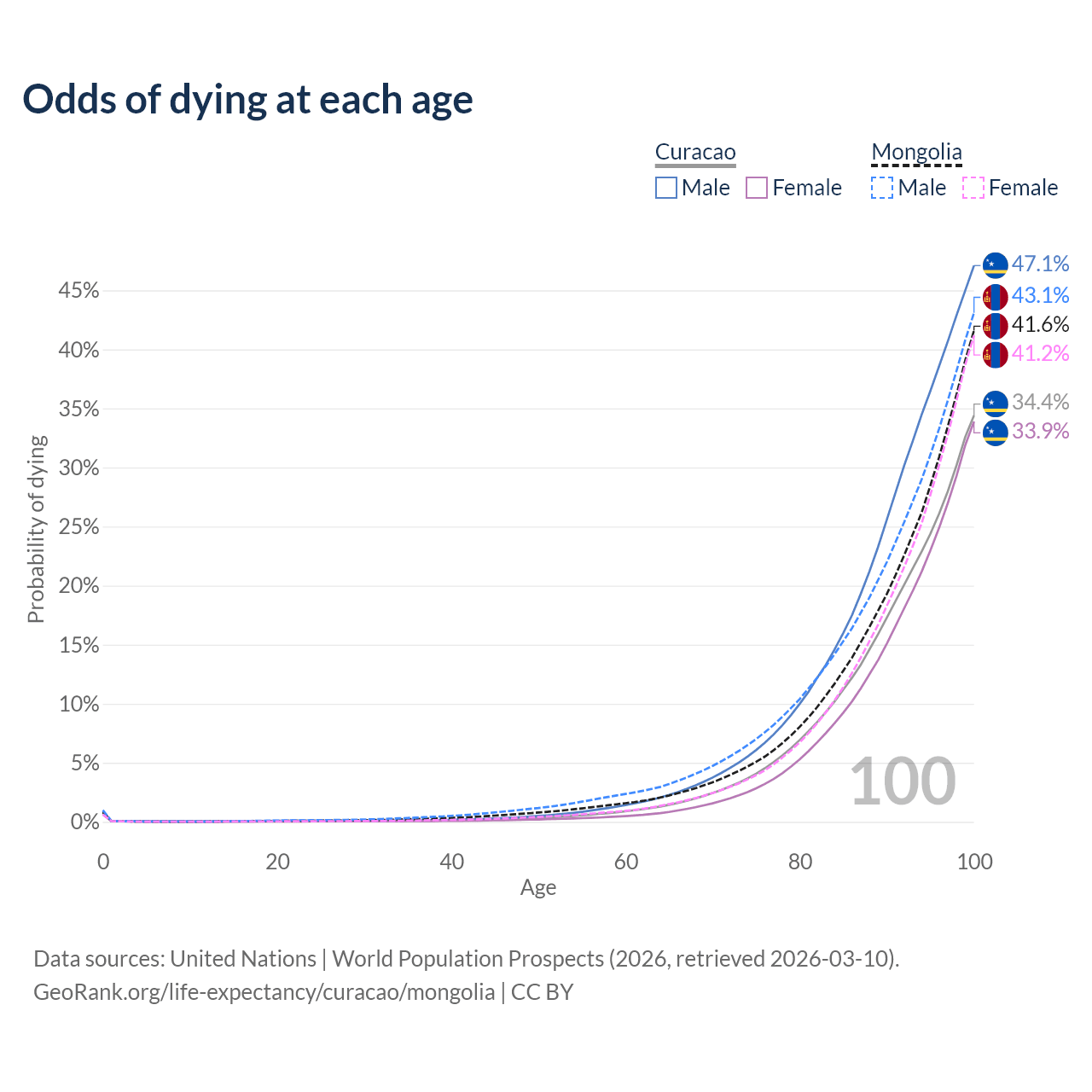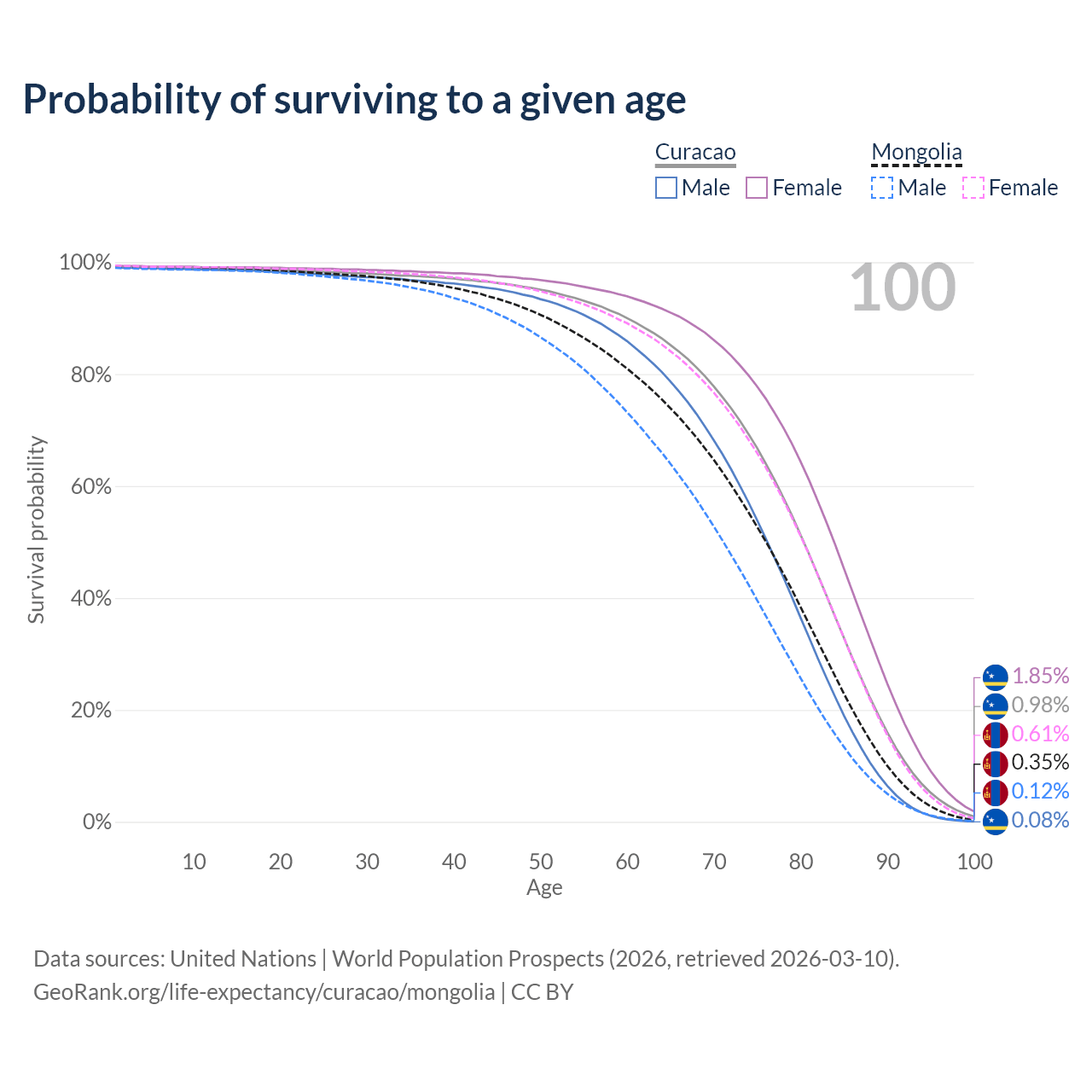 This life expectancy calculator shows the odds of living to 100, 95, 90, and below based on current age for both males and females in Curacao and Mongolia, along with mean and median age of death. The calculations are based on the 2026 life tables (actuarial tables) from the UN World Population Prospects.