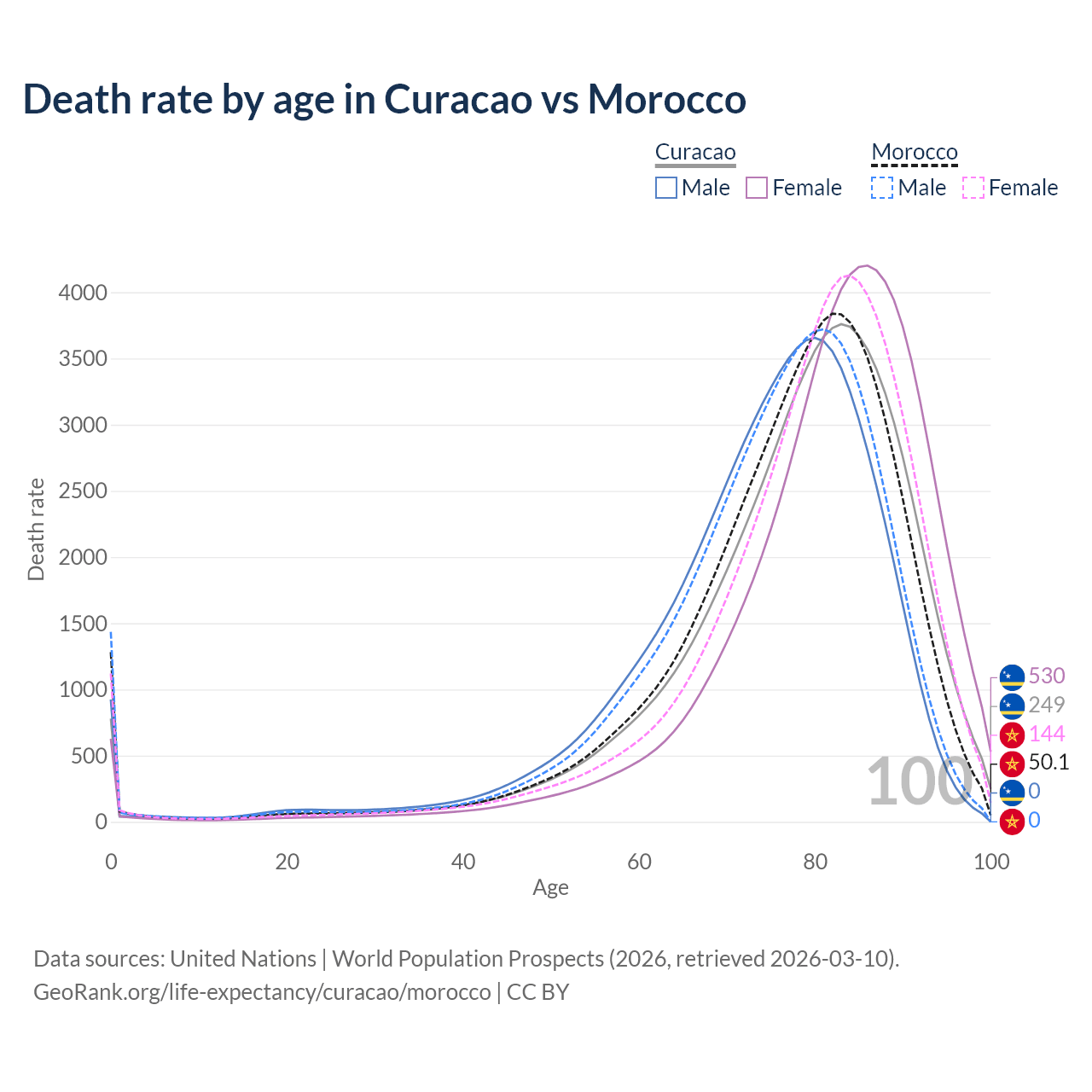 This life expectancy calculator shows the odds of living to 100, 95, 90, and below based on current age for both males and females in Curacao and Morocco, along with mean and median age of death. The calculations are based on the 2026 life tables (actuarial tables) from the UN World Population Prospects.