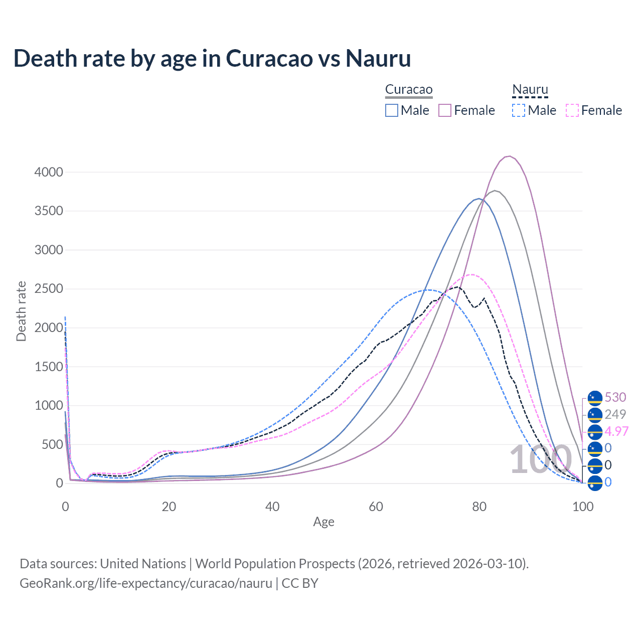 In Curacao, the most common age of death is 83, compared to 76 in Nauru. The median age of death is 80.4 in Curacao and 67.3 in Nauru, meaning only half of each cohort is expected to live past that age.