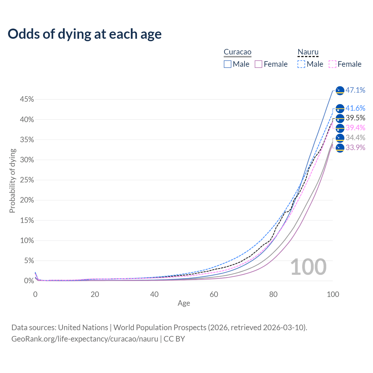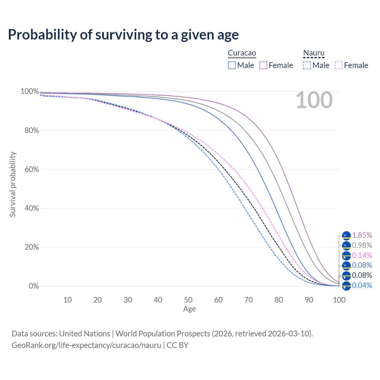 This life expectancy calculator shows the odds of living to 100, 95, 90, and below based on current age for both males and females in Curacao and Nauru, along with mean and median age of death. The calculations are based on the 2026 life tables (actuarial tables) from the UN World Population Prospects.