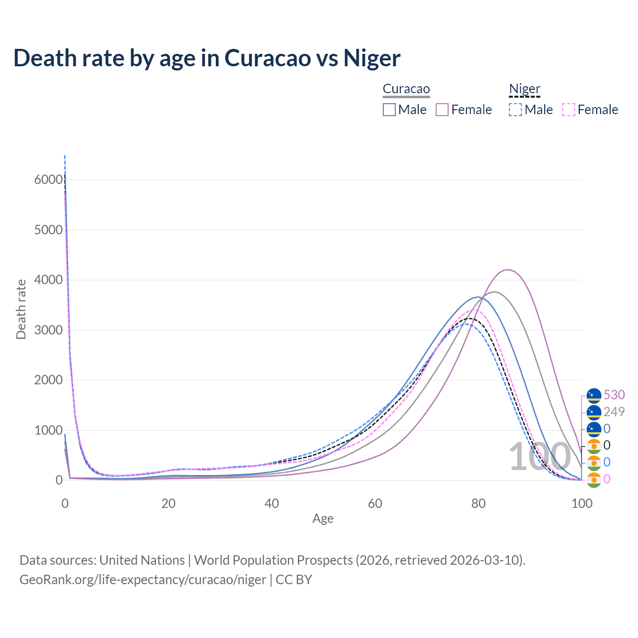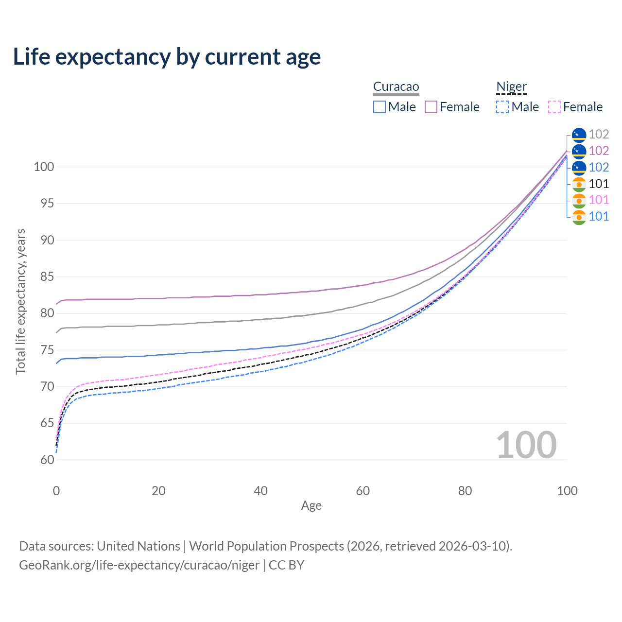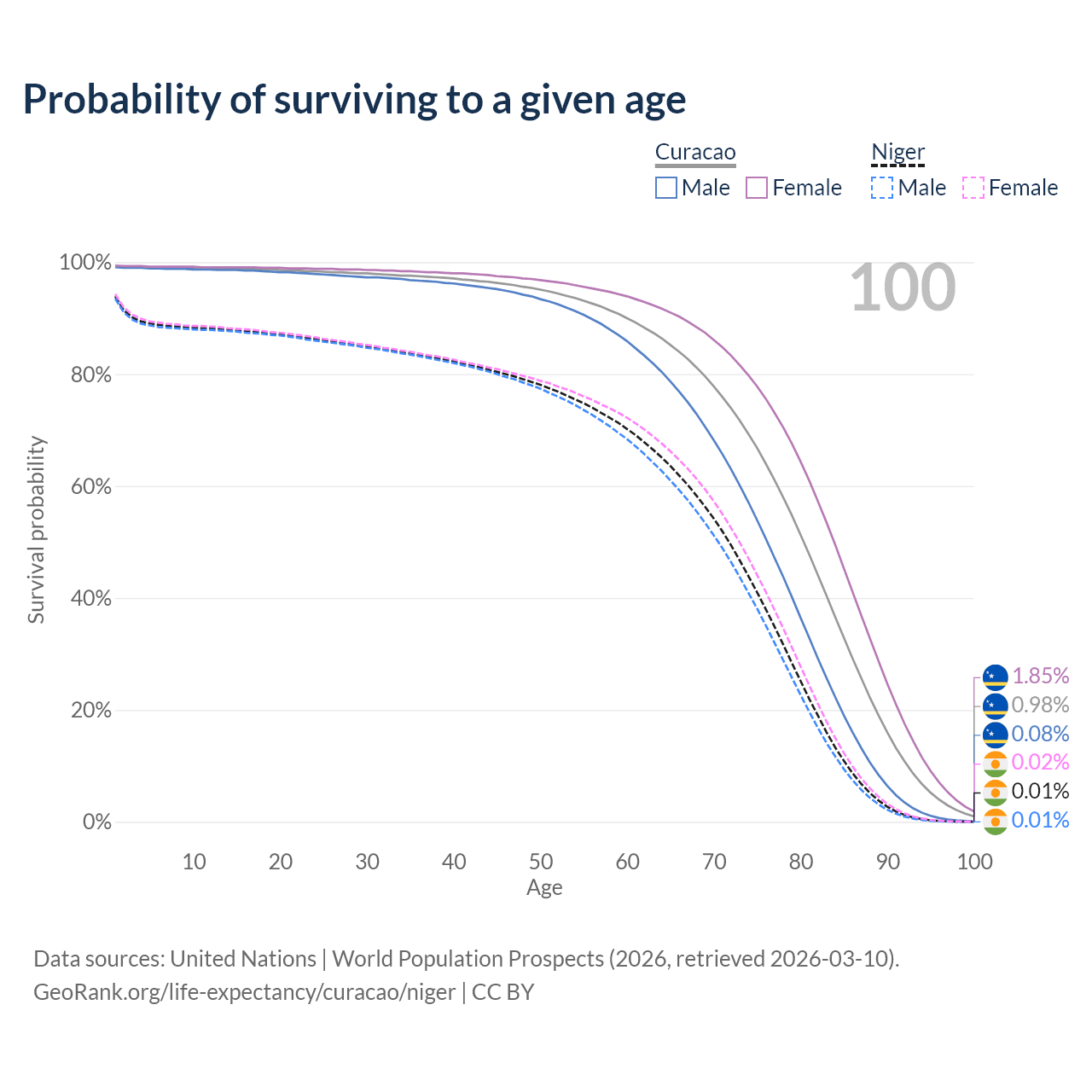 This life expectancy calculator shows the odds of living to 100, 95, 90, and below based on current age for both males and females in Curacao and Niger, along with mean and median age of death. The calculations are based on the 2026 life tables (actuarial tables) from the UN World Population Prospects.