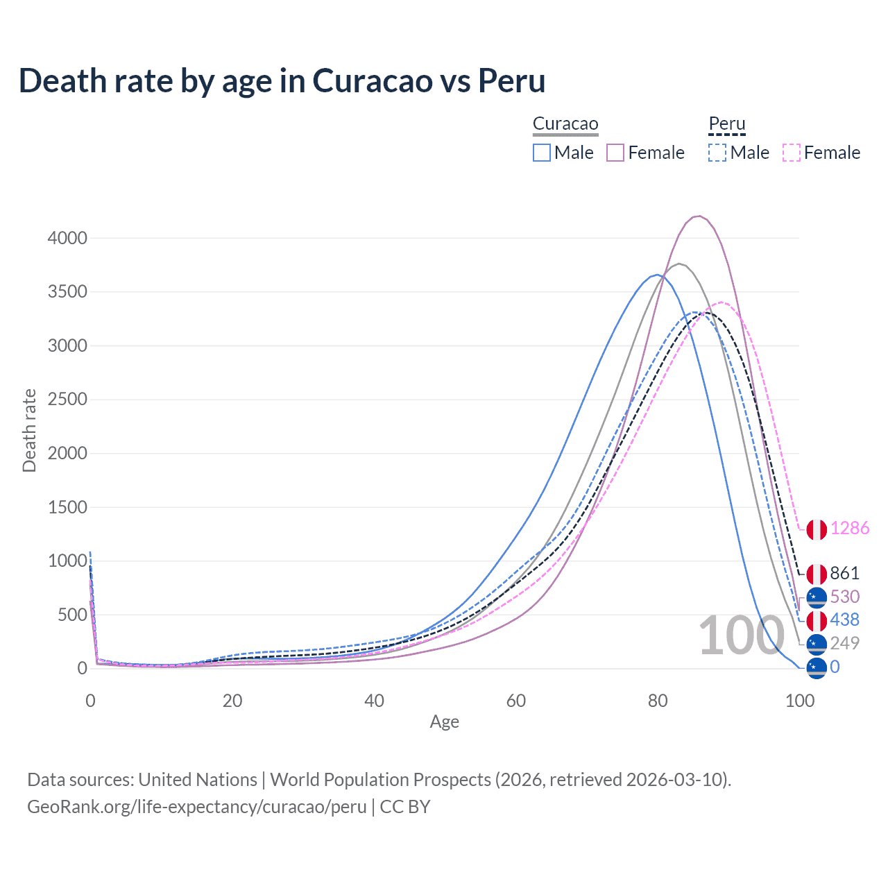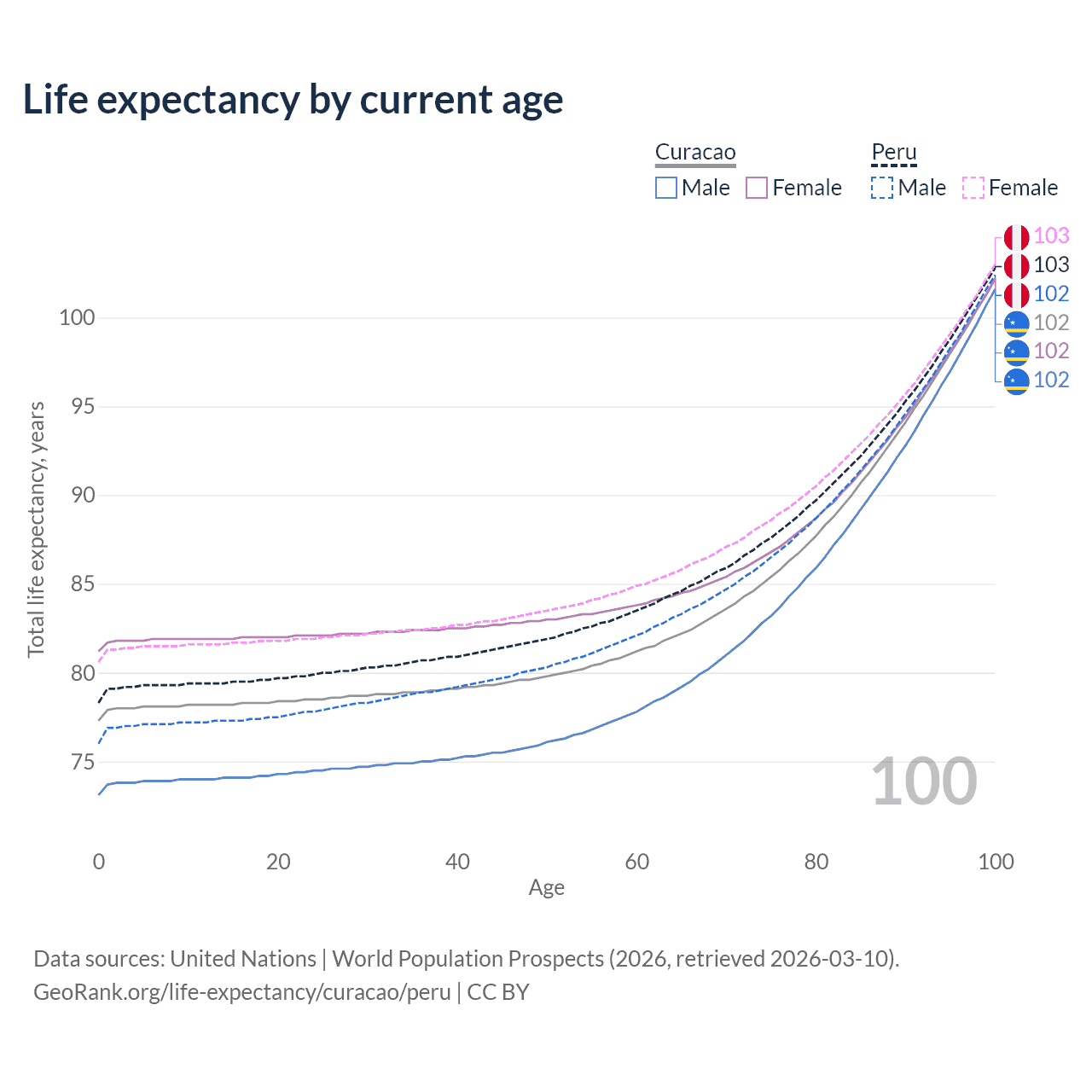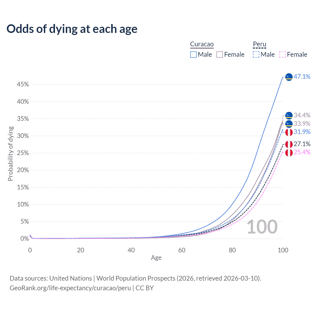 This life expectancy calculator shows the odds of living to 100, 95, 90, and below based on current age for both males and females in Curacao and Peru, along with mean and median age of death. The calculations are based on the 2026 life tables (actuarial tables) from the UN World Population Prospects.