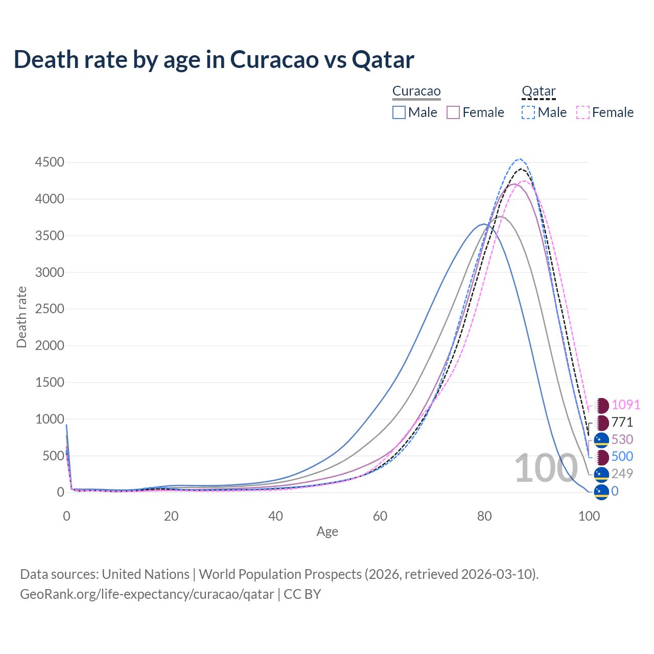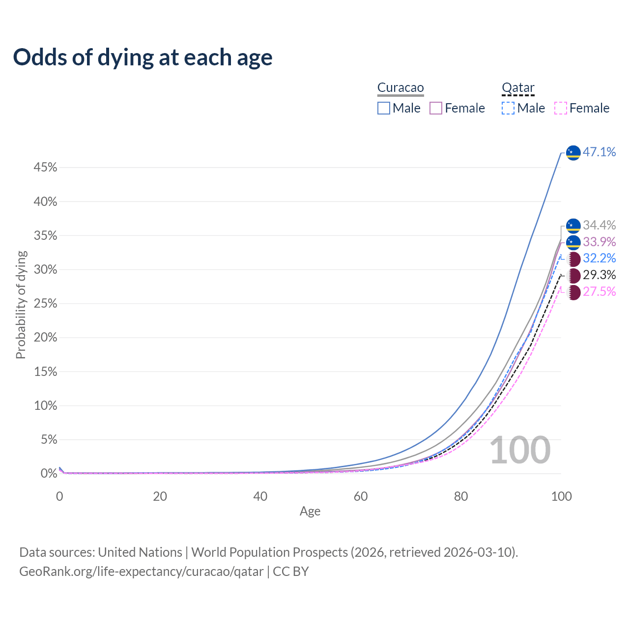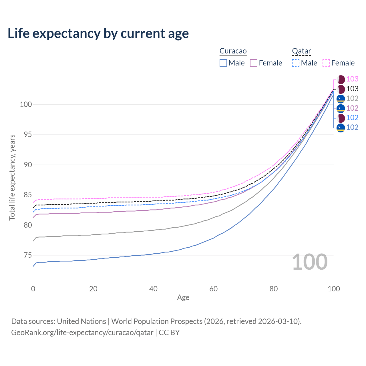 This life expectancy calculator shows the odds of living to 100, 95, 90, and below based on current age for both males and females in Curacao and Qatar, along with mean and median age of death. The calculations are based on the 2026 life tables (actuarial tables) from the UN World Population Prospects.