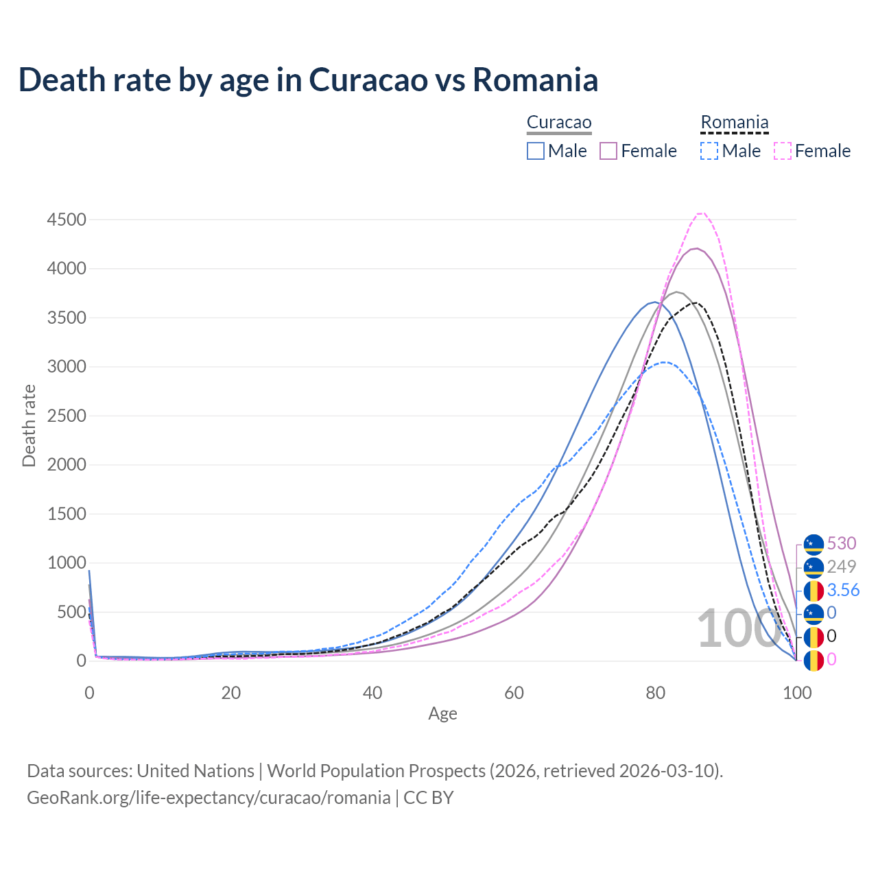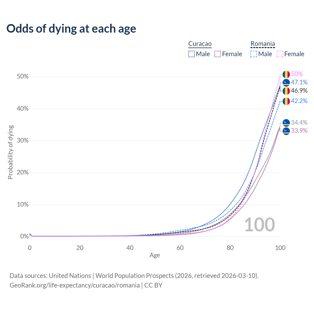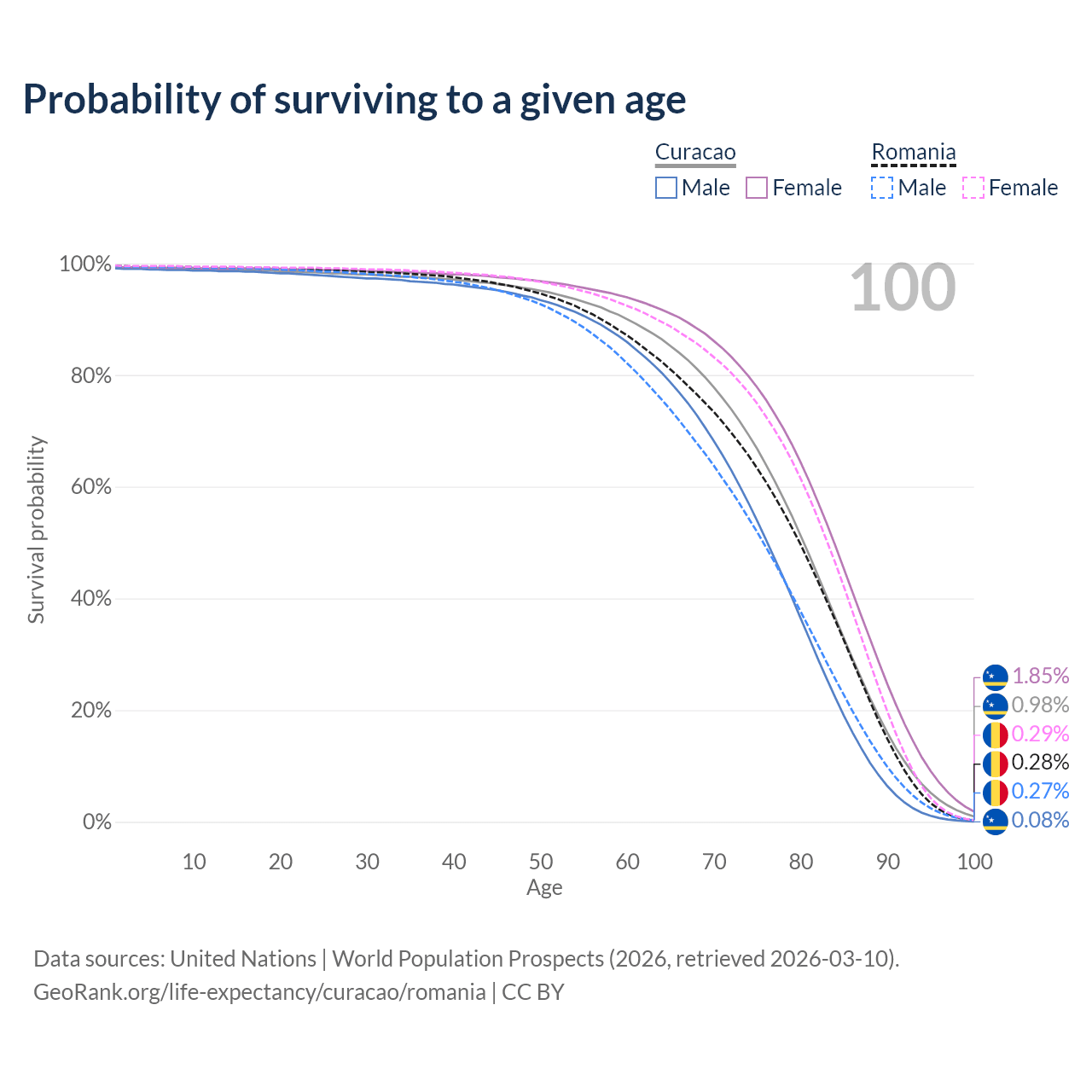 This life expectancy calculator shows the odds of living to 100, 95, 90, and below based on current age for both males and females in Curacao and Romania, along with mean and median age of death. The calculations are based on the 2026 life tables (actuarial tables) from the UN World Population Prospects.