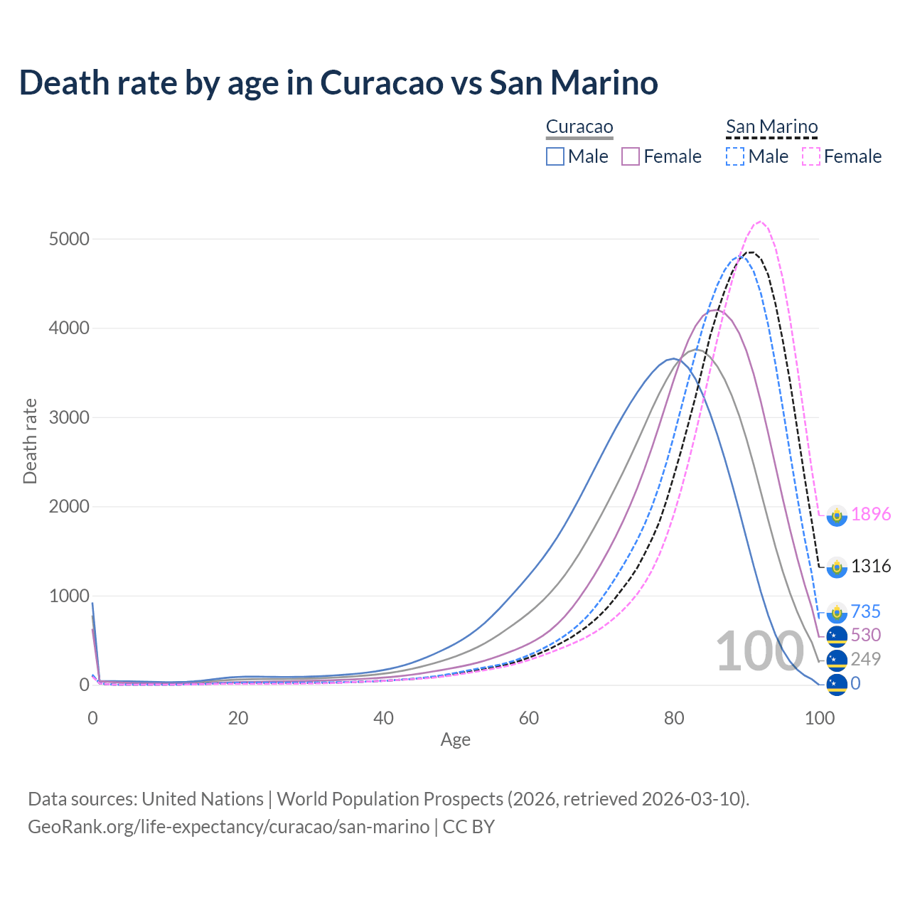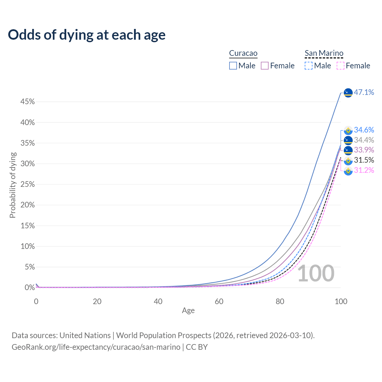 This life expectancy calculator shows the odds of living to 100, 95, 90, and below based on current age for both males and females in Curacao and San Marino, along with mean and median age of death. The calculations are based on the 2026 life tables (actuarial tables) from the UN World Population Prospects.