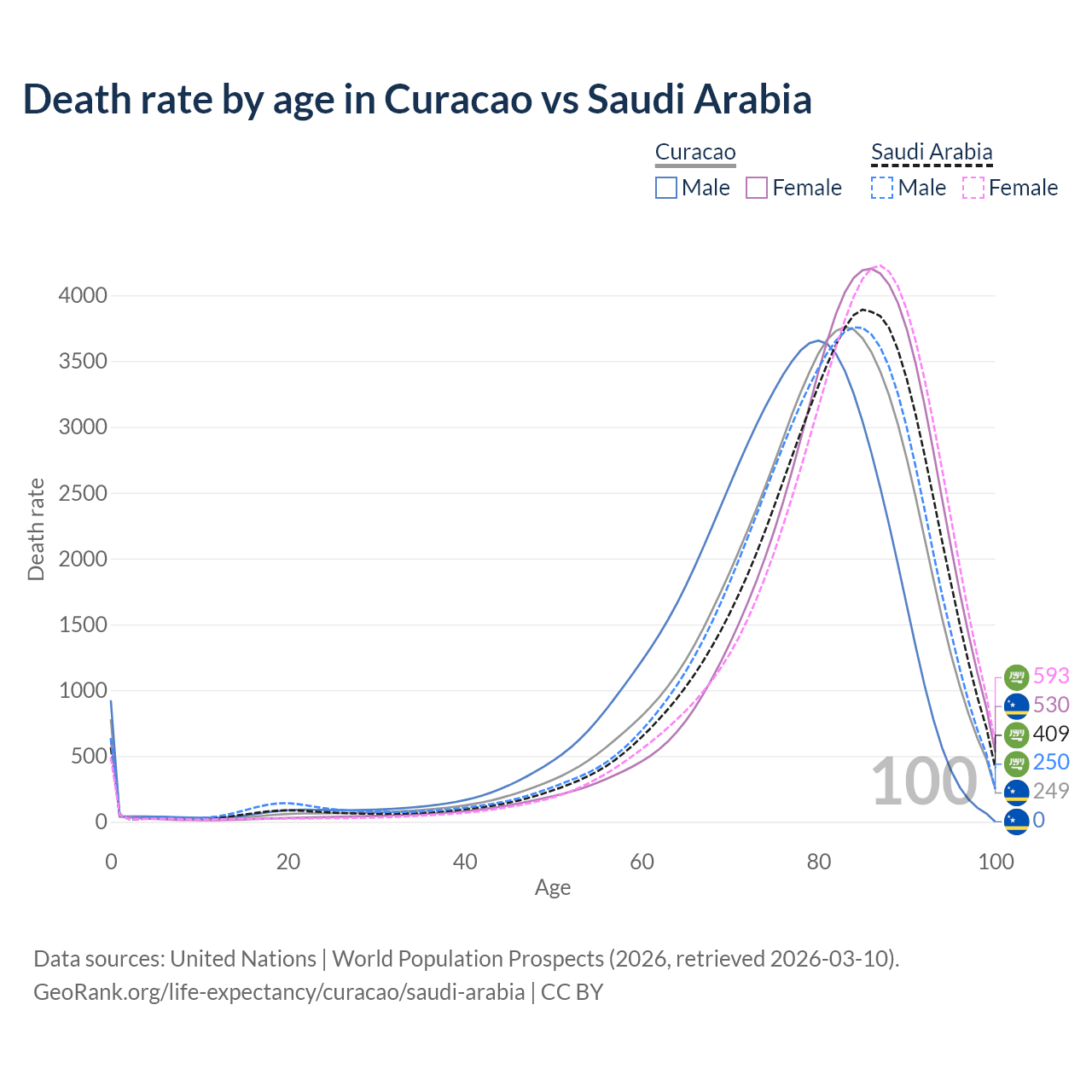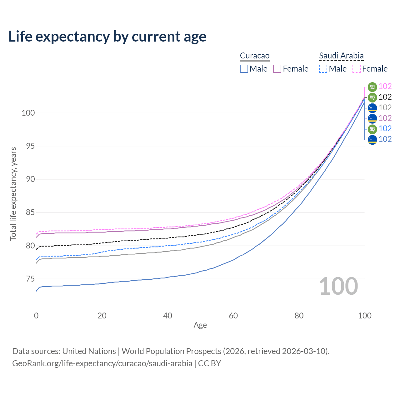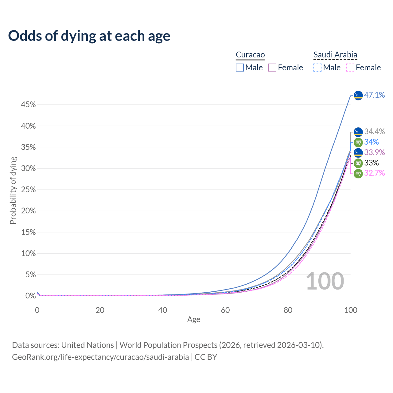 This life expectancy calculator shows the odds of living to 100, 95, 90, and below based on current age for both males and females in Curacao and Saudi Arabia, along with mean and median age of death. The calculations are based on the 2026 life tables (actuarial tables) from the UN World Population Prospects.