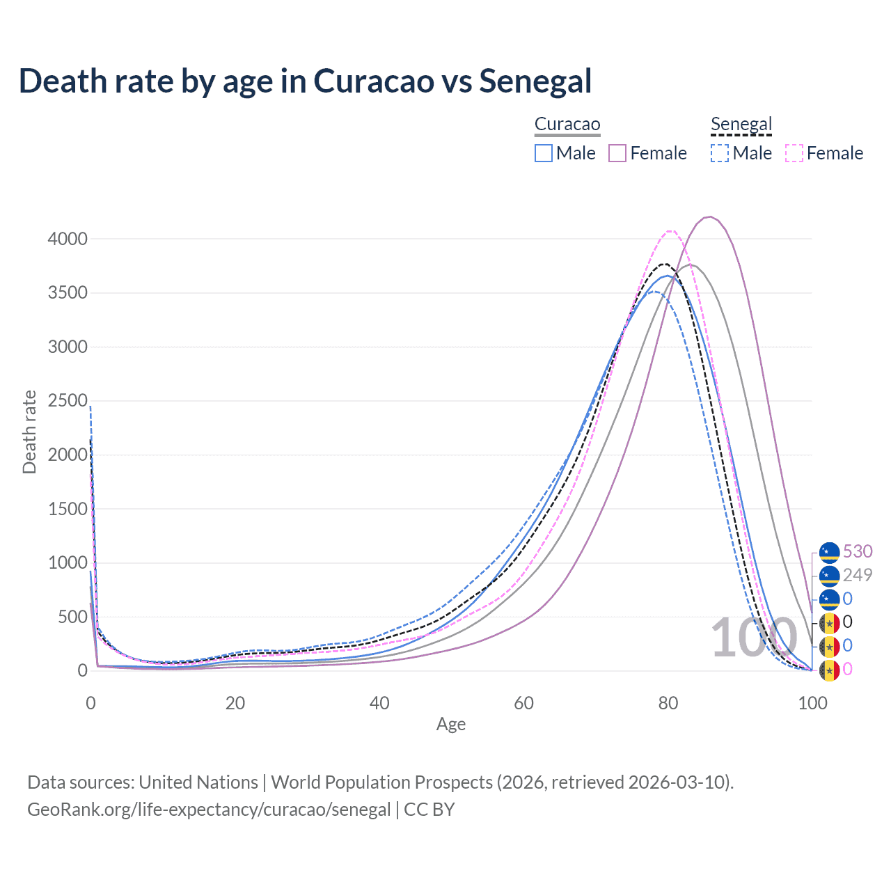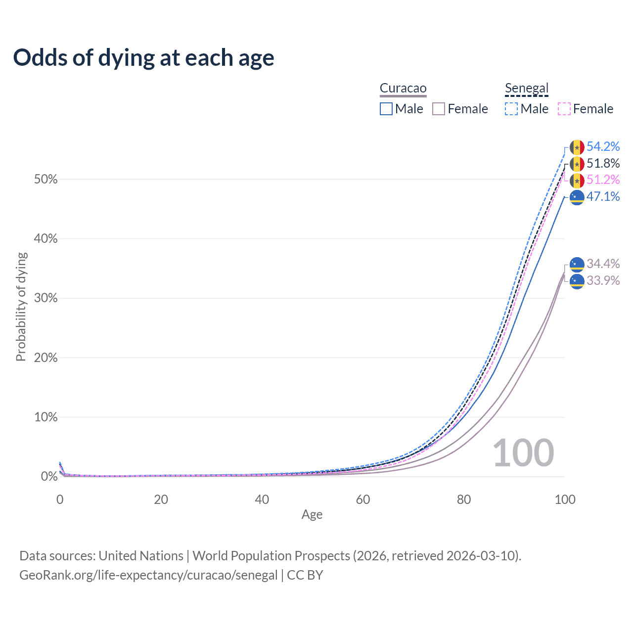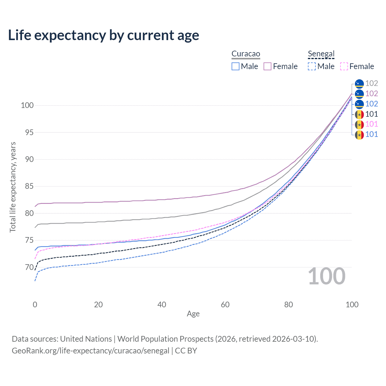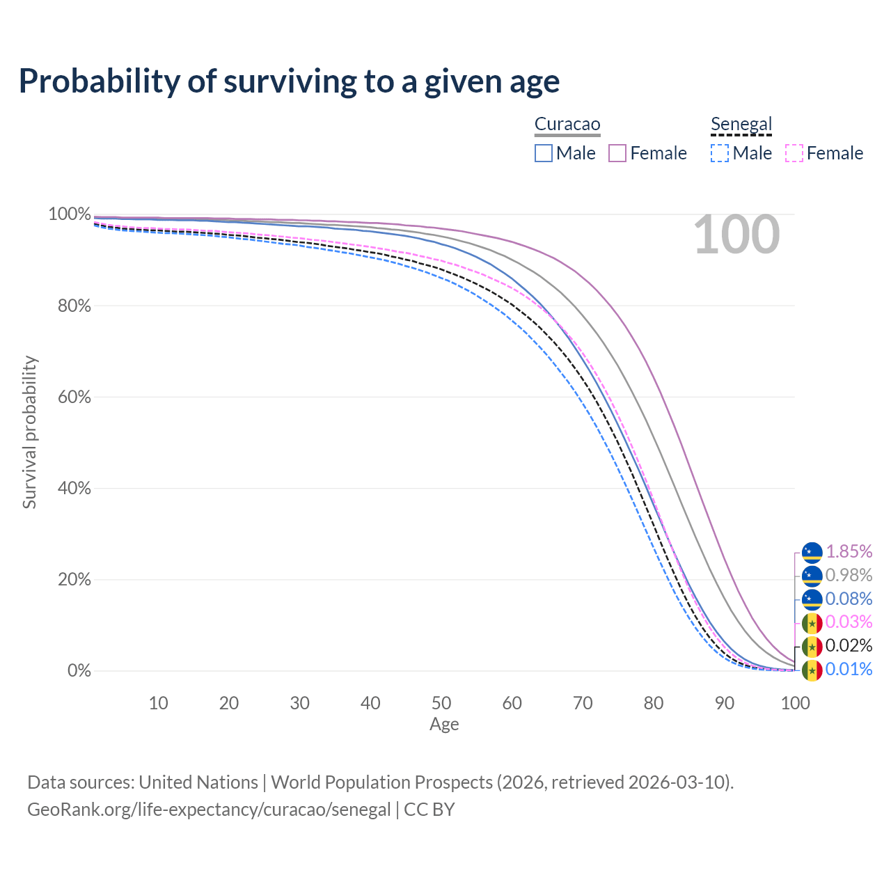 This life expectancy calculator shows the odds of living to 100, 95, 90, and below based on current age for both males and females in Curacao and Senegal, along with mean and median age of death. The calculations are based on the 2026 life tables (actuarial tables) from the UN World Population Prospects.