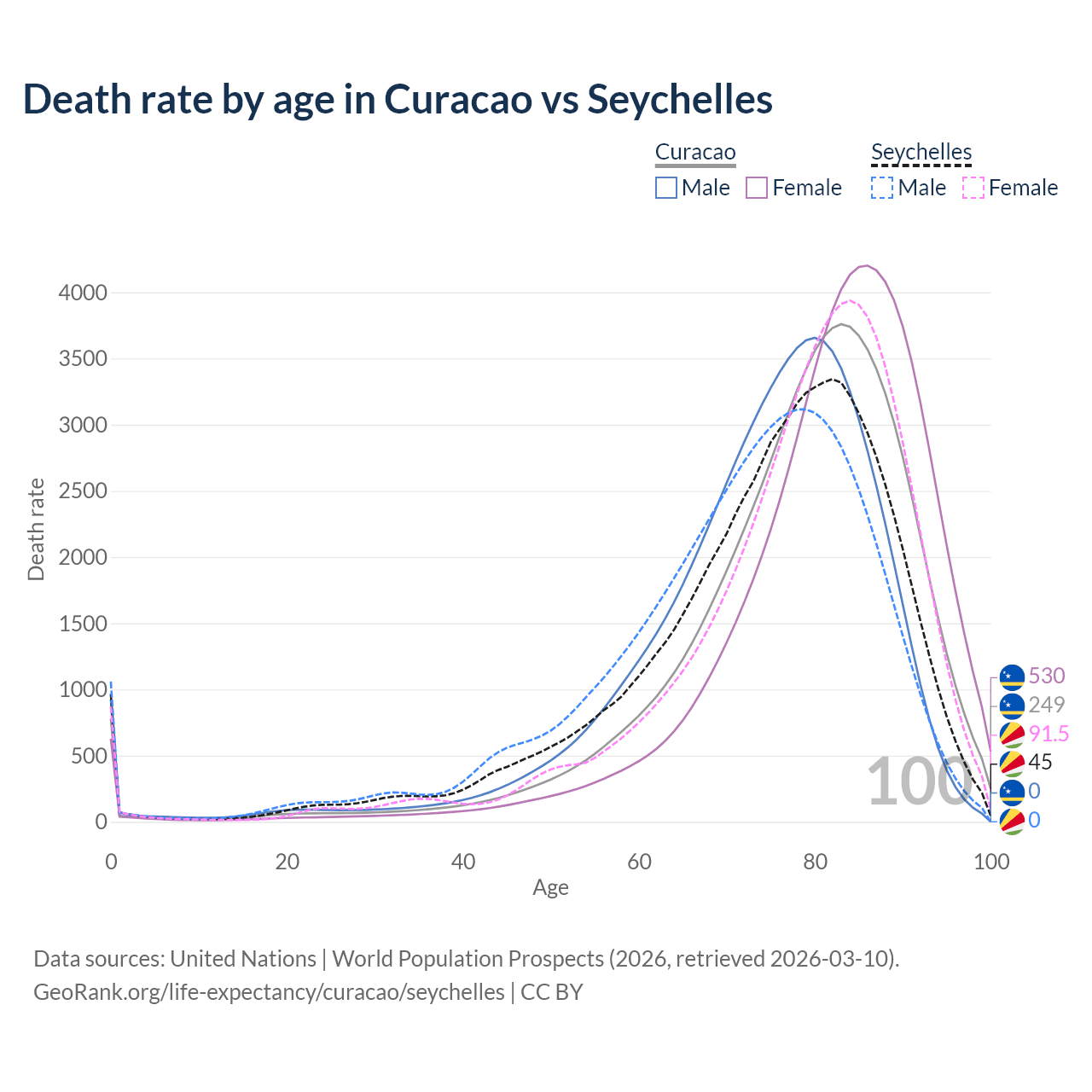 In Curacao, the most common age of death is 83, compared to 82 in the Seychelles. The median age of death is 80.4 in Curacao and 77 in the Seychelles, meaning only half of each cohort is expected to live past that age.