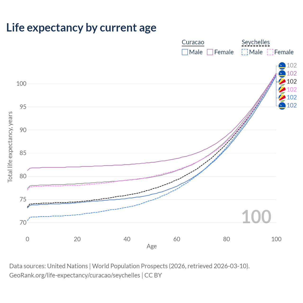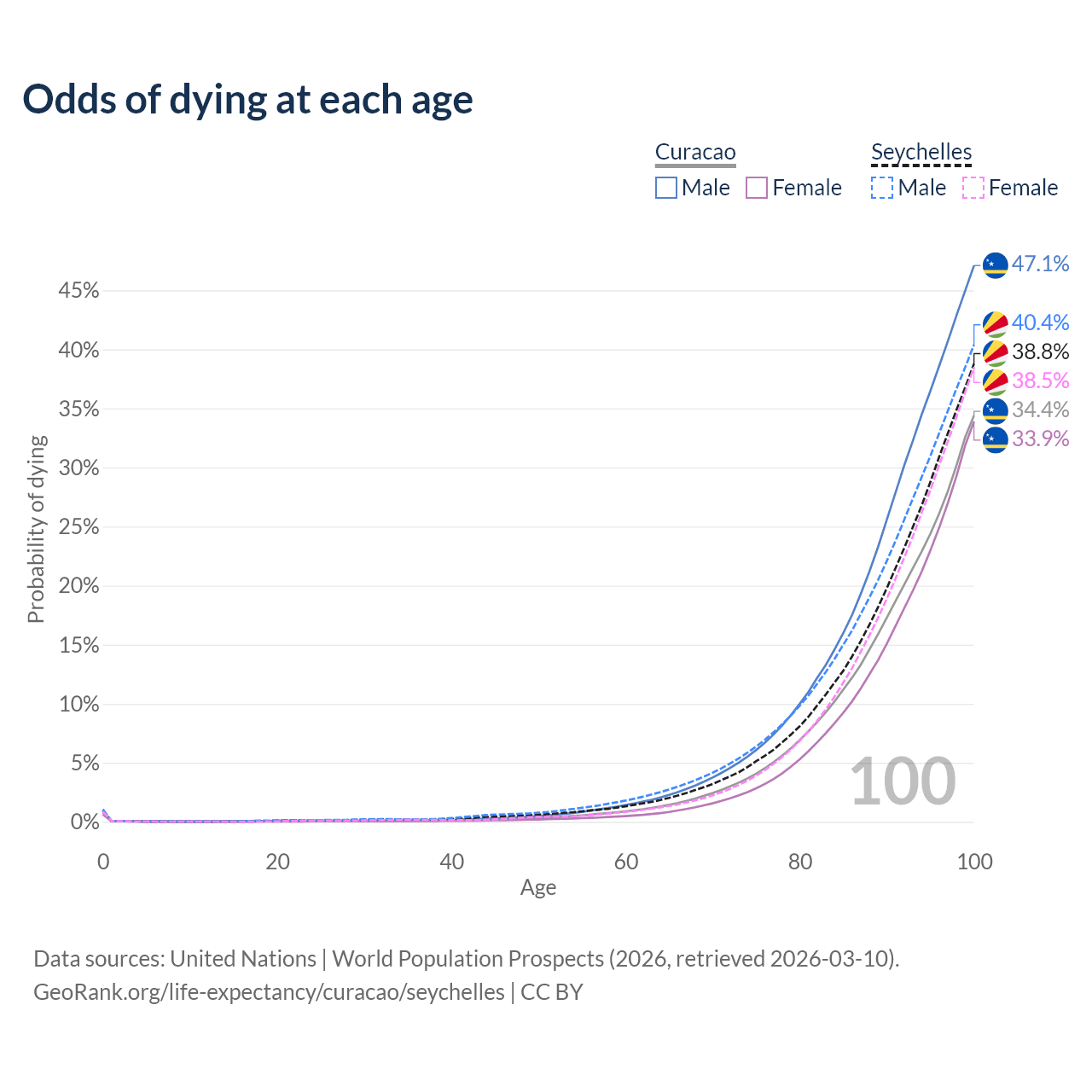 This life expectancy calculator shows the odds of living to 100, 95, 90, and below based on current age for both males and females in Curacao and the Seychelles, along with mean and median age of death. The calculations are based on the 2026 life tables (actuarial tables) from the UN World Population Prospects.