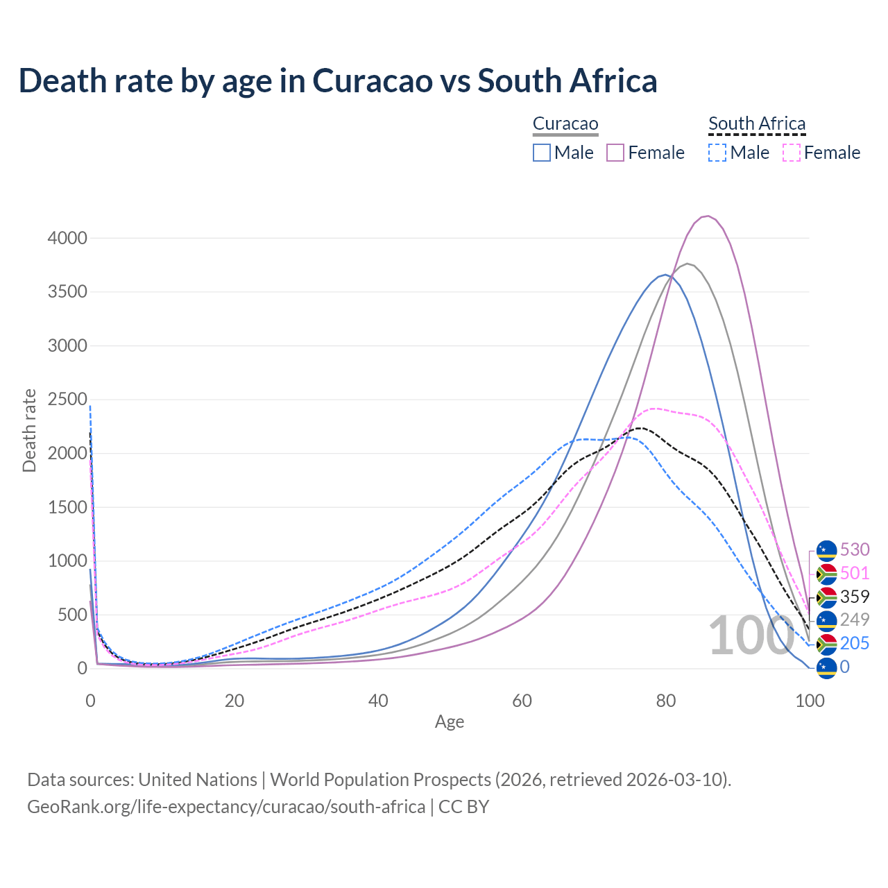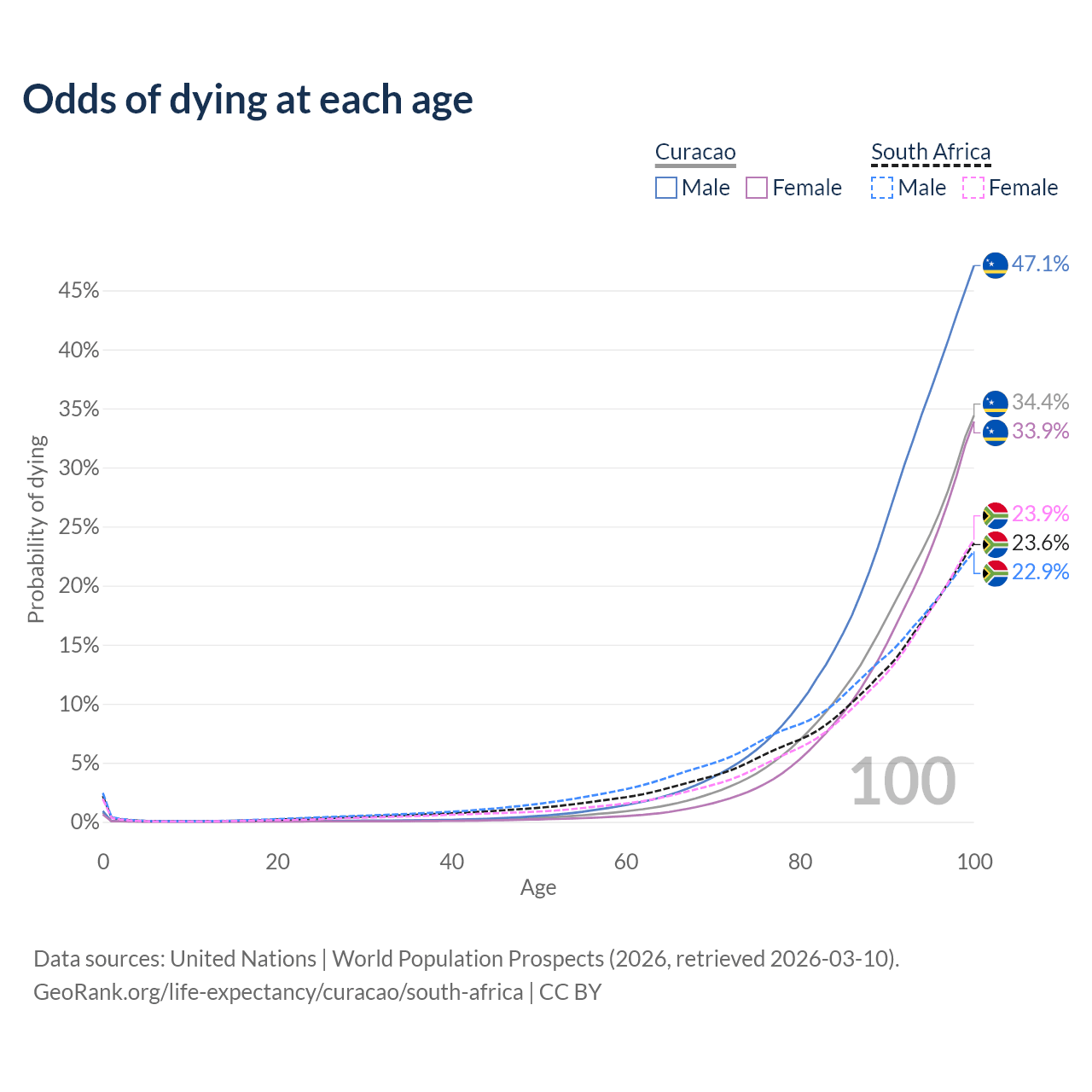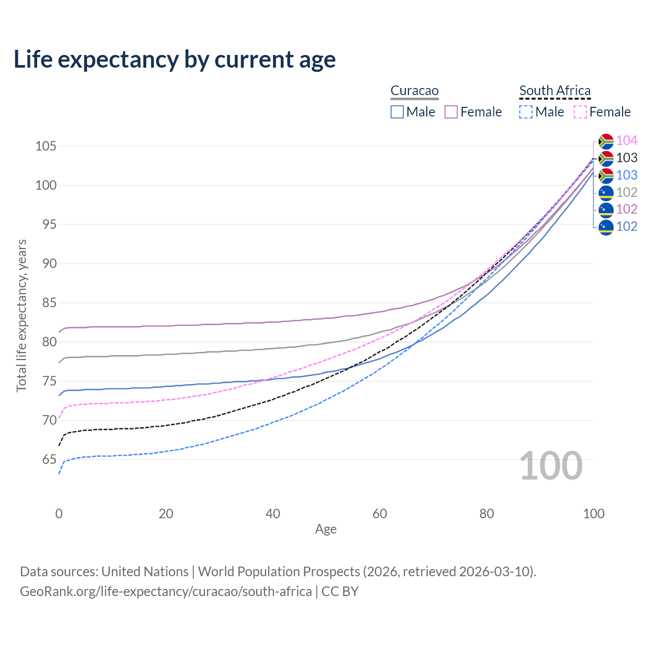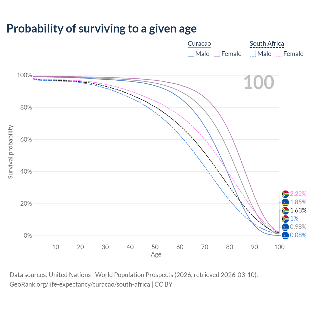 This life expectancy calculator shows the odds of living to 100, 95, 90, and below based on current age for both males and females in Curacao and South Africa, along with mean and median age of death. The calculations are based on the 2026 life tables (actuarial tables) from the UN World Population Prospects.