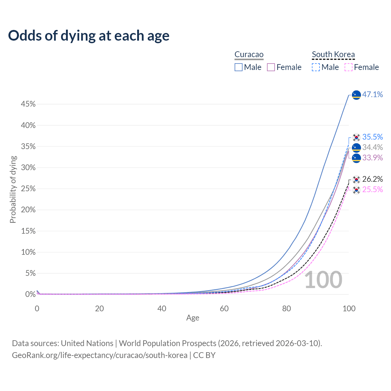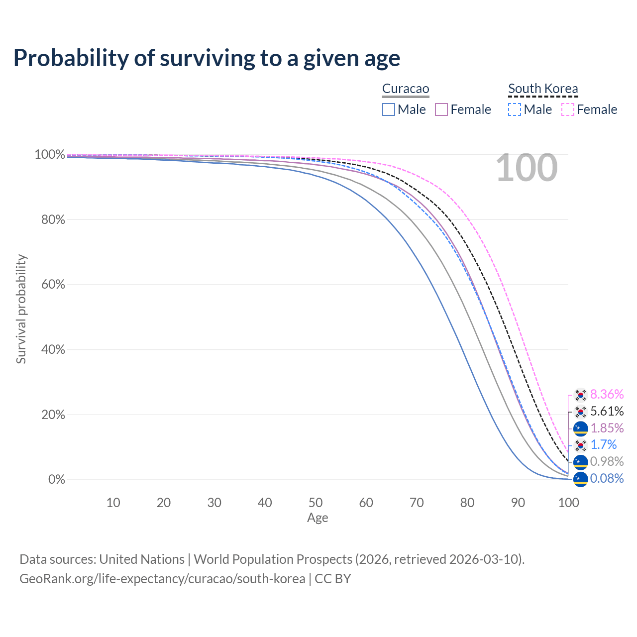 This life expectancy calculator shows the odds of living to 100, 95, 90, and below based on current age for both males and females in Curacao and South Korea, along with mean and median age of death. The calculations are based on the 2026 life tables (actuarial tables) from the UN World Population Prospects.