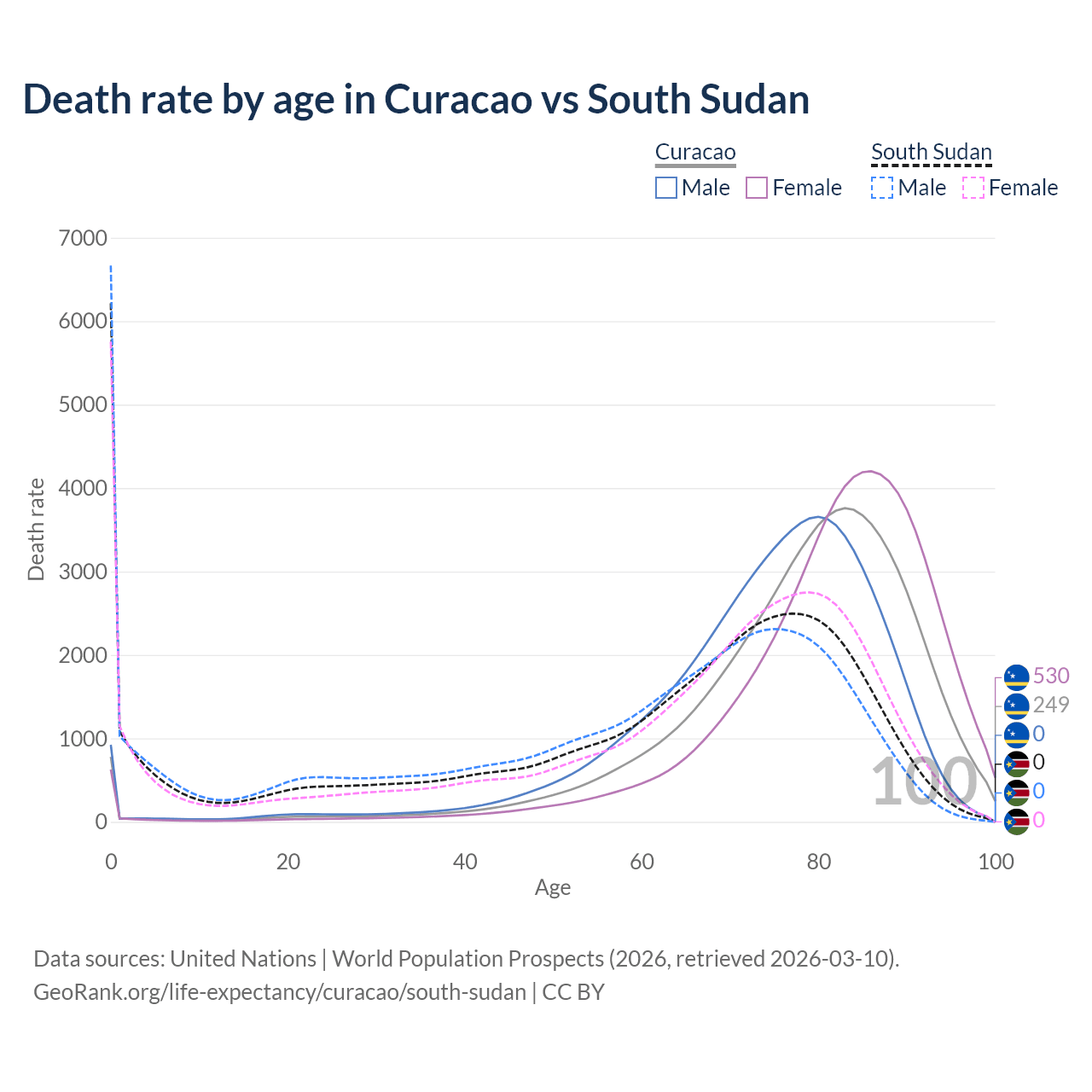 In Curacao, the most common age of death is 83, compared to 0 in South Sudan. The median age of death is 80.4 in Curacao and 67.5 in South Sudan, meaning only half of each cohort is expected to live past that age.