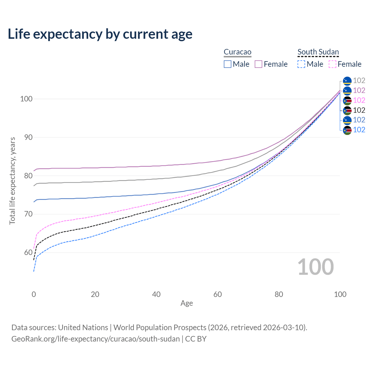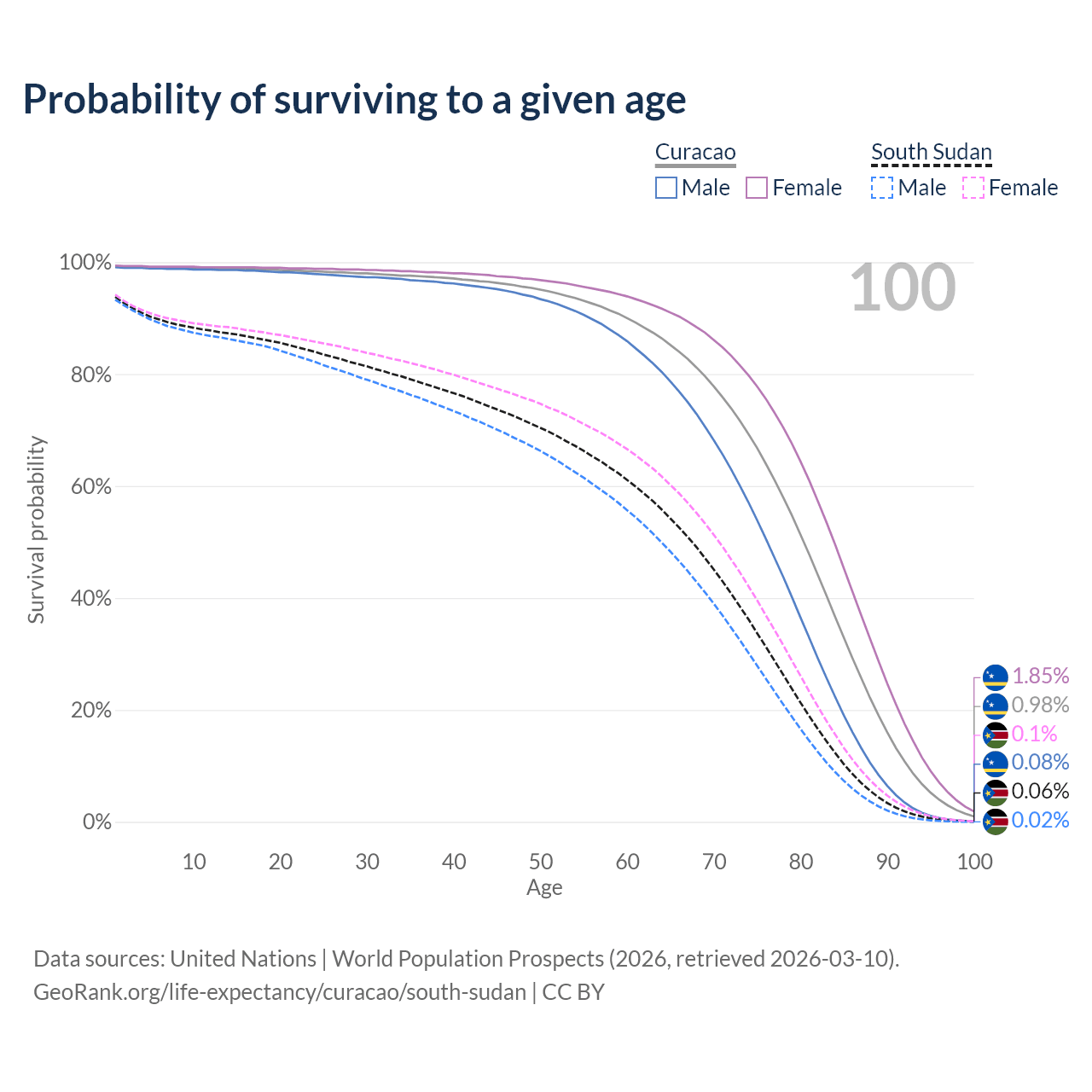 This life expectancy calculator shows the odds of living to 100, 95, 90, and below based on current age for both males and females in Curacao and South Sudan, along with mean and median age of death. The calculations are based on the 2026 life tables (actuarial tables) from the UN World Population Prospects.