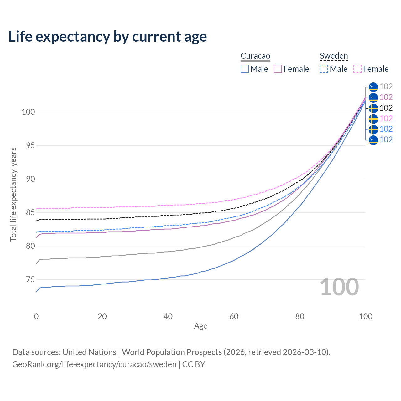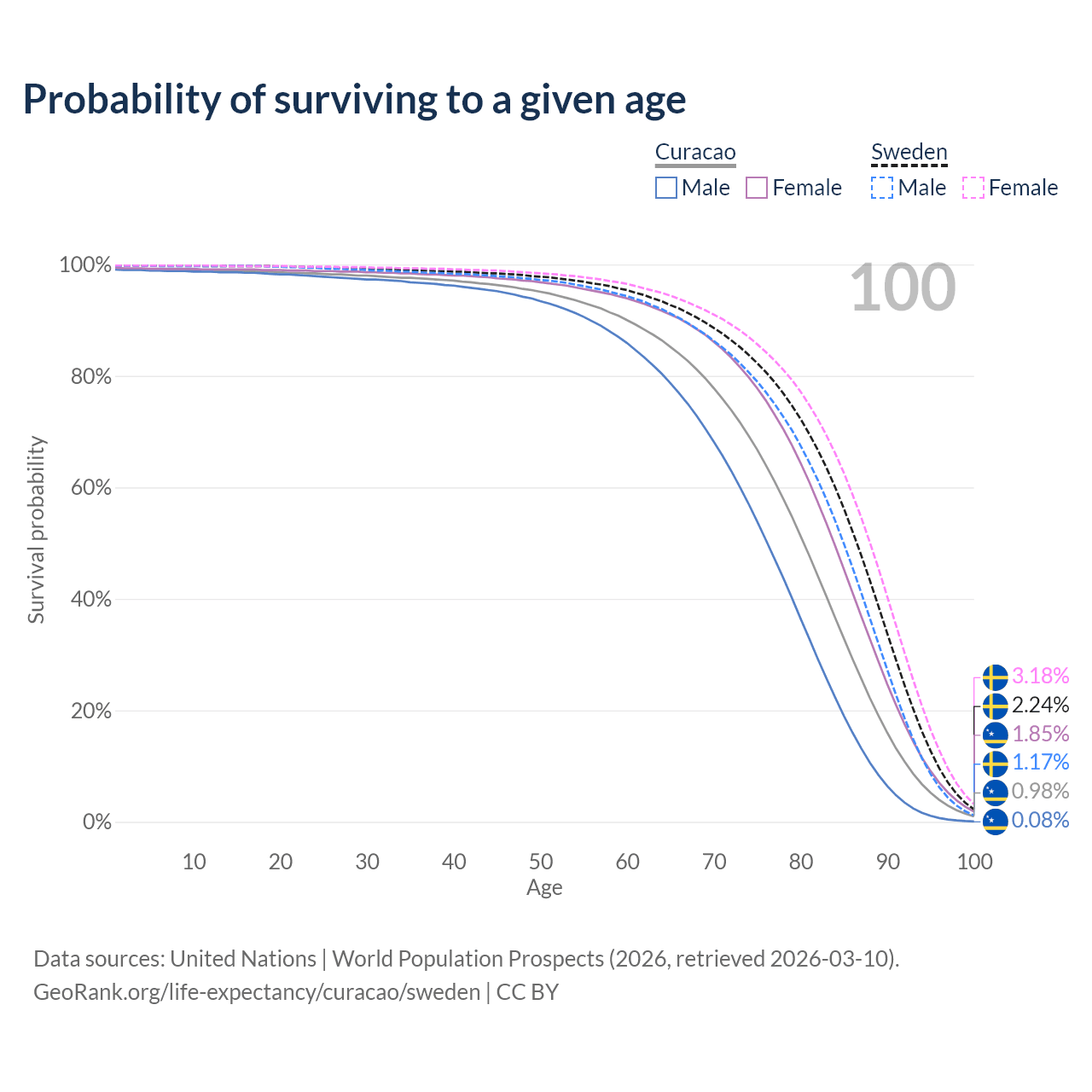 This life expectancy calculator shows the odds of living to 100, 95, 90, and below based on current age for both males and females in Curacao and Sweden, along with mean and median age of death. The calculations are based on the 2026 life tables (actuarial tables) from the UN World Population Prospects.