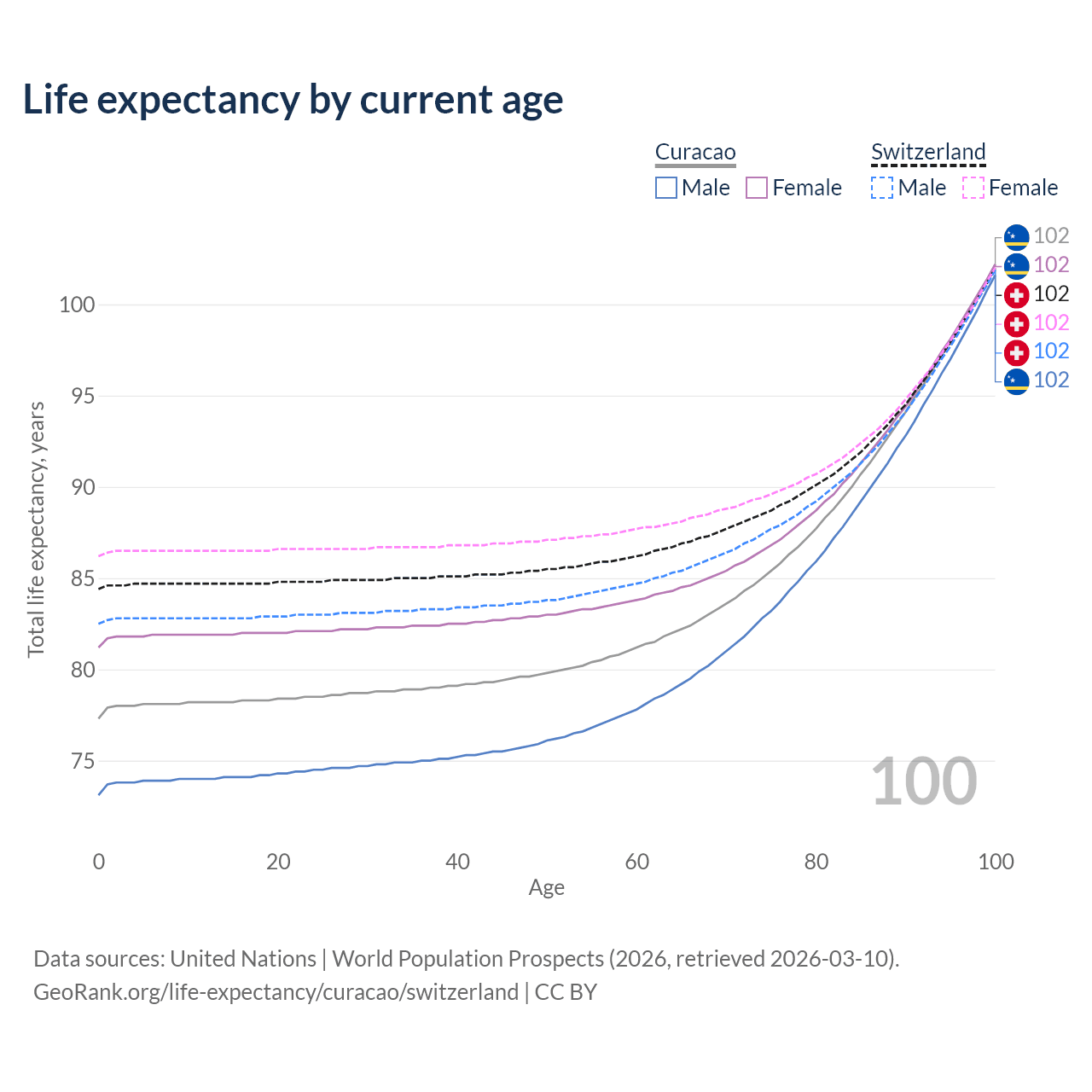 This life expectancy calculator shows the odds of living to 100, 95, 90, and below based on current age for both males and females in Curacao and Switzerland, along with mean and median age of death. The calculations are based on the 2026 life tables (actuarial tables) from the UN World Population Prospects.