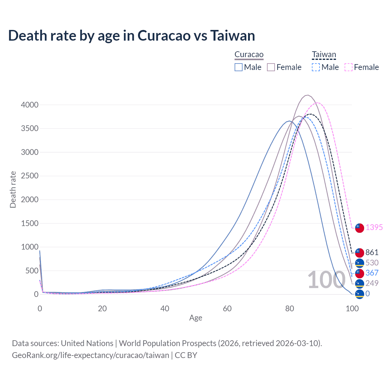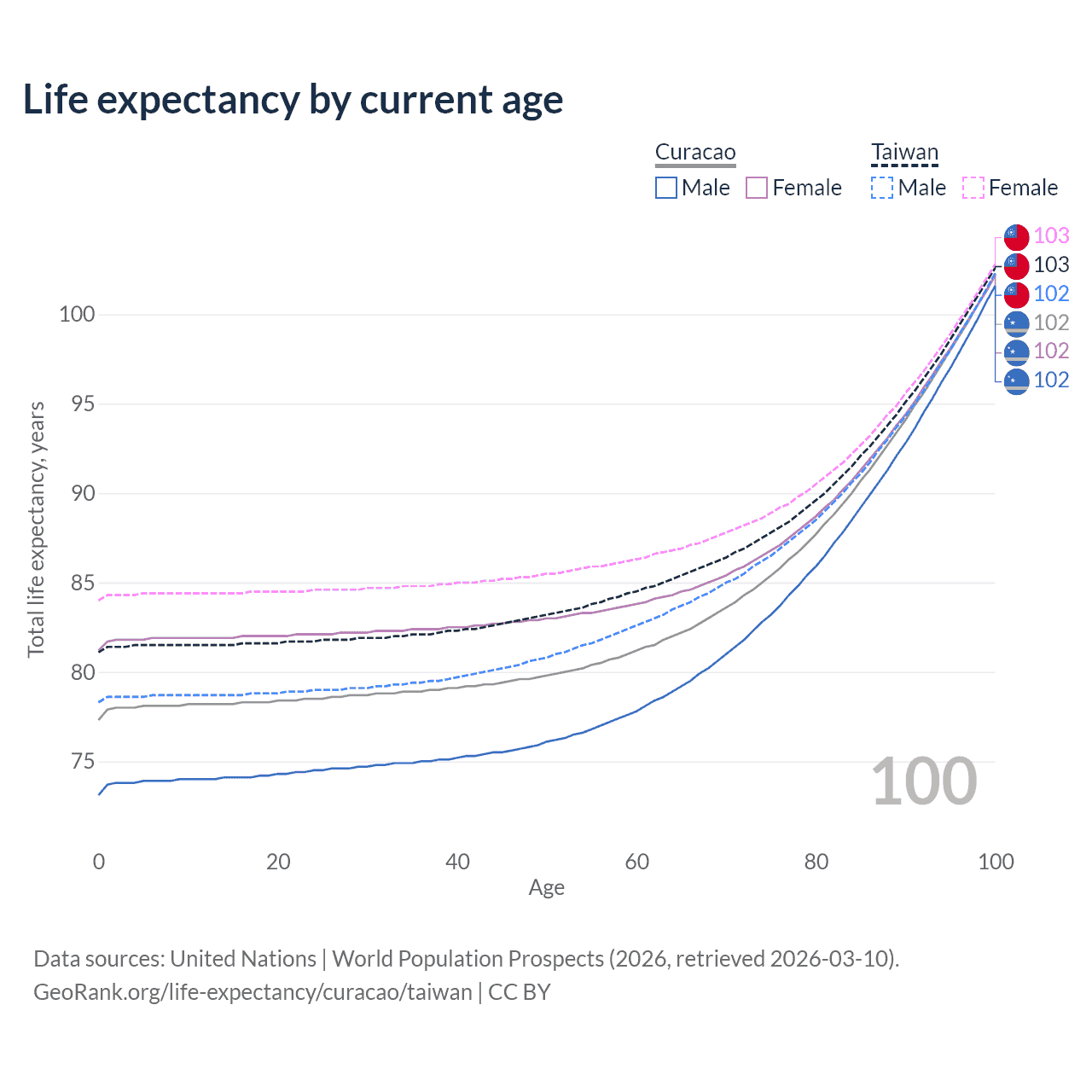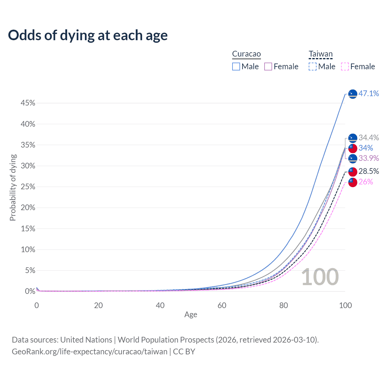 This life expectancy calculator shows the odds of living to 100, 95, 90, and below based on current age for both males and females in Curacao and Taiwan, along with mean and median age of death. The calculations are based on the 2026 life tables (actuarial tables) from the UN World Population Prospects.