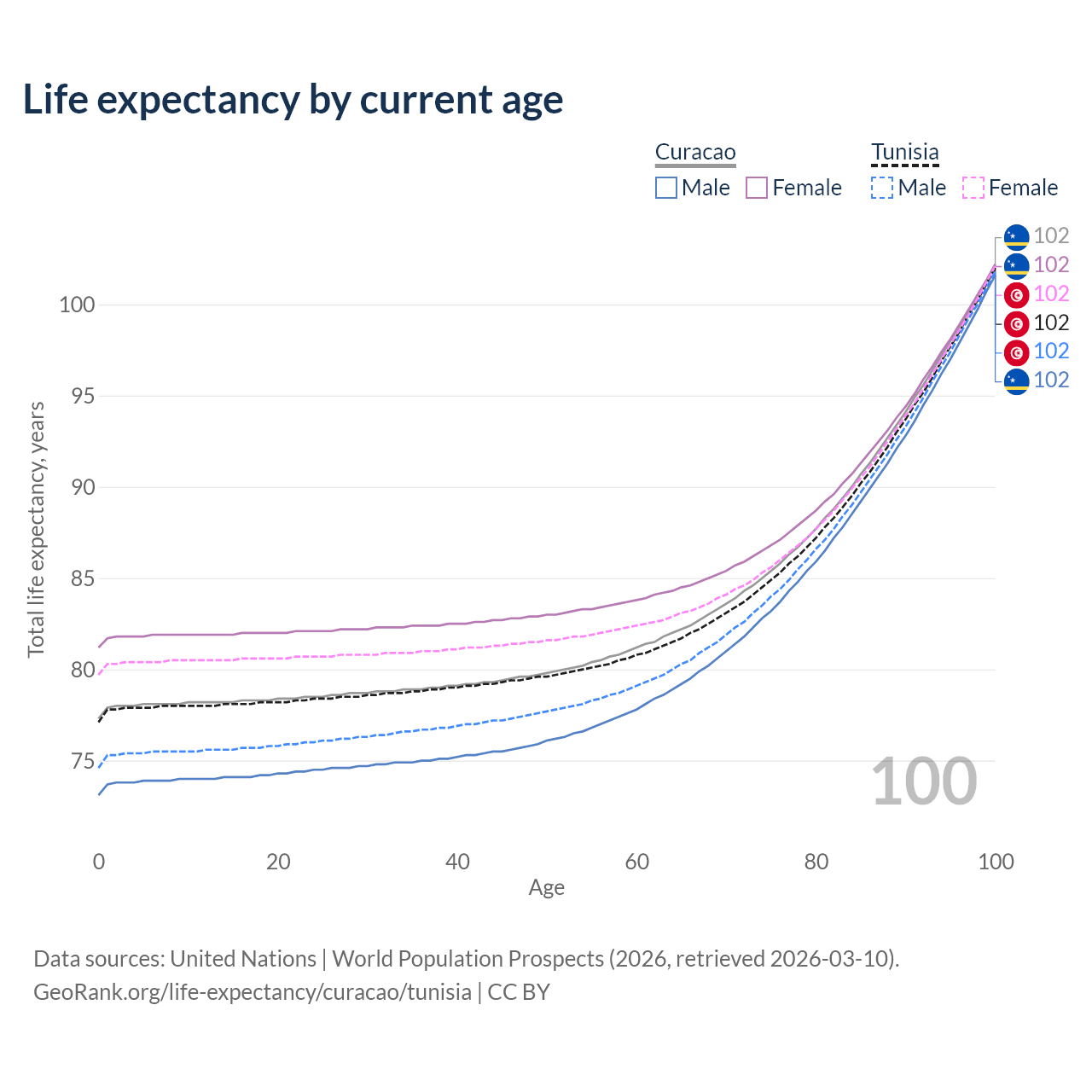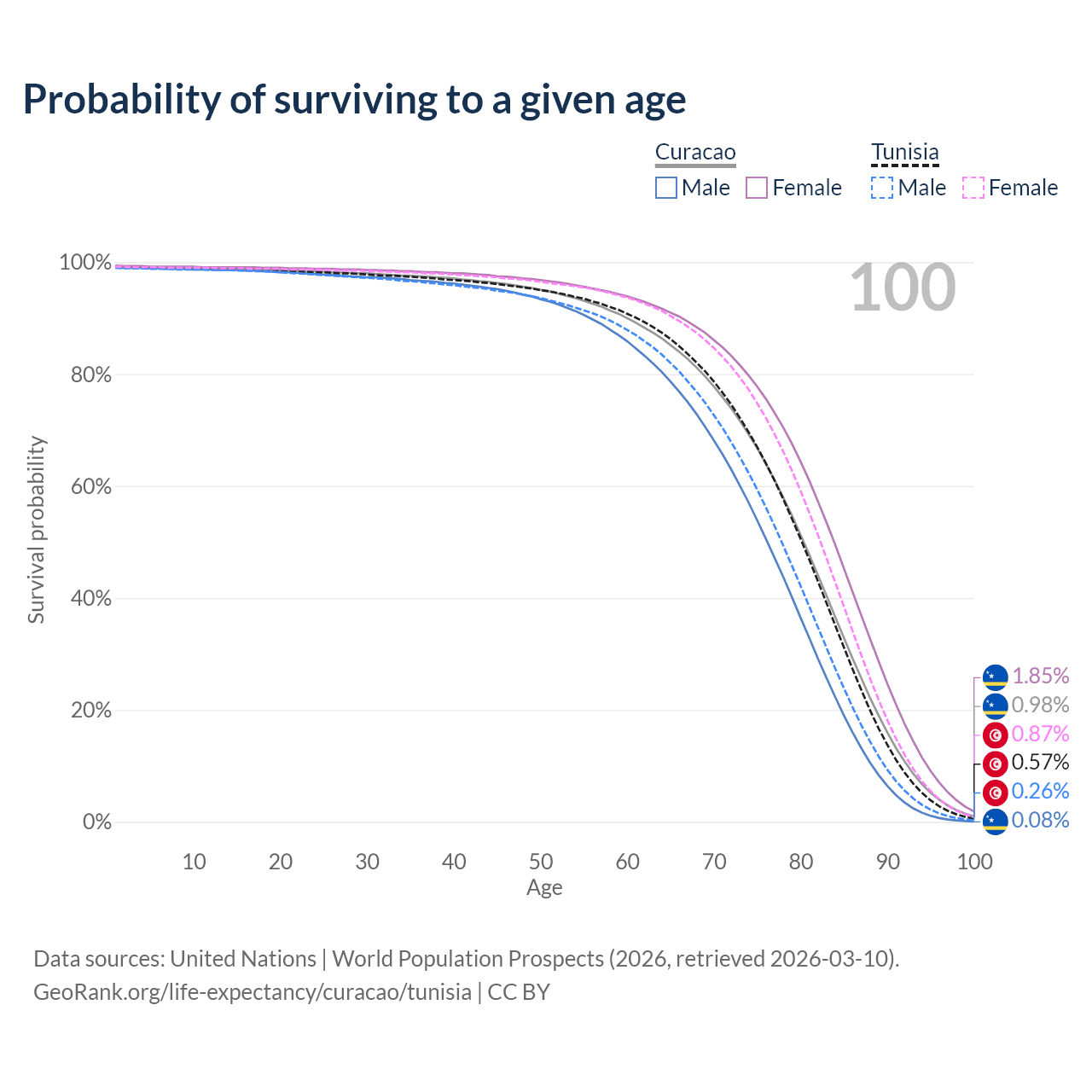This life expectancy calculator shows the odds of living to 100, 95, 90, and below based on current age for both males and females in Curacao and Tunisia, along with mean and median age of death. The calculations are based on the 2026 life tables (actuarial tables) from the UN World Population Prospects.