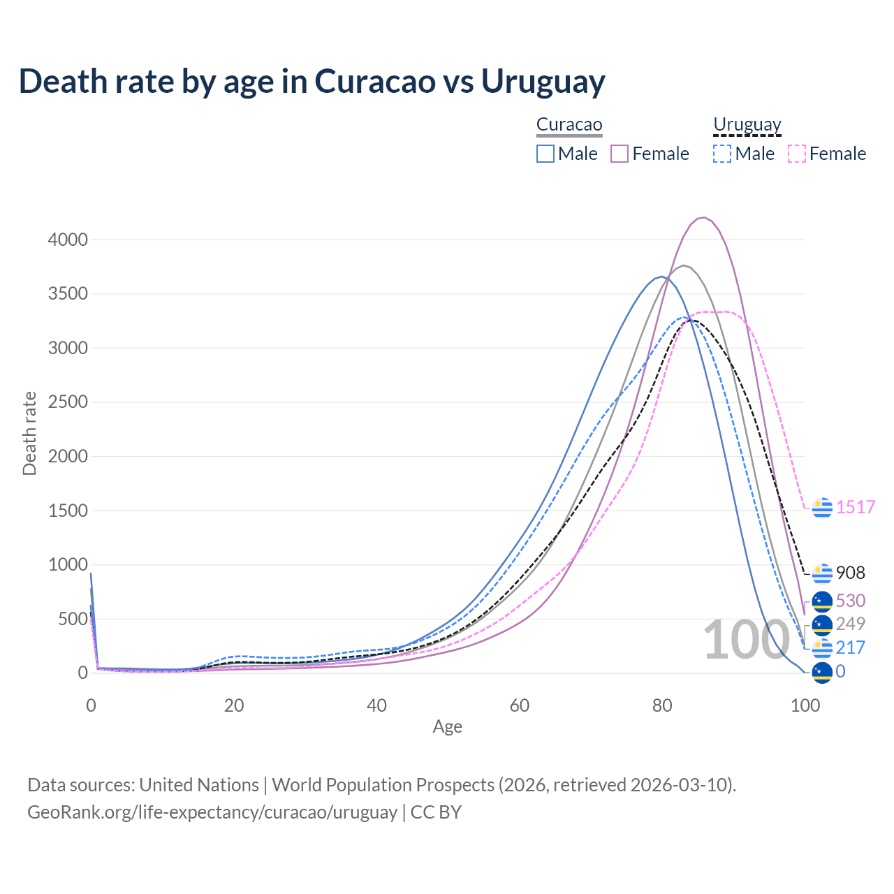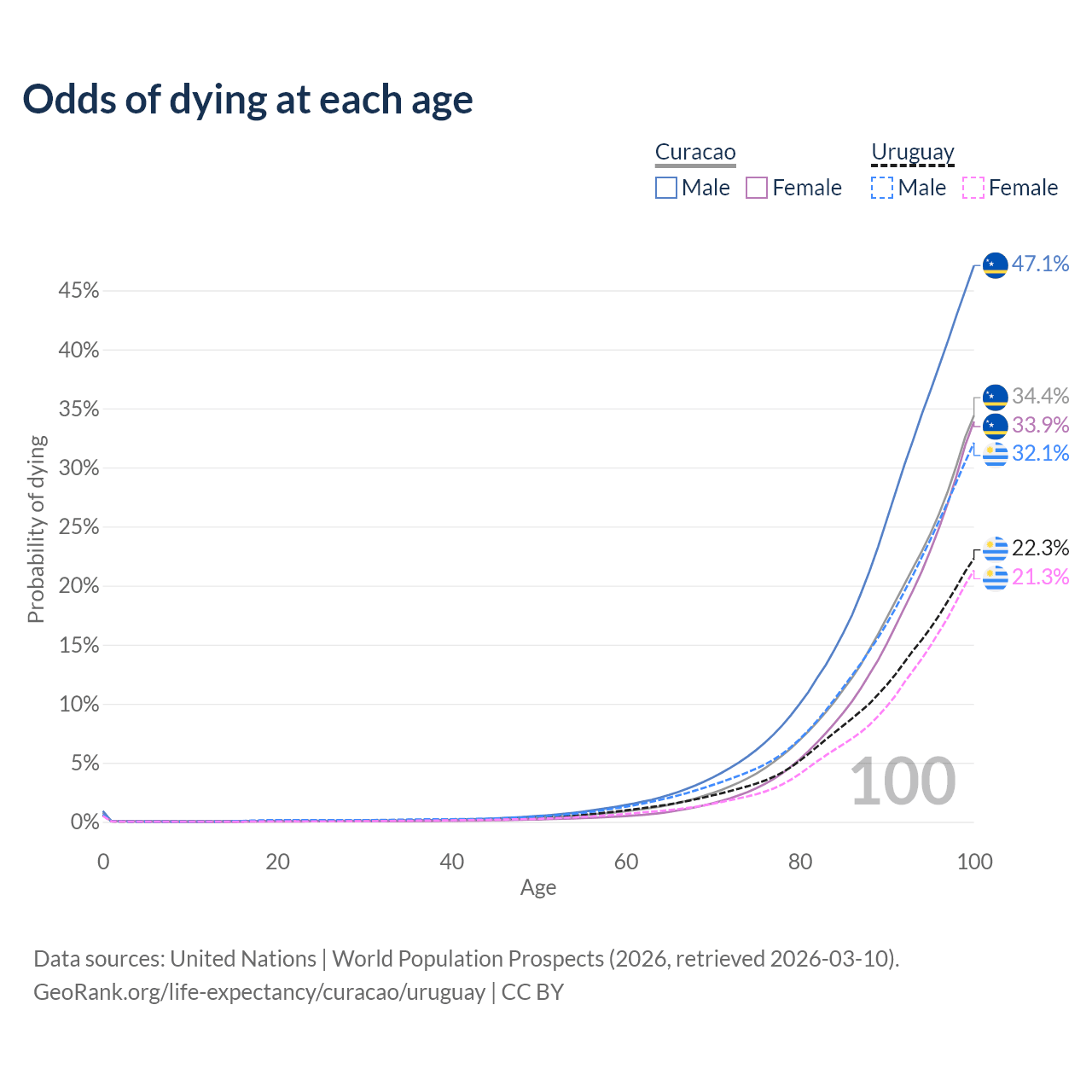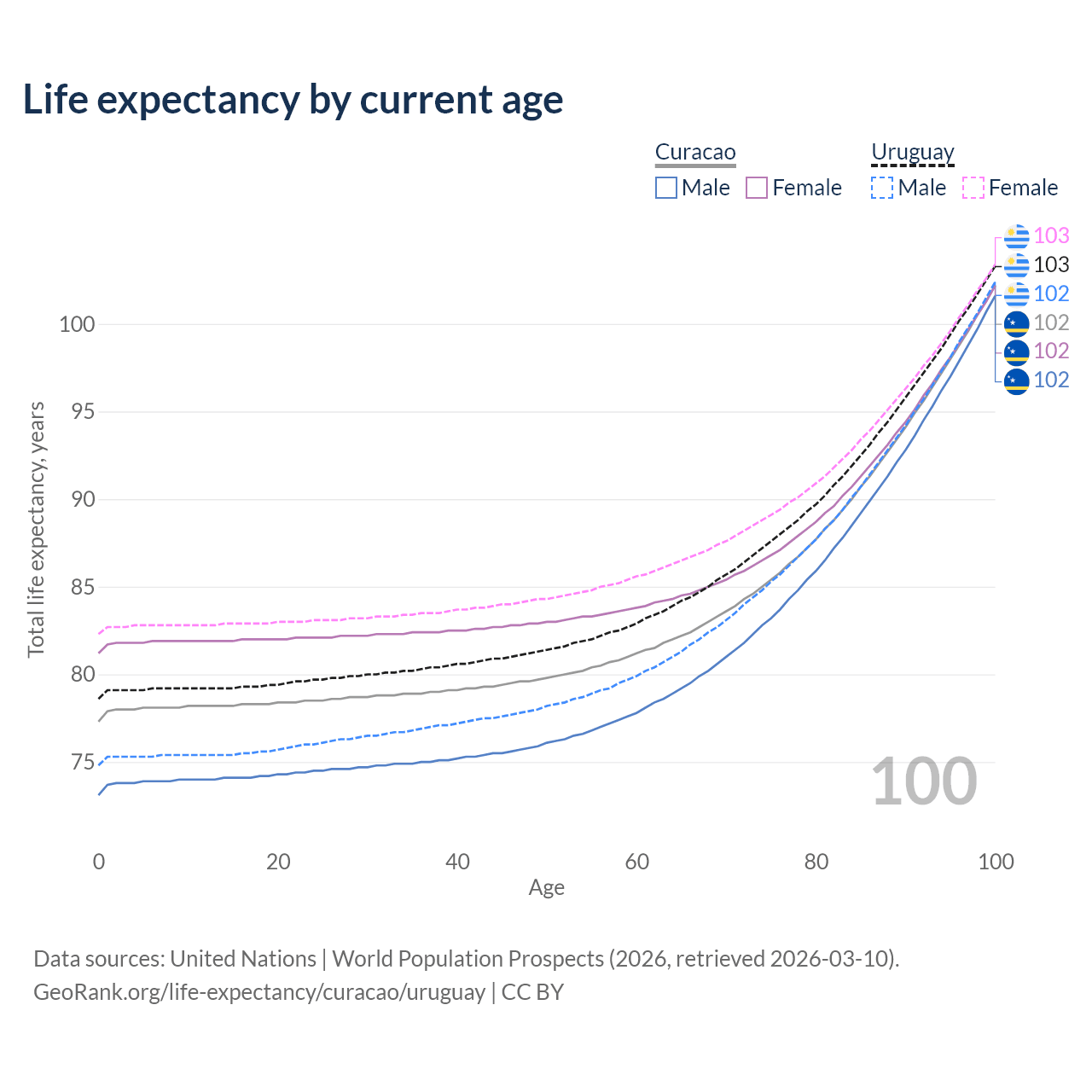 This life expectancy calculator shows the odds of living to 100, 95, 90, and below based on current age for both males and females in Curacao and Uruguay, along with mean and median age of death. The calculations are based on the 2026 life tables (actuarial tables) from the UN World Population Prospects.