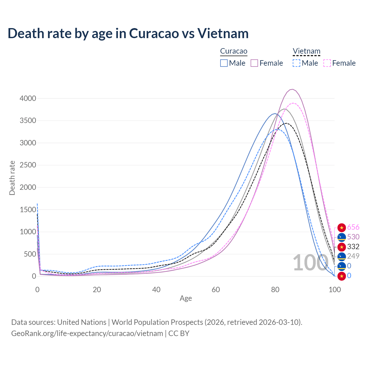In Curacao, the most common age of death is 83, compared to 84 in Vietnam. The median age of death is 80.4 in Curacao and 79.9 in Vietnam, meaning only half of each cohort is expected to live past that age.