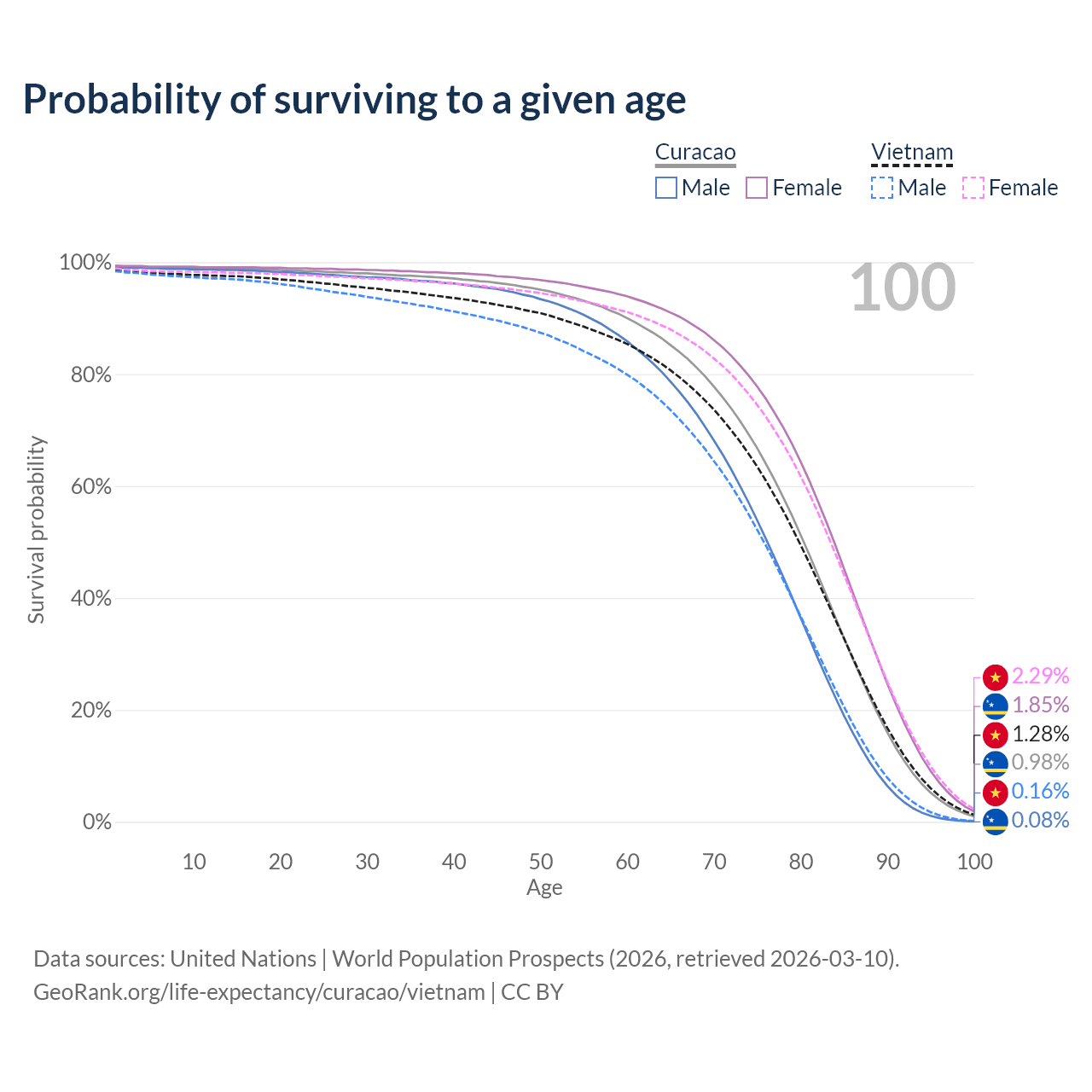 This life expectancy calculator shows the odds of living to 100, 95, 90, and below based on current age for both males and females in Curacao and Vietnam, along with mean and median age of death. The calculations are based on the 2026 life tables (actuarial tables) from the UN World Population Prospects.