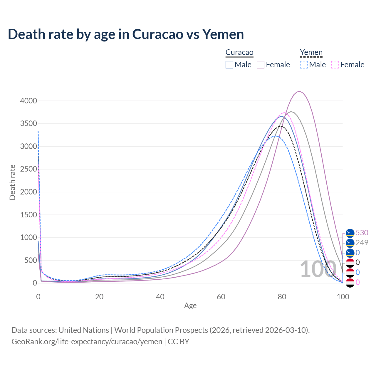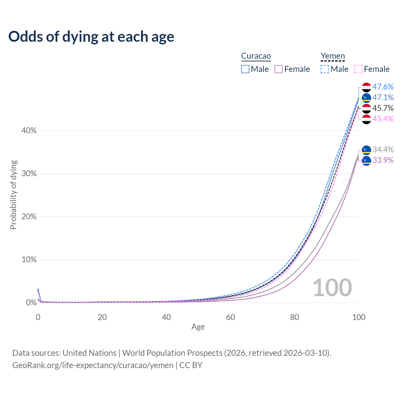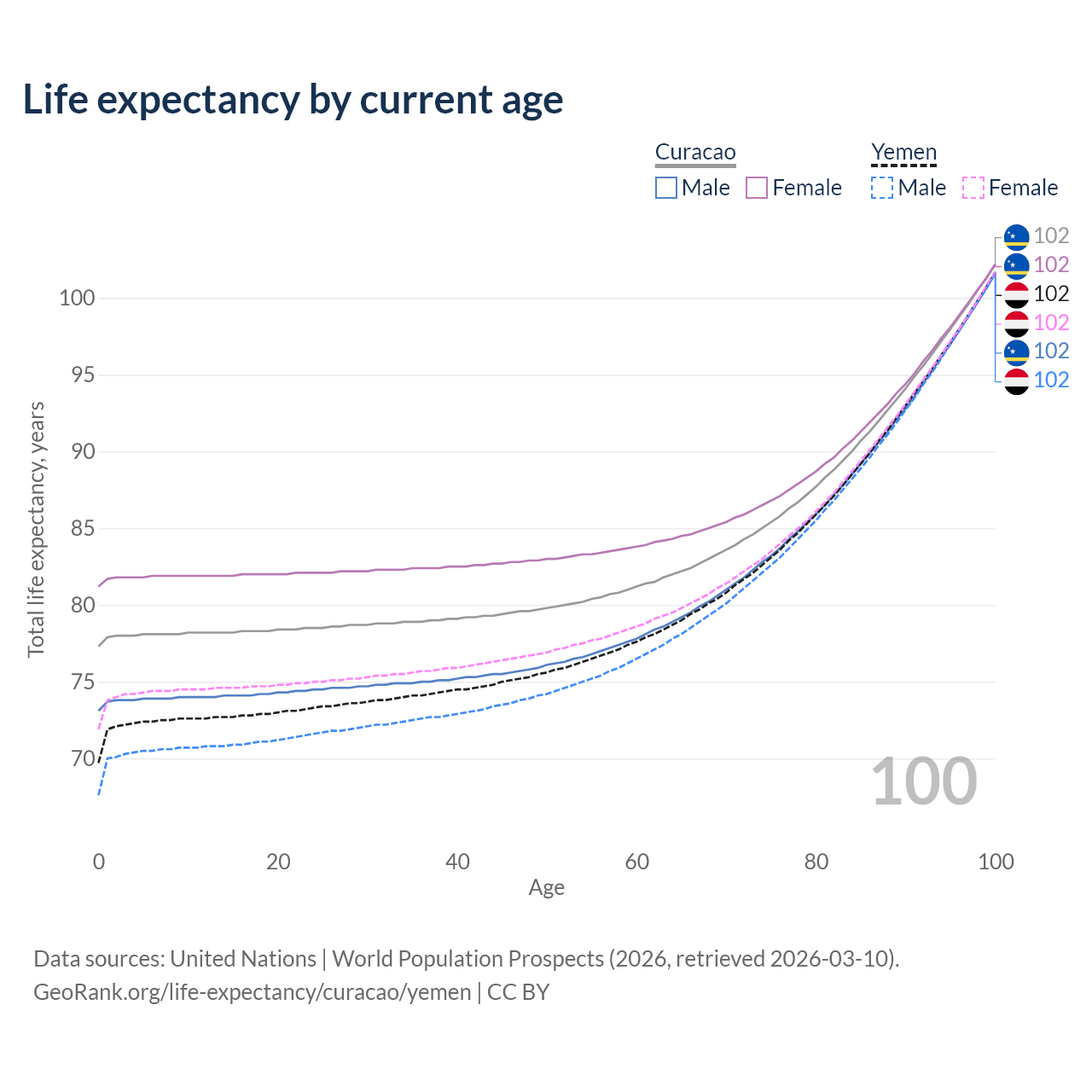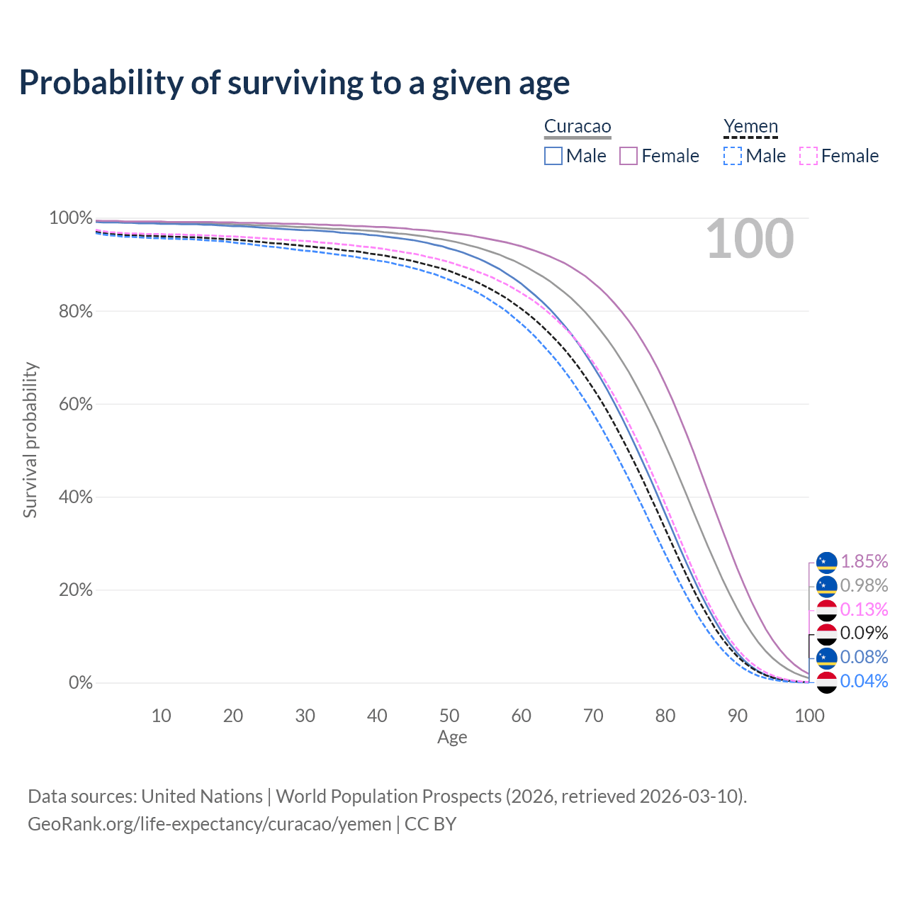 This life expectancy calculator shows the odds of living to 100, 95, 90, and below based on current age for both males and females in Curacao and Yemen, along with mean and median age of death. The calculations are based on the 2026 life tables (actuarial tables) from the UN World Population Prospects.