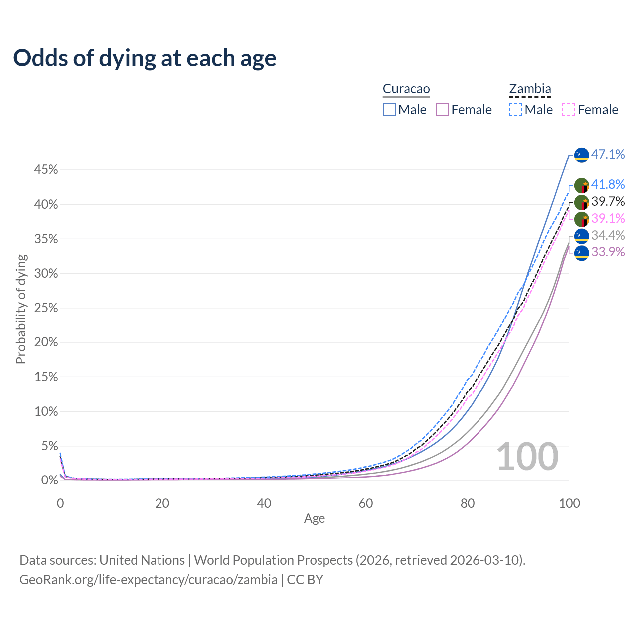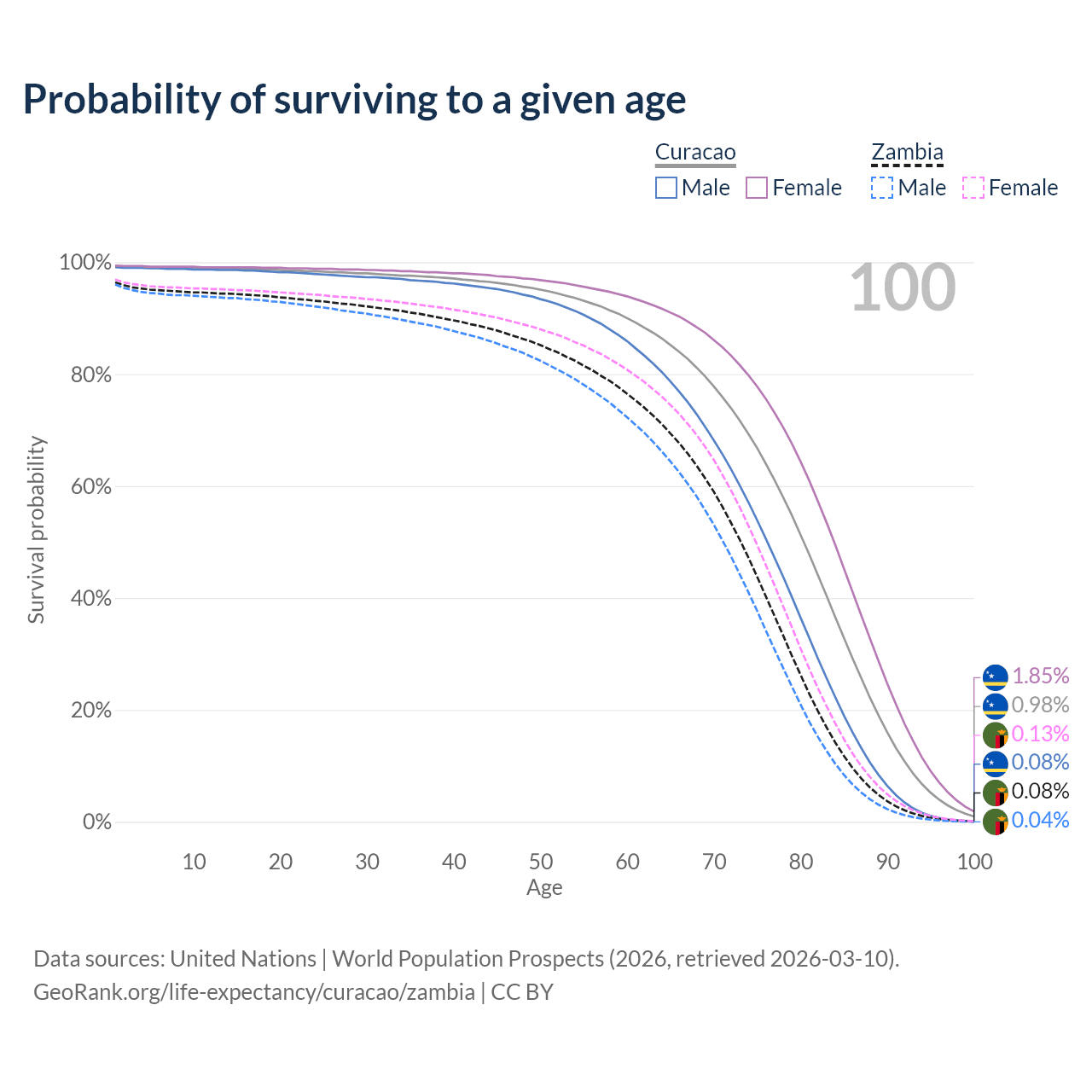 This life expectancy calculator shows the odds of living to 100, 95, 90, and below based on current age for both males and females in Curacao and Zambia, along with mean and median age of death. The calculations are based on the 2026 life tables (actuarial tables) from the UN World Population Prospects.