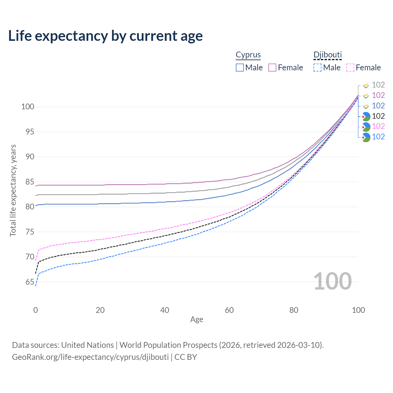 This life expectancy calculator shows the odds of living to 100, 95, 90, and below based on current age for both males and females in Cyprus and Djibouti, along with mean and median age of death. The calculations are based on the 2026 life tables (actuarial tables) from the UN World Population Prospects.
