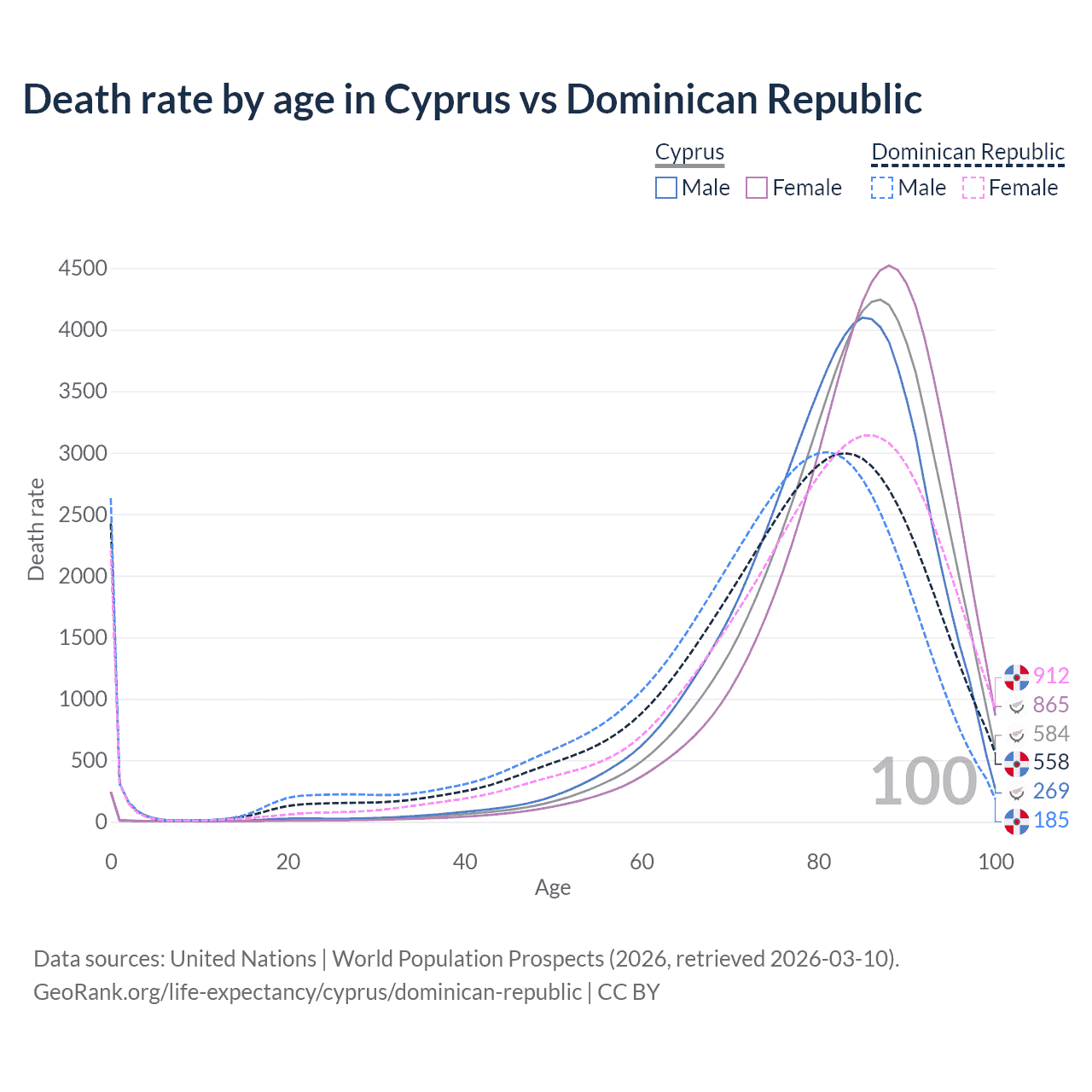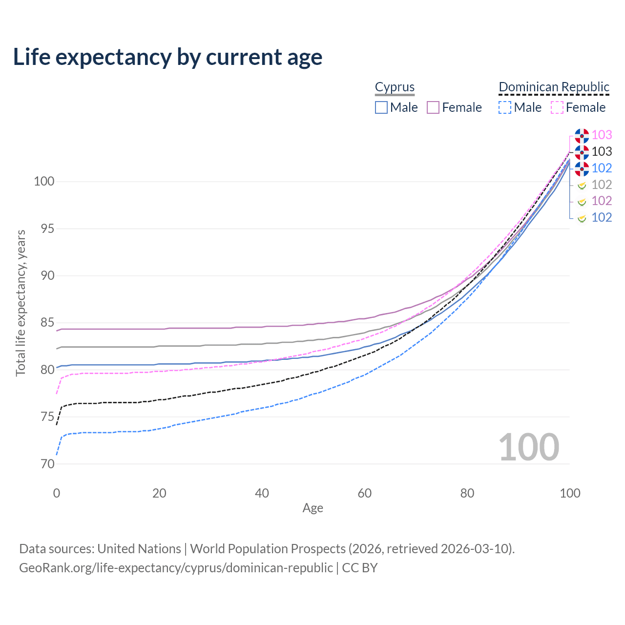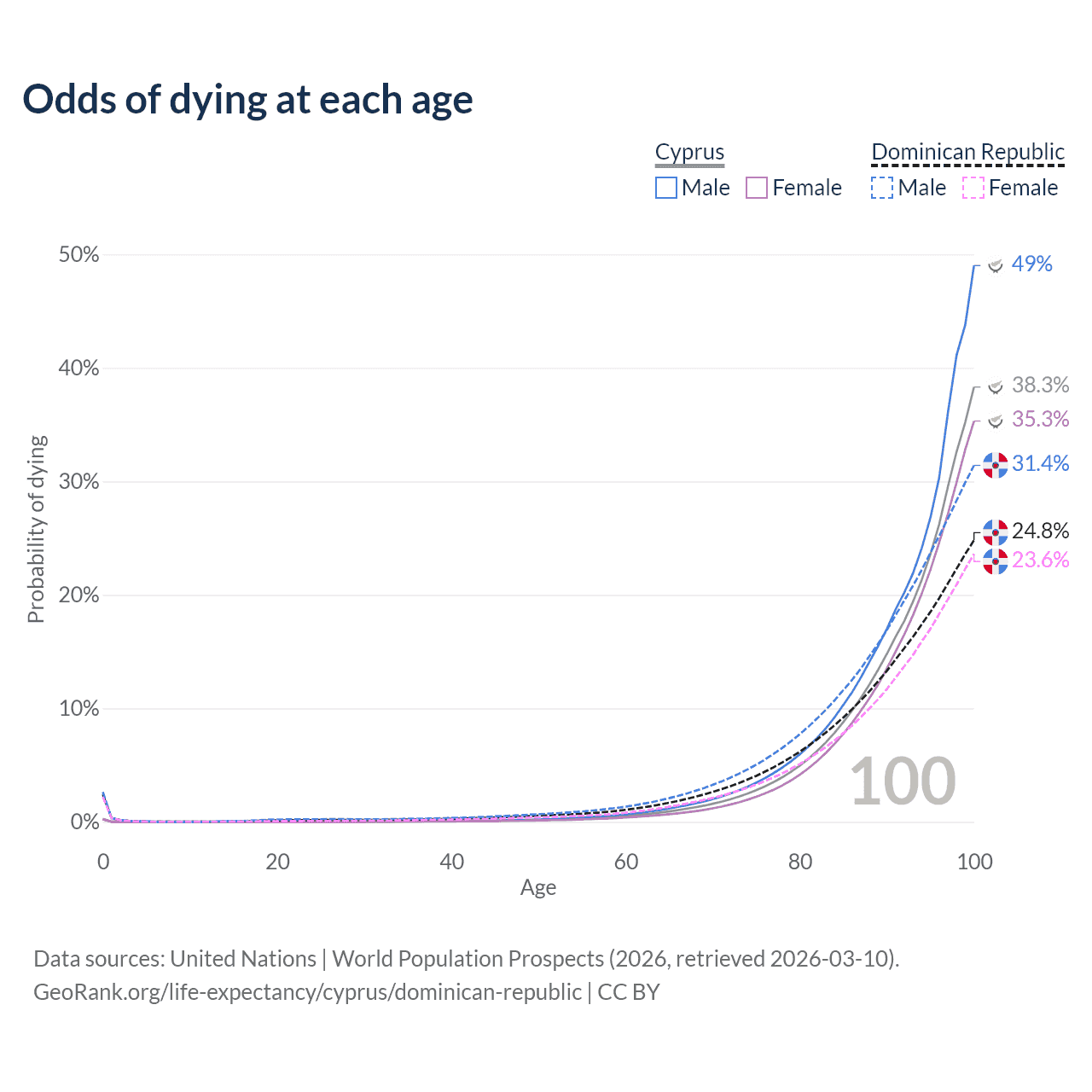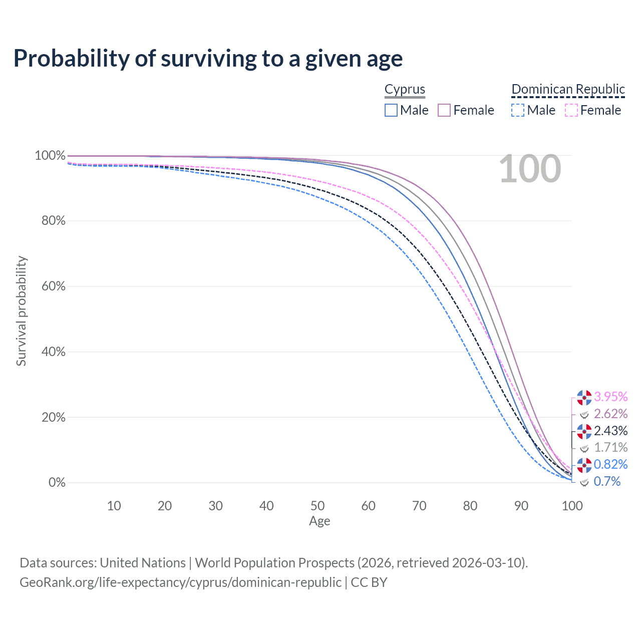 This life expectancy calculator shows the odds of living to 100, 95, 90, and below based on current age for both males and females in Cyprus and the Dominican Republic, along with mean and median age of death. The calculations are based on the 2026 life tables (actuarial tables) from the UN World Population Prospects.
