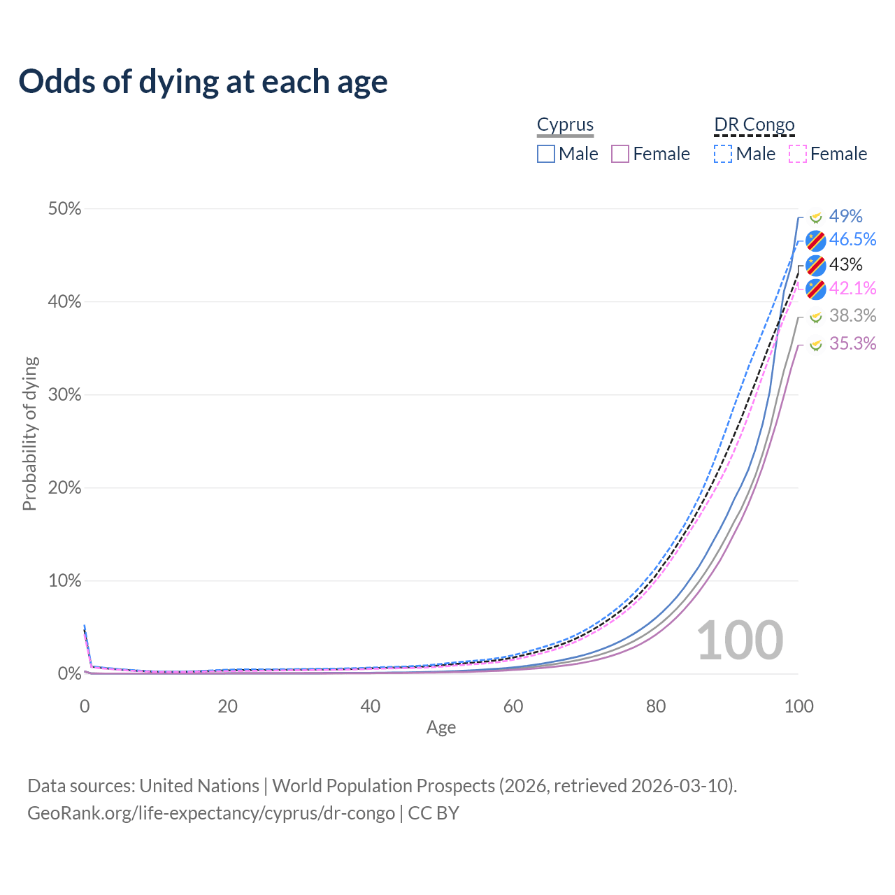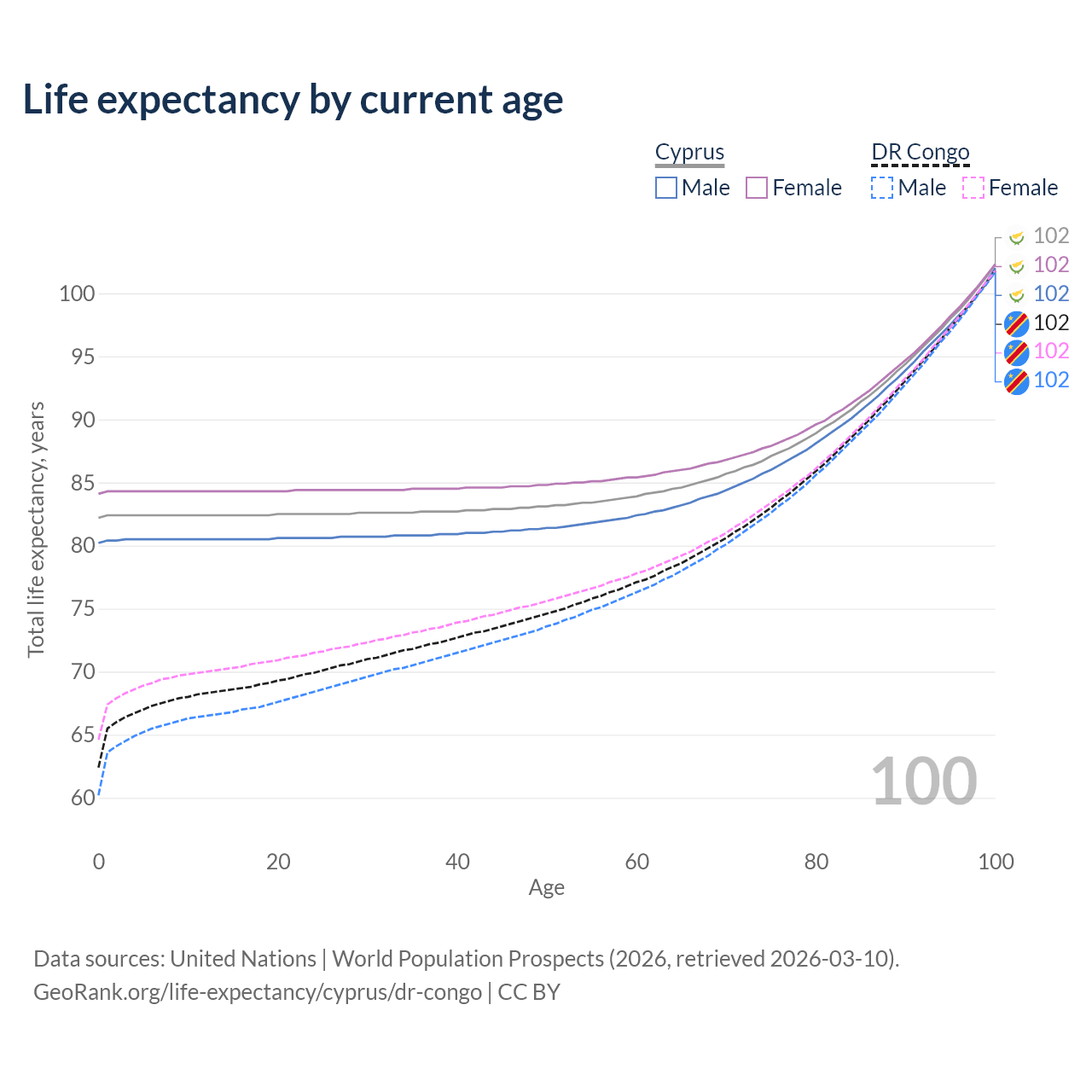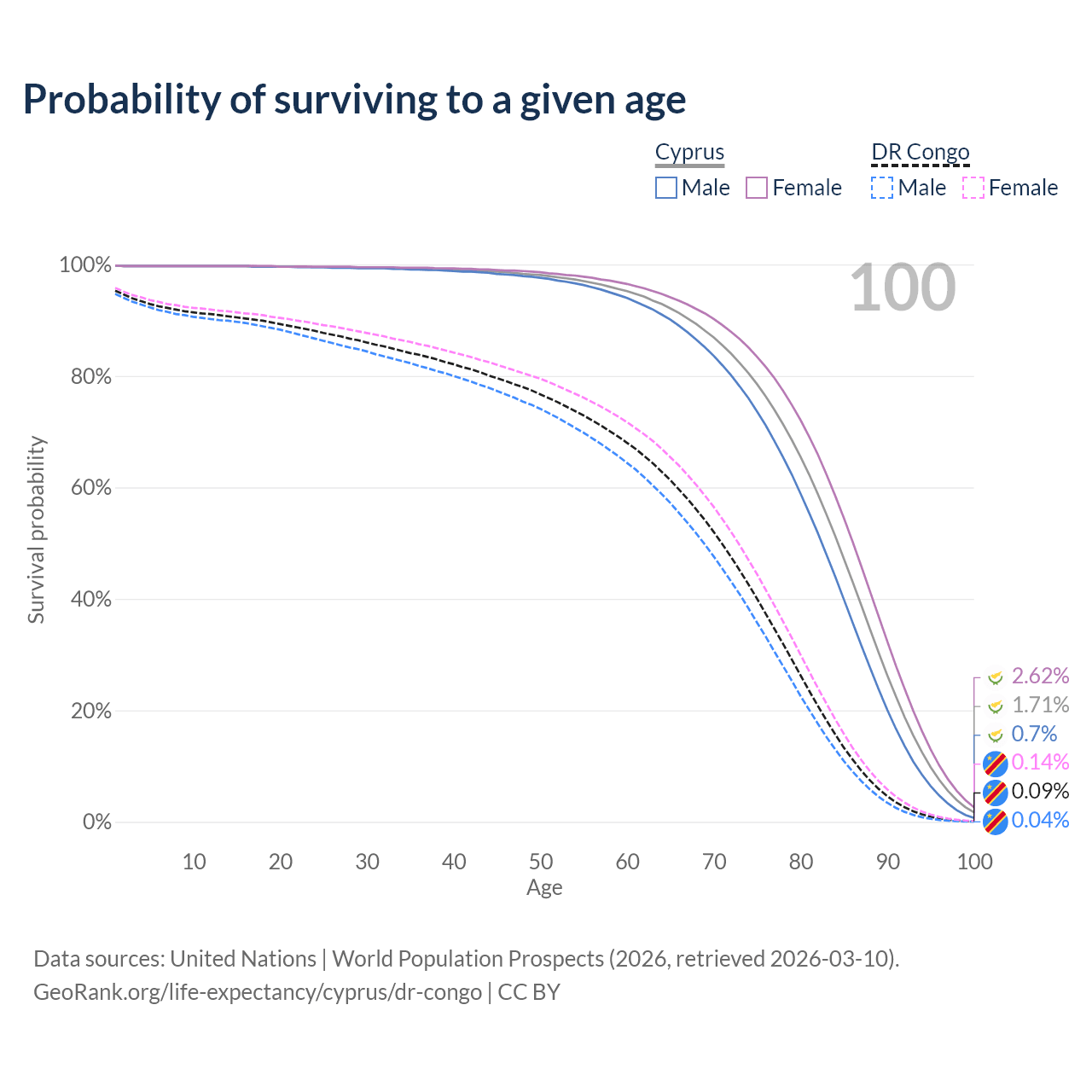 This life expectancy calculator shows the odds of living to 100, 95, 90, and below based on current age for both males and females in Cyprus and the DR Congo, along with mean and median age of death. The calculations are based on the 2026 life tables (actuarial tables) from the UN World Population Prospects.
